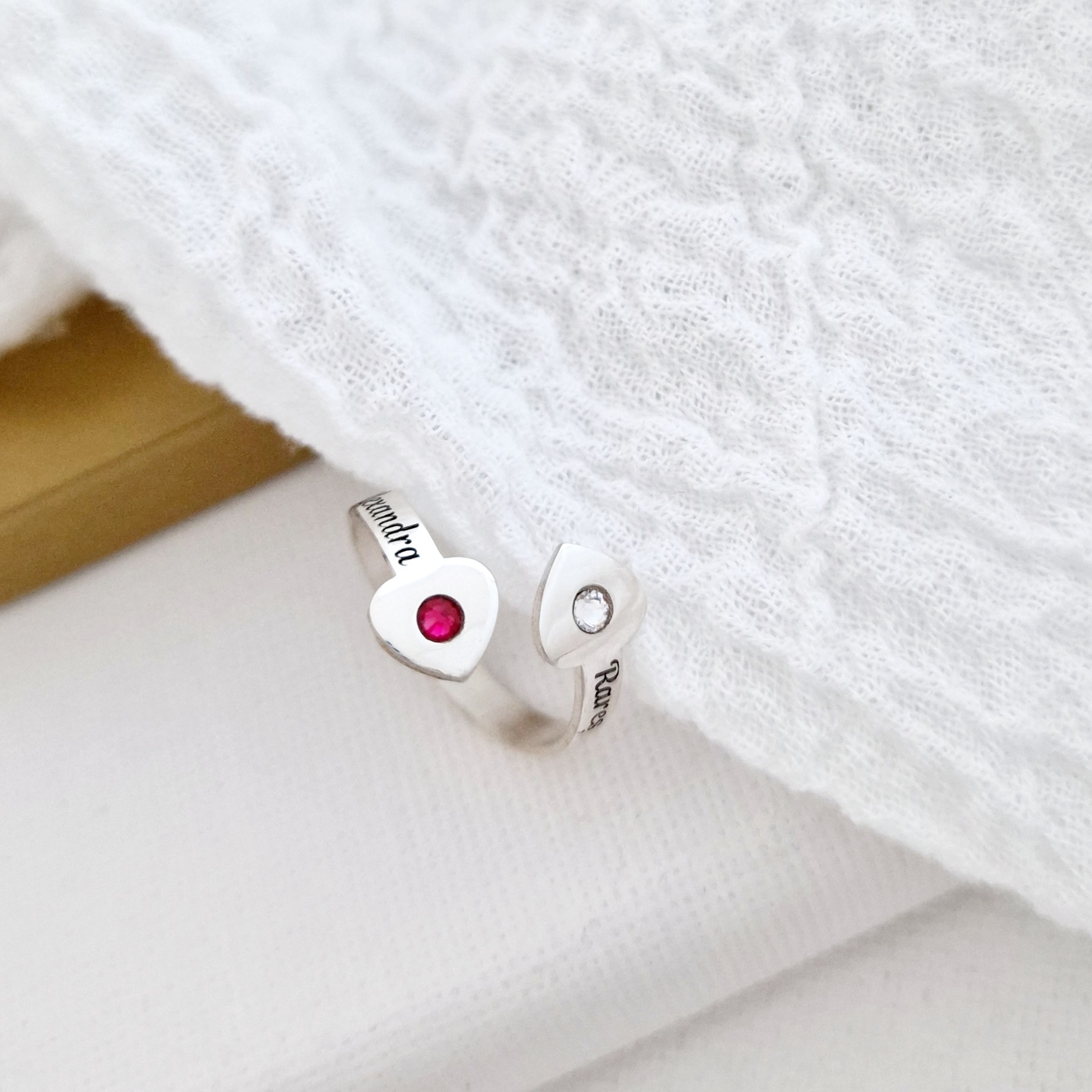 Un inel special, creat din Argint 925, care poate fi personalizat cu doua nume la alegere sau doua cuvinte semnificative. Bijuteria poate fi placata cu Aur de 18k galben sau roz. Aspectul aparte al inelului este dat de cele doua inimi unite pe care este atasat cate un cristal Swarovski. Acestea pot fi alese in functie de preferinta sau chiar cristalul lunii semnificative zilei de nastere - vezi poza explicativa.
