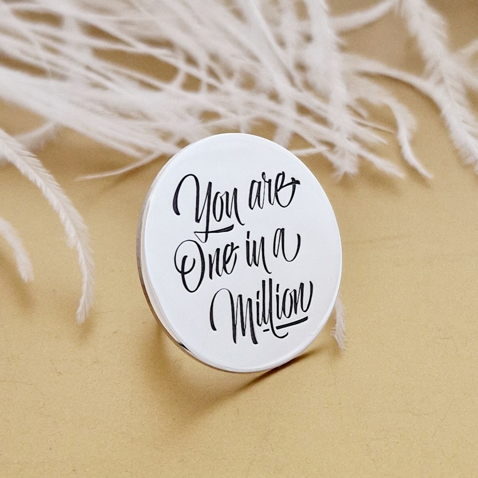 Acest inel este un o bijuterie supradimensionata cu multa personalitate. O piesa indrazneata ce poate fi personalizata cu mesajul de dragoste "You're one in a million". Cand gasesti dragostea adevarata, gasesti acea persoana speciala alaturi de care poti fi tu insuti.