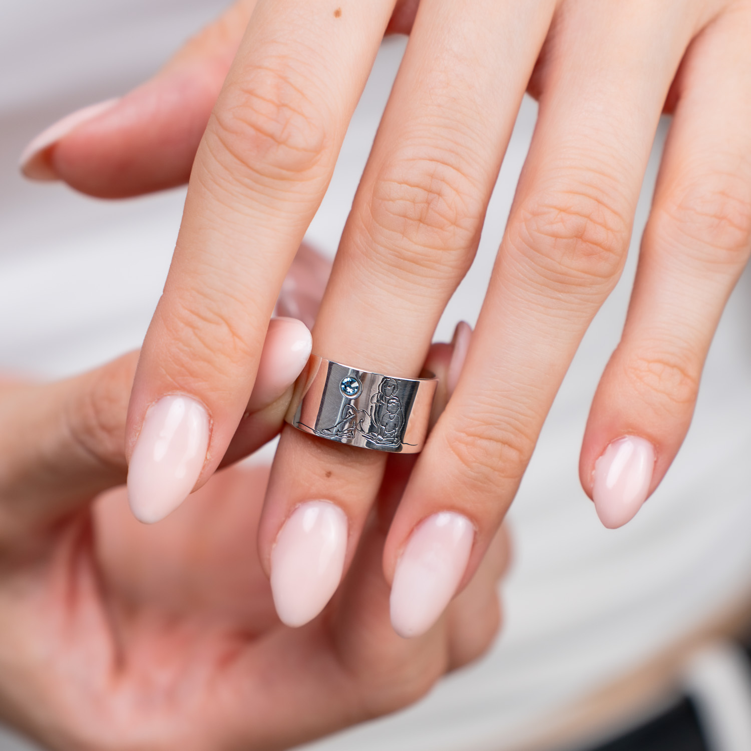 Inelul este creat din Argint 925, iar alaturi de gravura reprezentativa a unei mame impreuna cu fiul ei este atasat un cristal Swarovski. Acestea poate fi ales in functie de preferinta sau chiar cristalul luni semnificative zilei de nastere - vezi poza explicativa. Bijuteria poate fi placata cu Aur de 18k galben sau roz.