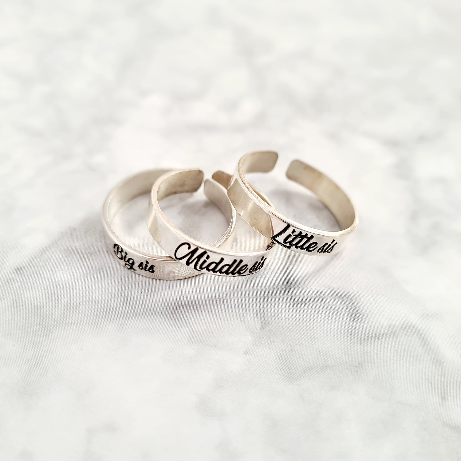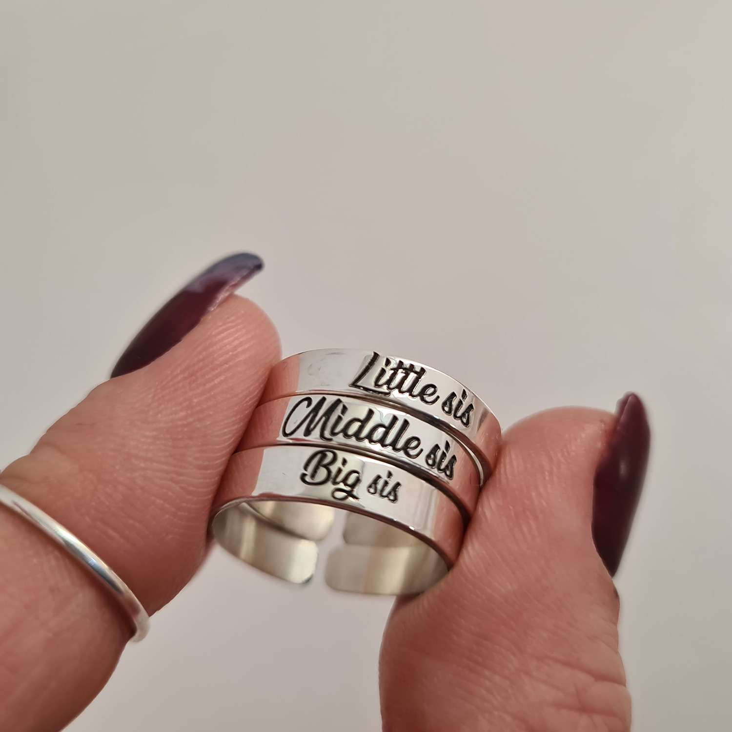 Surorile au o legatura ca nimeni altcineva. Indiferent daca esti sora mai mare responsabila, sora mijlocie rebela sau sora mica rasfatata, impreuna aveti ceva special. Pentru a sarbatori relatia frumoasa pe care o au surorile am creat un set de 3 inele personalizate cu pozitia fiecarei surori in familie: big sis, middle sis, little sis.