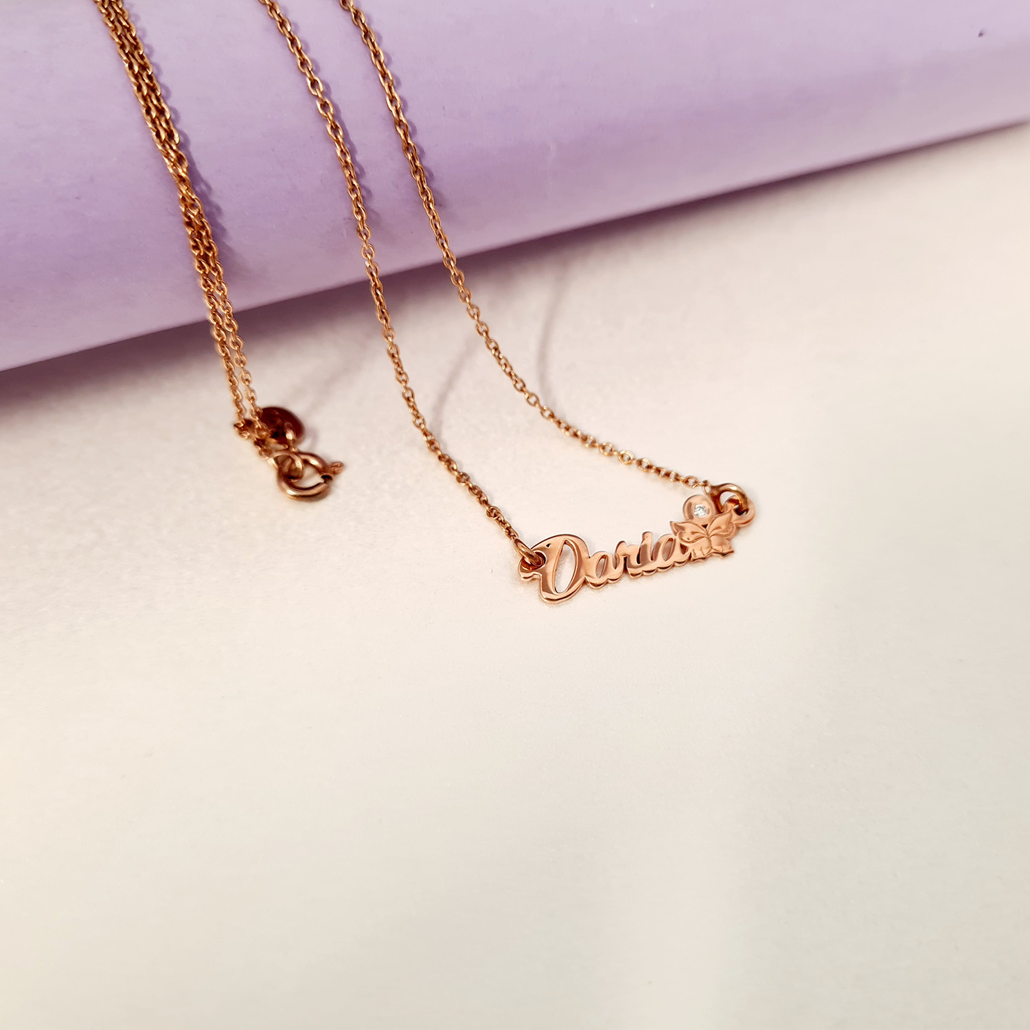 Lantisor personalizat cu Nume, simbol fluture si Diamant natural - Argint 925 placat cu Aur Roz 18K