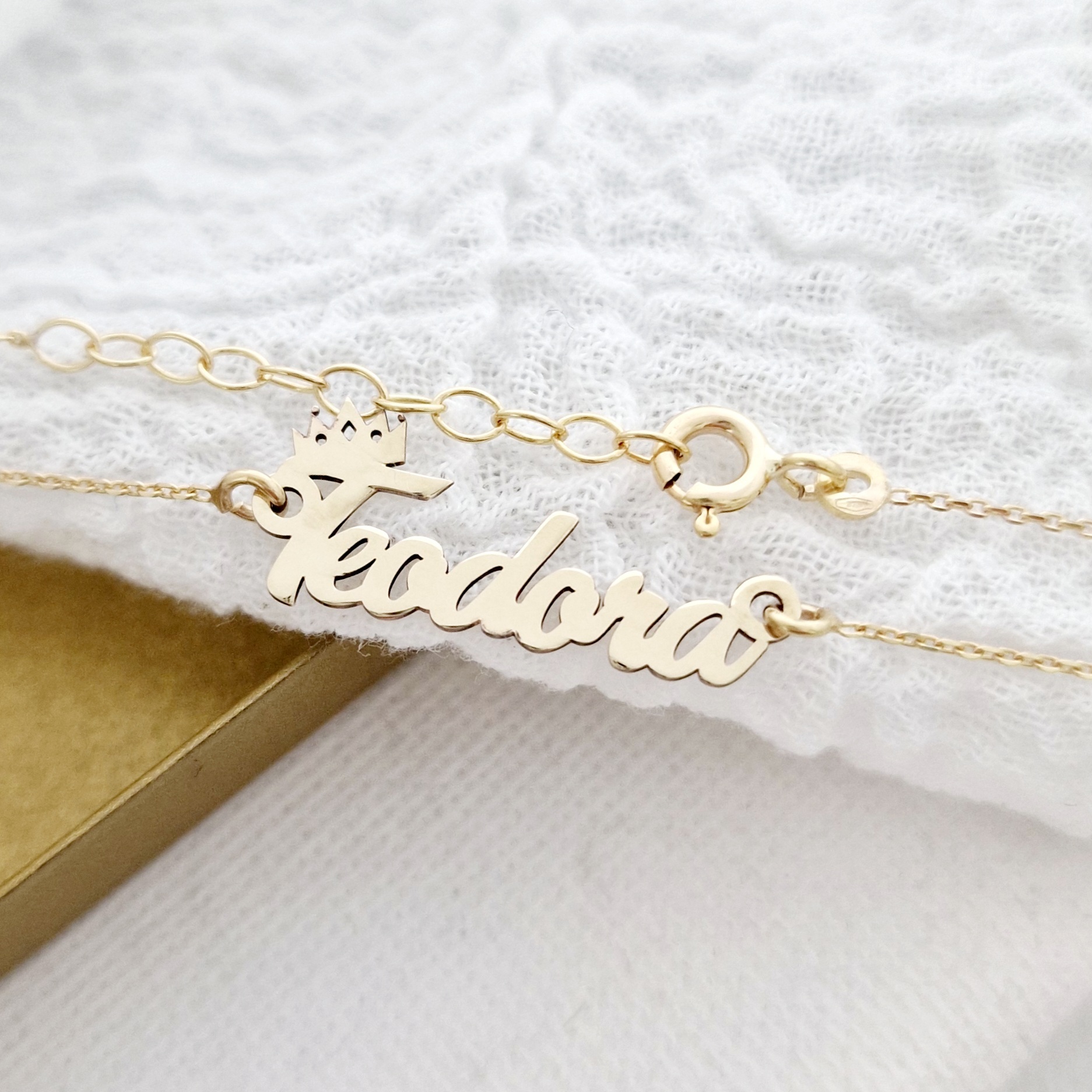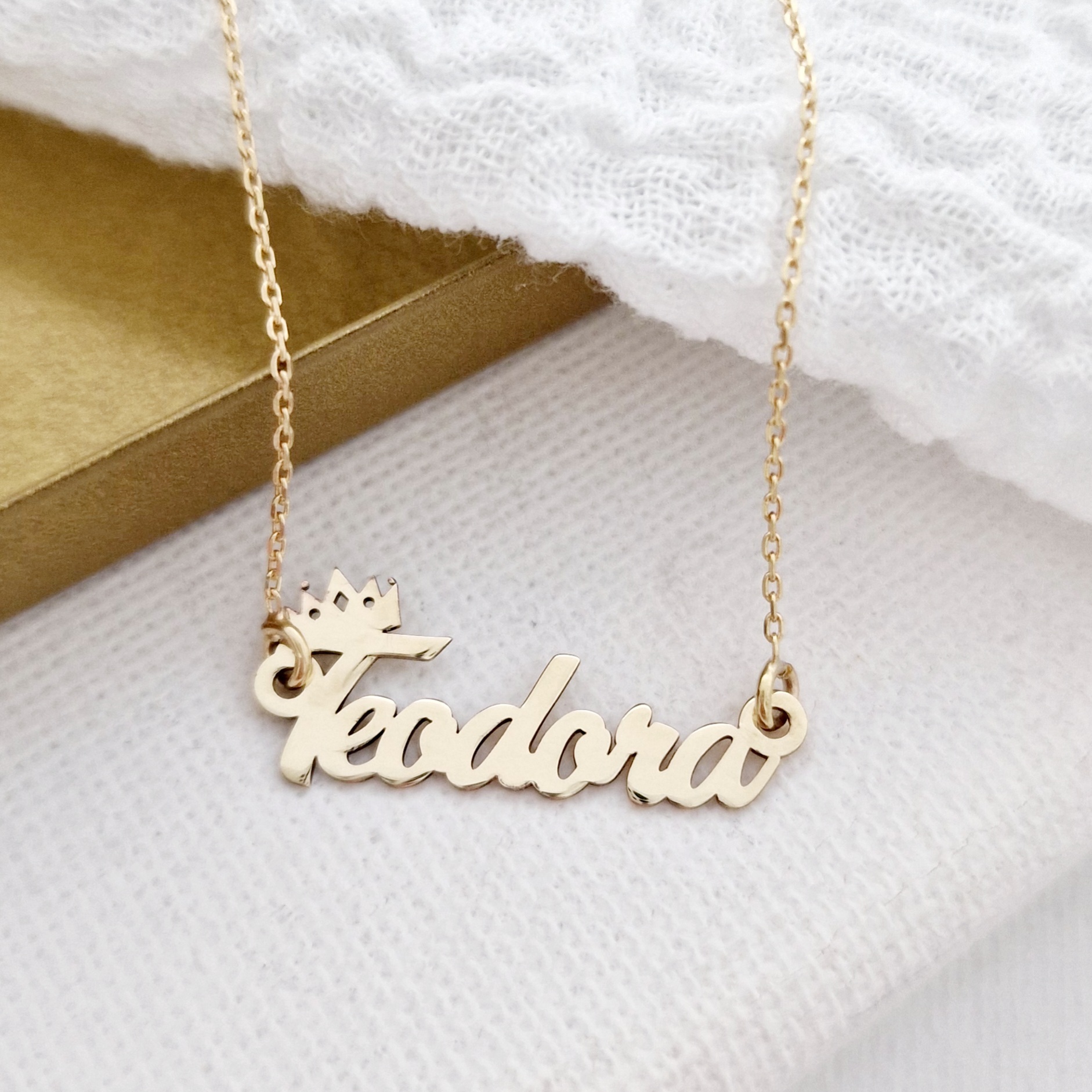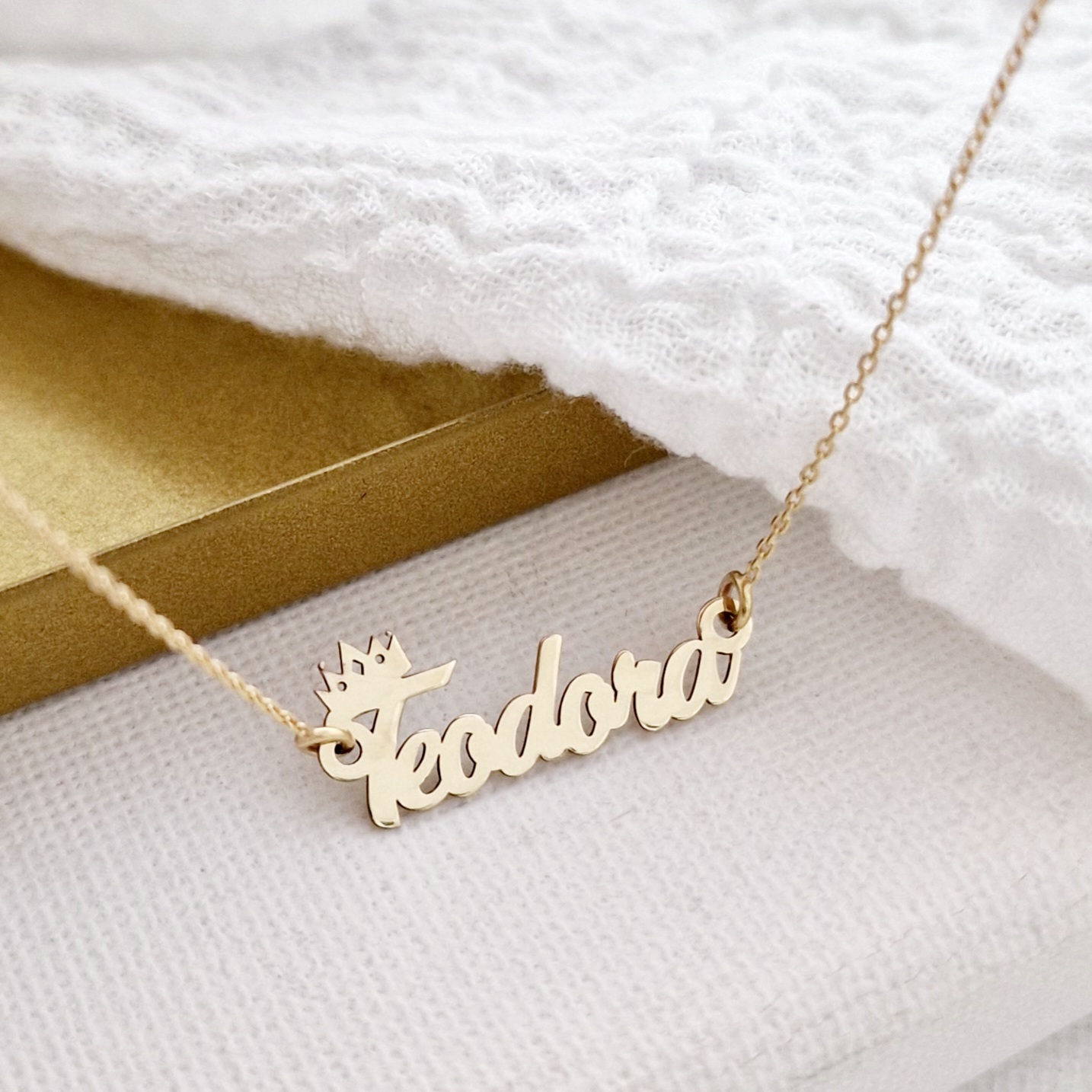 Lantisor personalizat cu nume 7-8 litere si simbol coronita - Font elegant - Aur 9K
