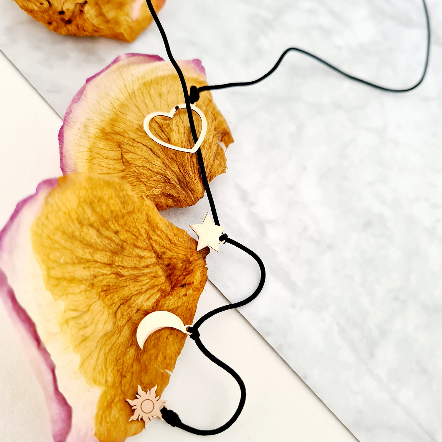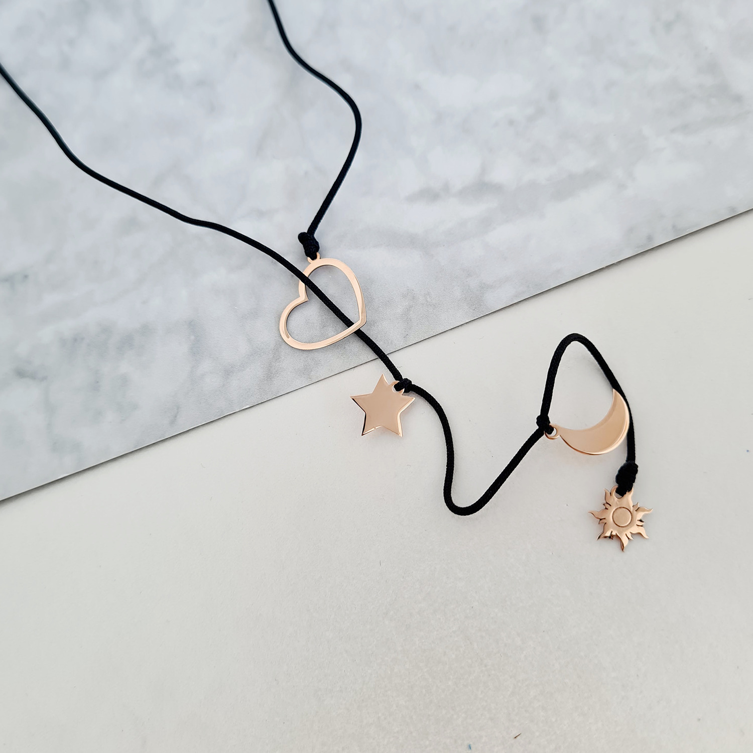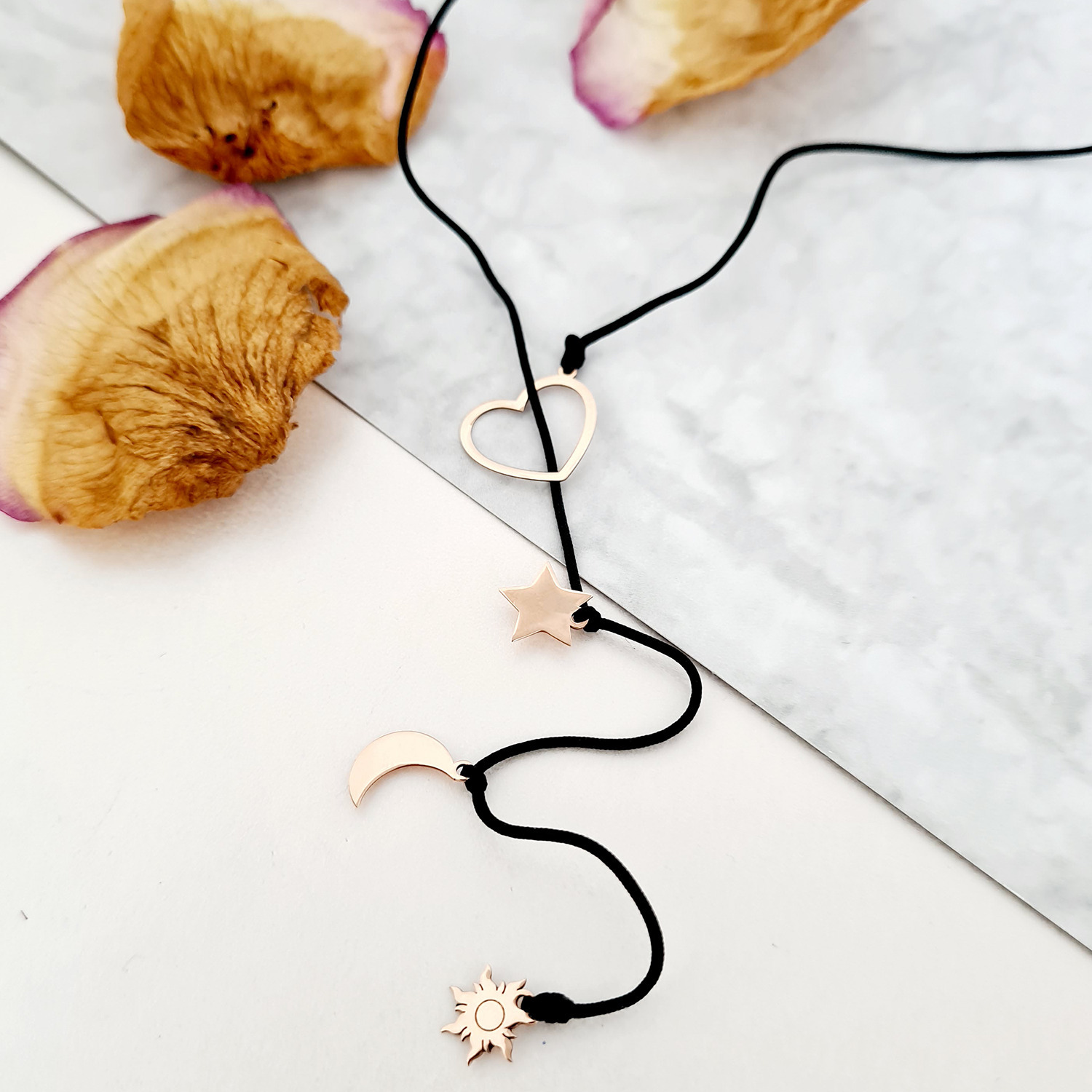Colier lariat Y - 4 pandantive - Inima si 3 piese la alegere - Argint 925 placat cu Aur Roz 18K - snur negru
