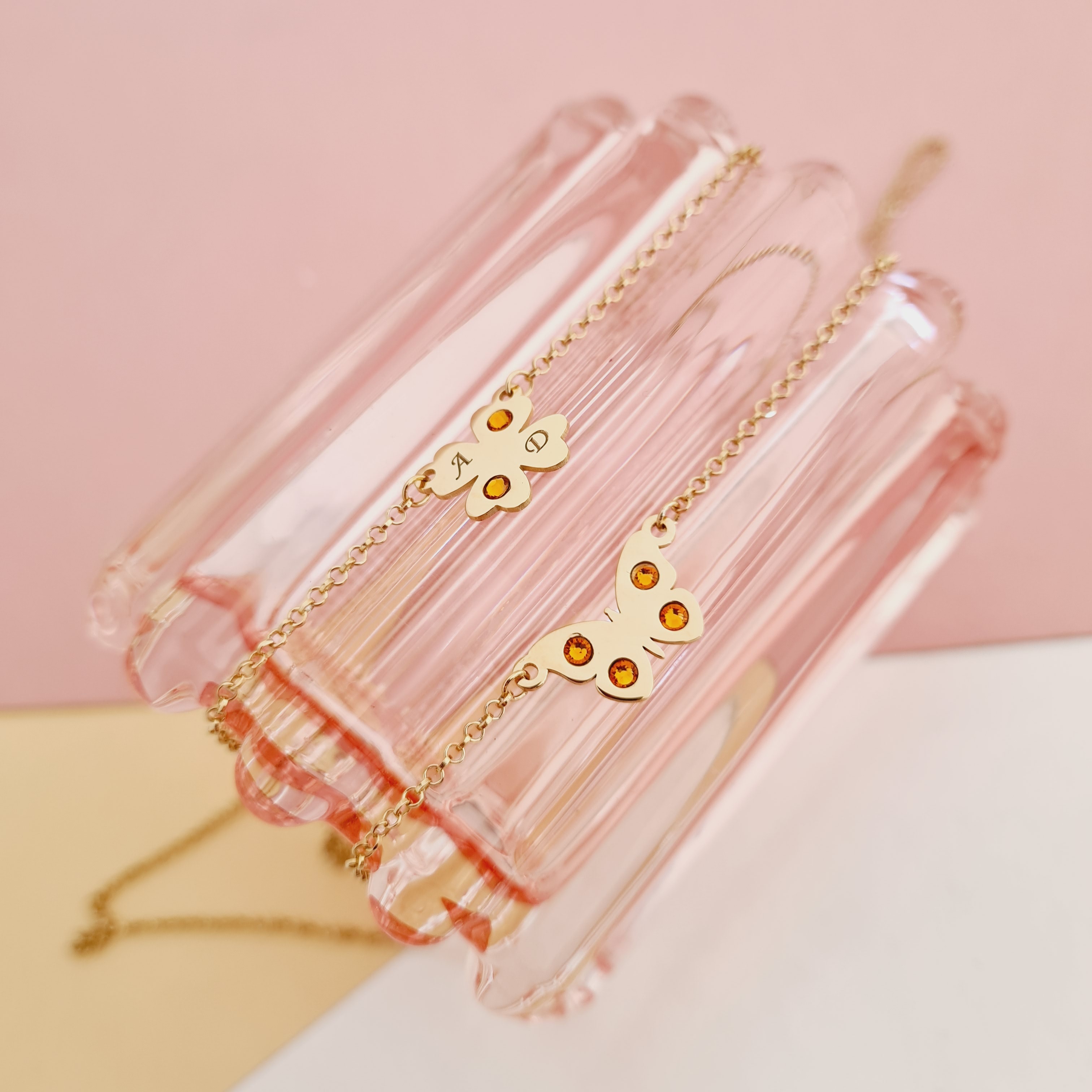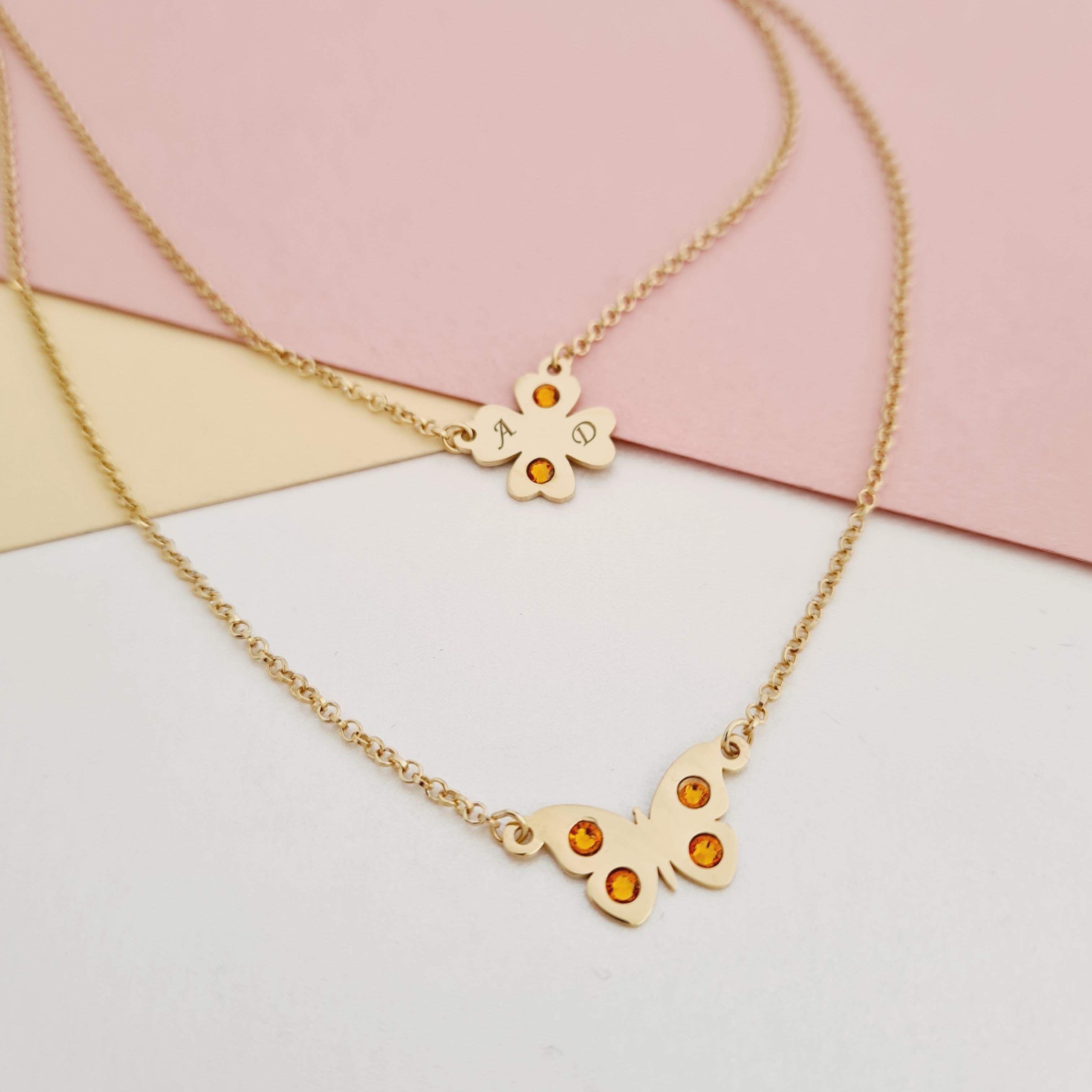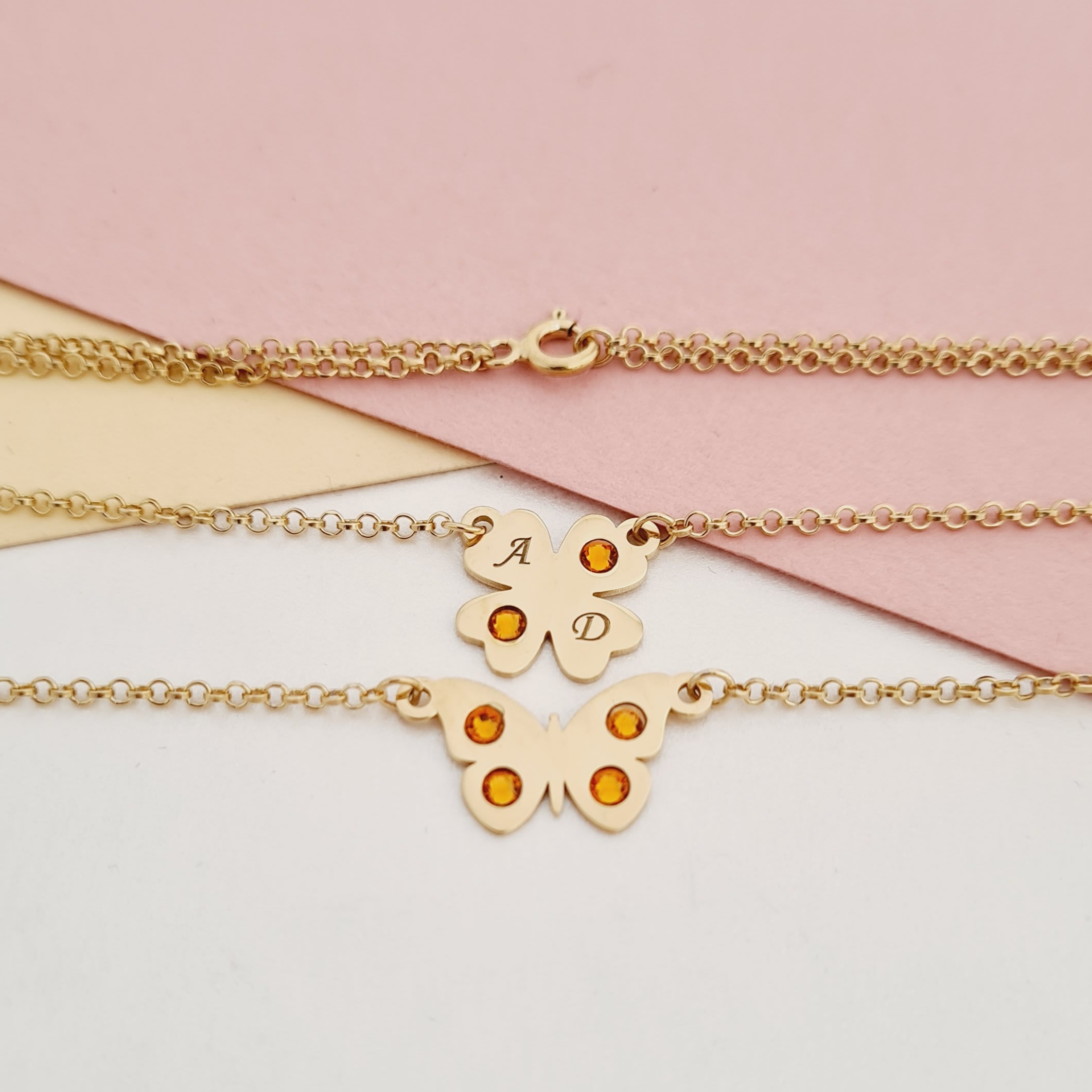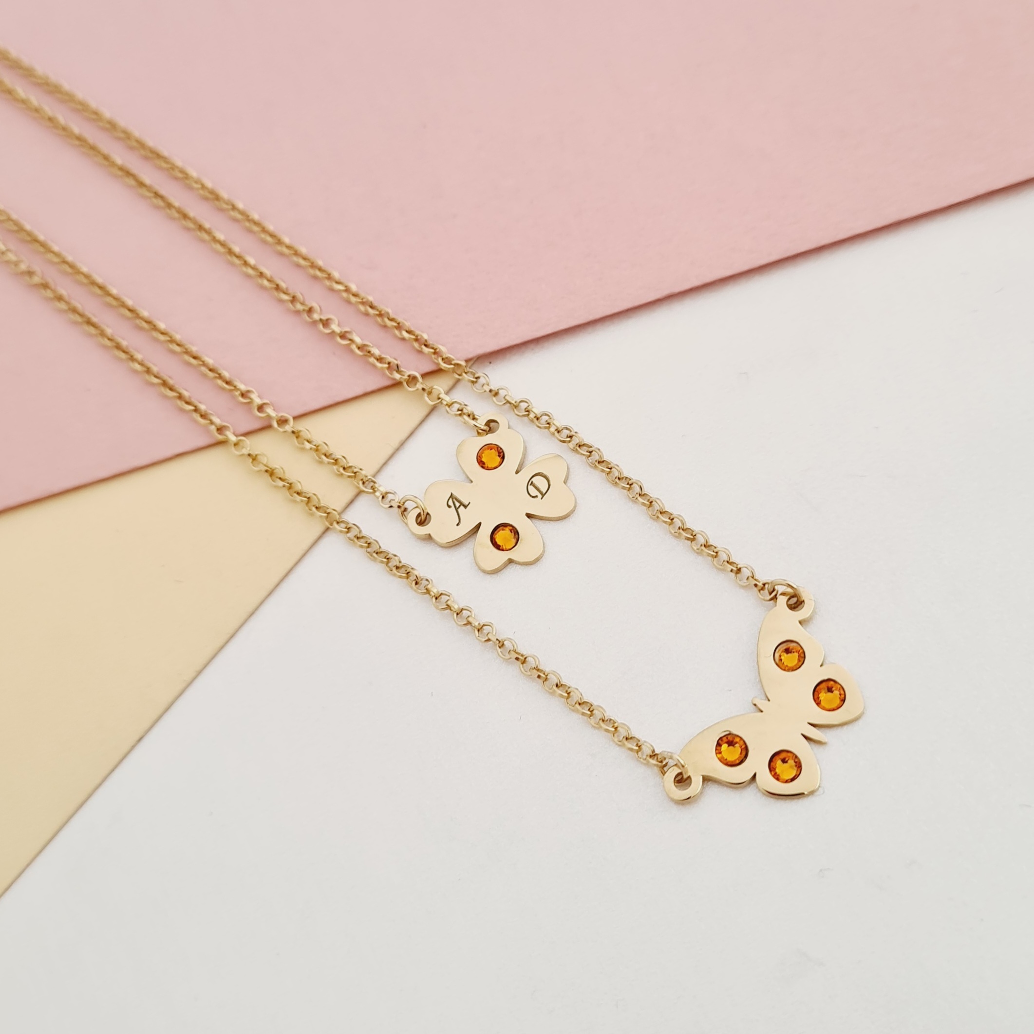 Elementele primaverii vor sta delicat in jurul gatului cu deosebitul colierul cu 2 straturi. Lantisorul din interior are ca si element principal un trifoi personalizat cu 2 initiale si 2 cristale Swarovski, iar cel din exterior un fluture cu cate un cristal pe fiecare aripa.
