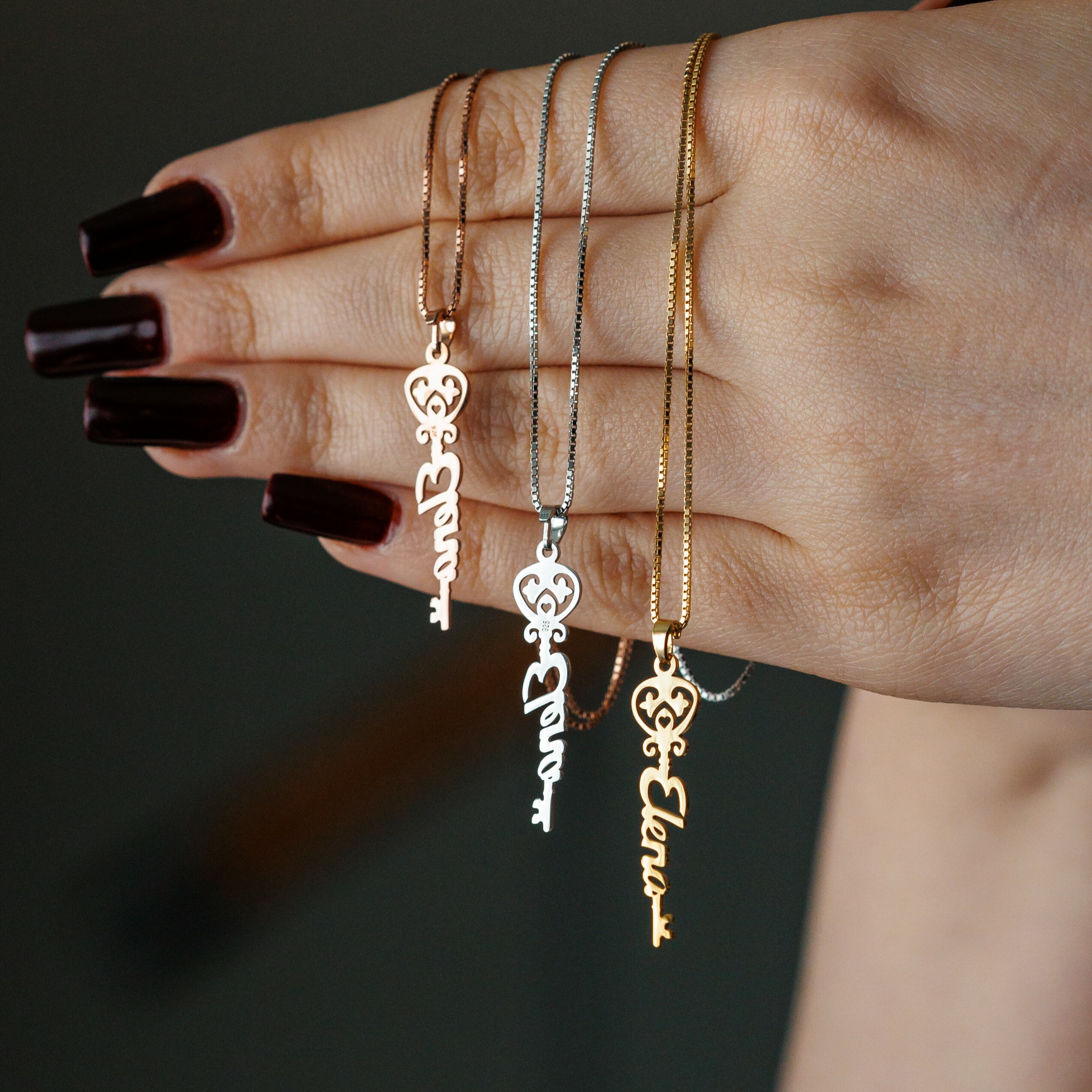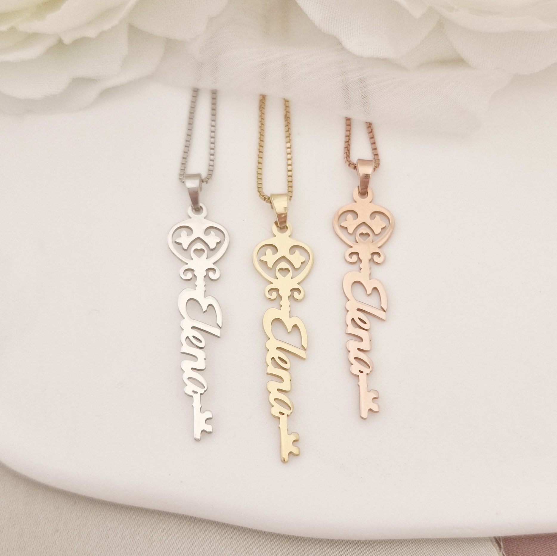 Lantisorul cu nume poate fi realizat din Aur 9K, Aur 14K (galben, alb sau roz) sau din Argint 925, clasic, rodiat sau placat cu Aur 18K (galben sau roz). Fiecare bijuterie este atent finisata manual, astfel incat sa te bucuri de un lantisor cu nume elegant, durabil si potrivit stilului tau personal.