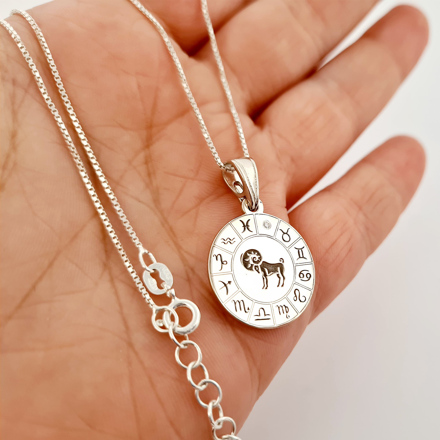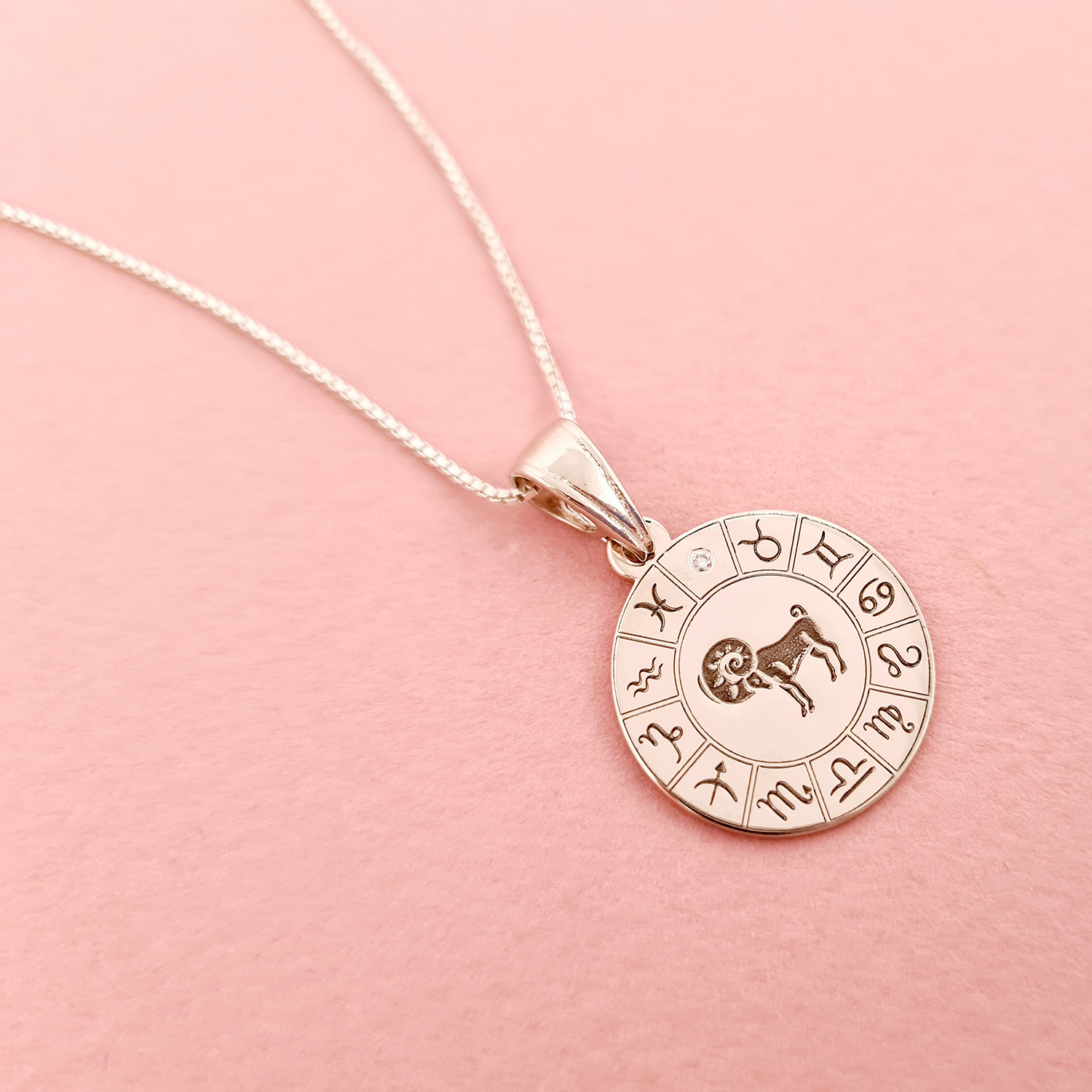 Lantisor personalizat - Roata zodiacala - Pandantiv de 20 mm cu Diamant natural - Argint 925 Rodiat