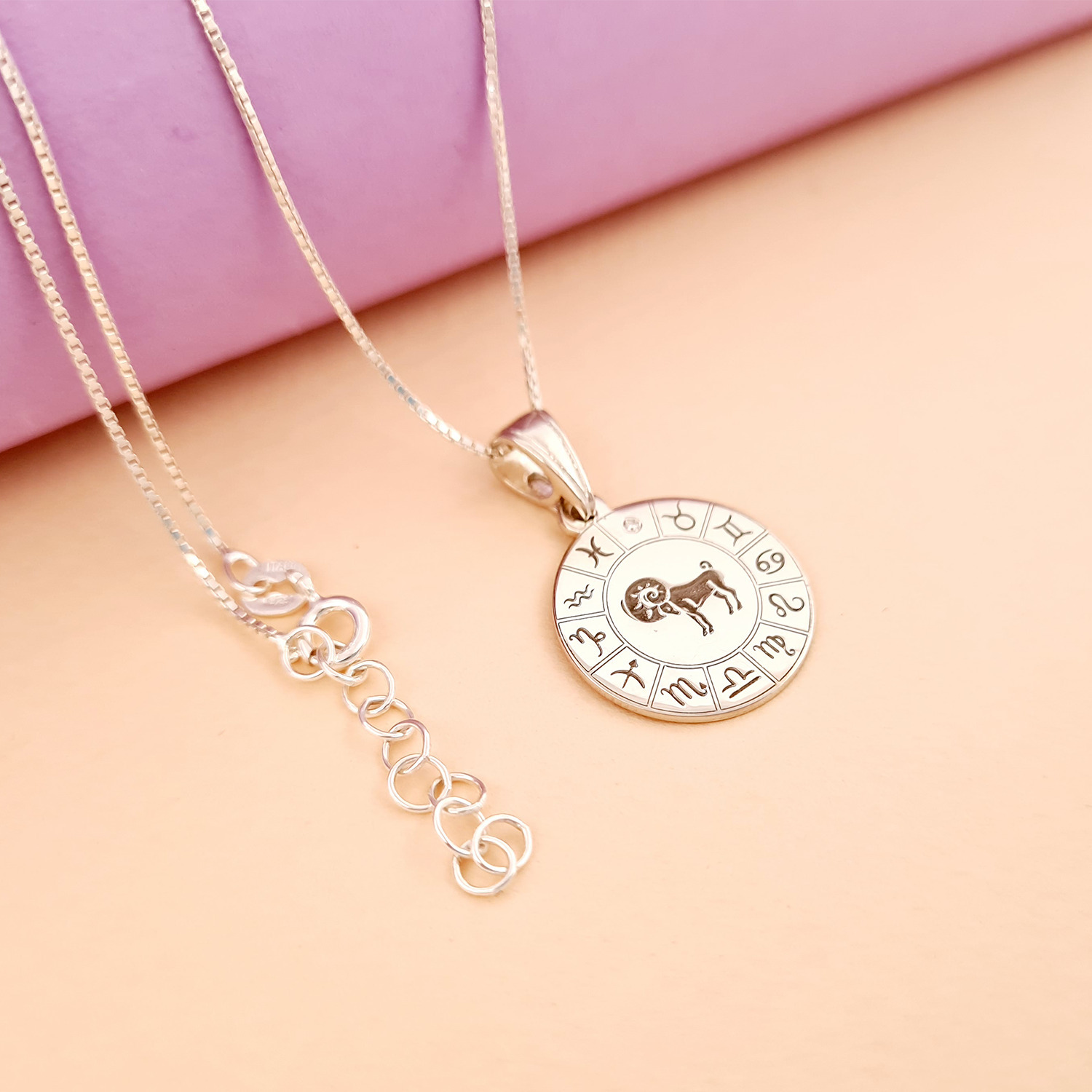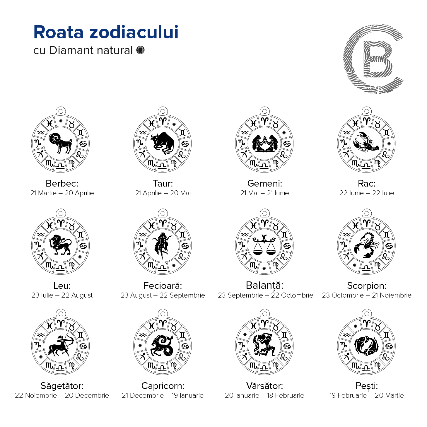 Bijuteria are in centru ei semnul zodiacal ales de tine. Acesta este inconjurat de celelate simboluri zodiacale precum intr-o roata cronologica a zodiacului. Pe roata in punctul unde este locul zodiei princiale este sertizat un Diamant natural stralucitor. Pentru a vizualiza cum va arata pandantivul personalizat cu zodia dorita de tine in selectia de poze se afla o imagine cu simulari explicative.
