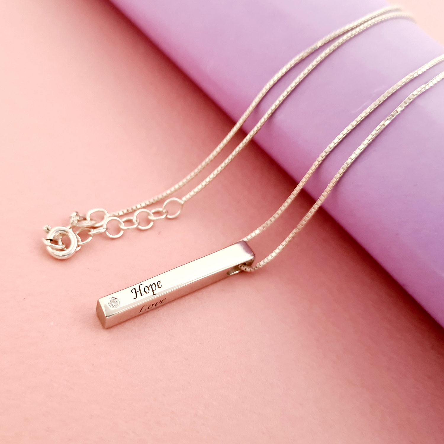 Colierul cu pandantiv bara dreptunghiulara este bijuteria care va lipsea. Personalizati pandantivul bara cu pana la 4 gravuri. Initiale, nume, date, coordonatele geografice si multe altele pot fi imprimate pe fetele dreptunghiului.