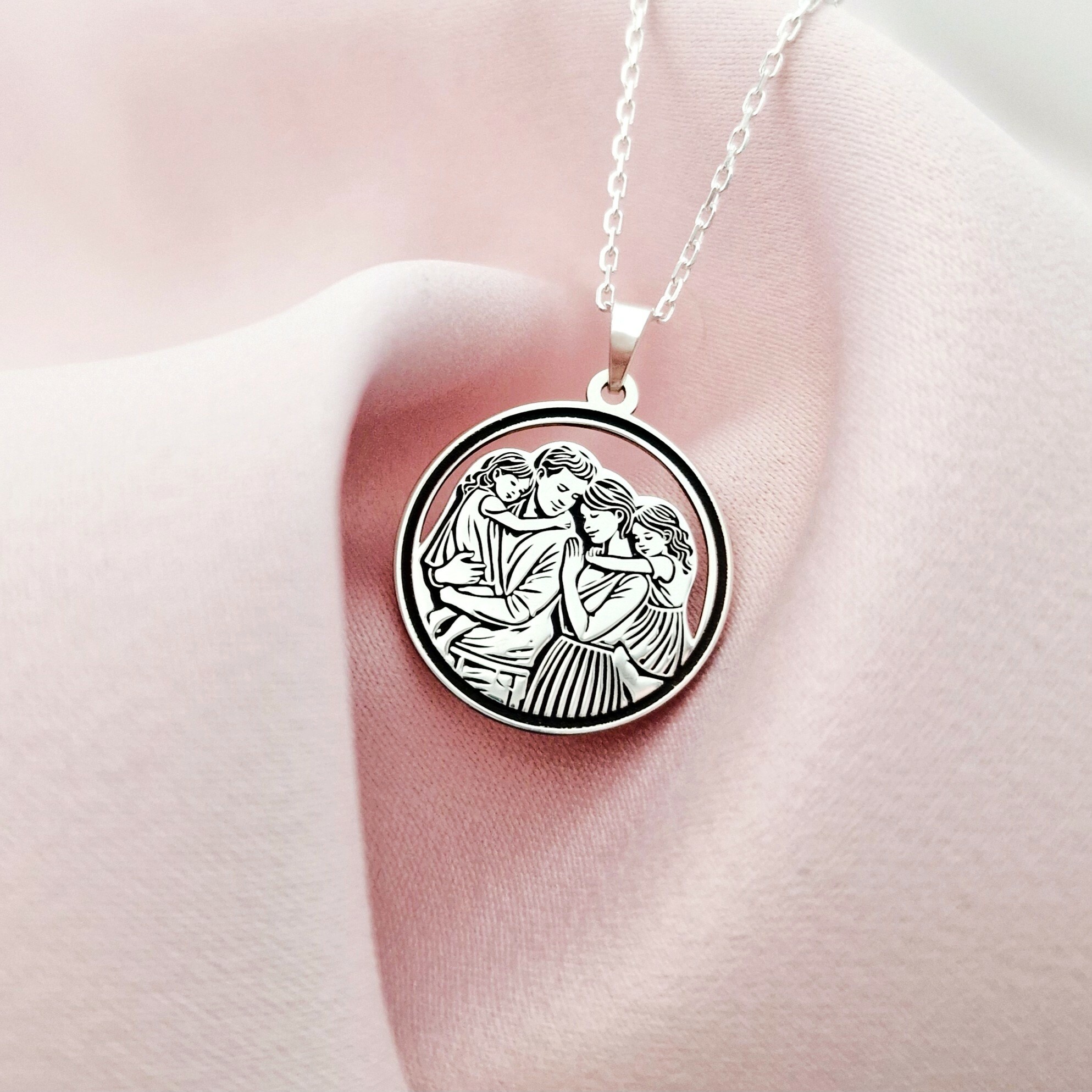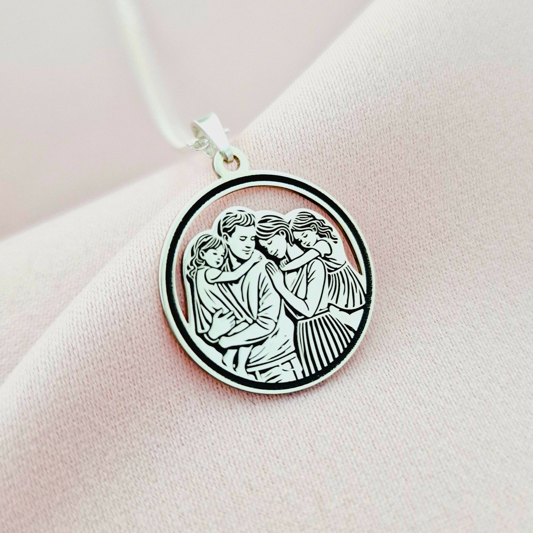 Lantisor cu medalion rotund - Împreună Mereu - tata, mama si doua fete - Argint 925 - Lant forzatina