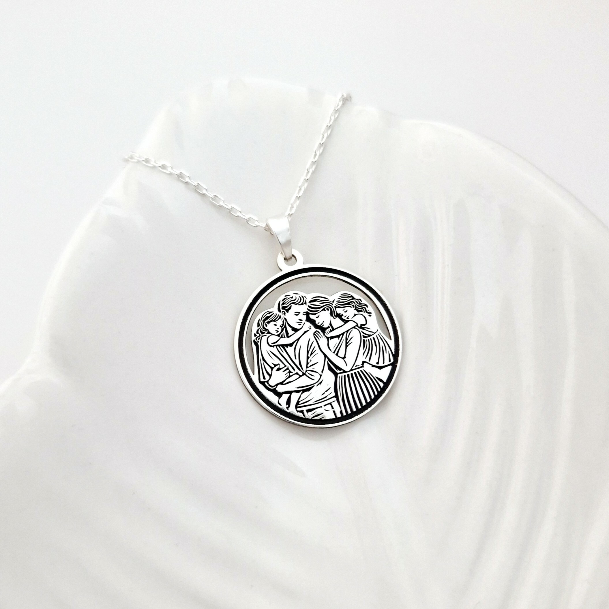 Surprinde frumusețea legăturii familiale cu acest lănțișor elegant din Argint 925. Medalionul rotund gravat cu imaginea unei familii – tata, mama și cele două fete – simbolizează dragostea care leagă inimile pentru totdeauna. Lănțișorul fin tip forzatina adaugă o notă rafinată acestei bijuterii de suflet.