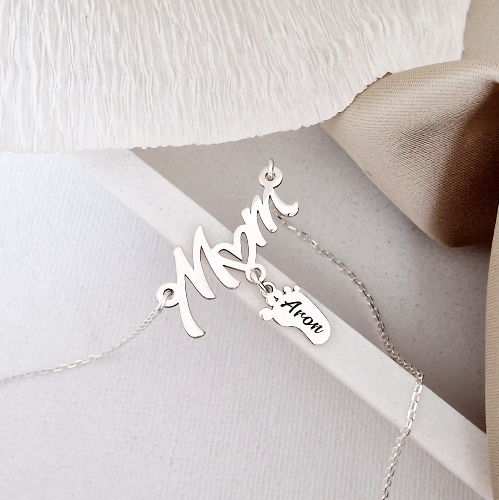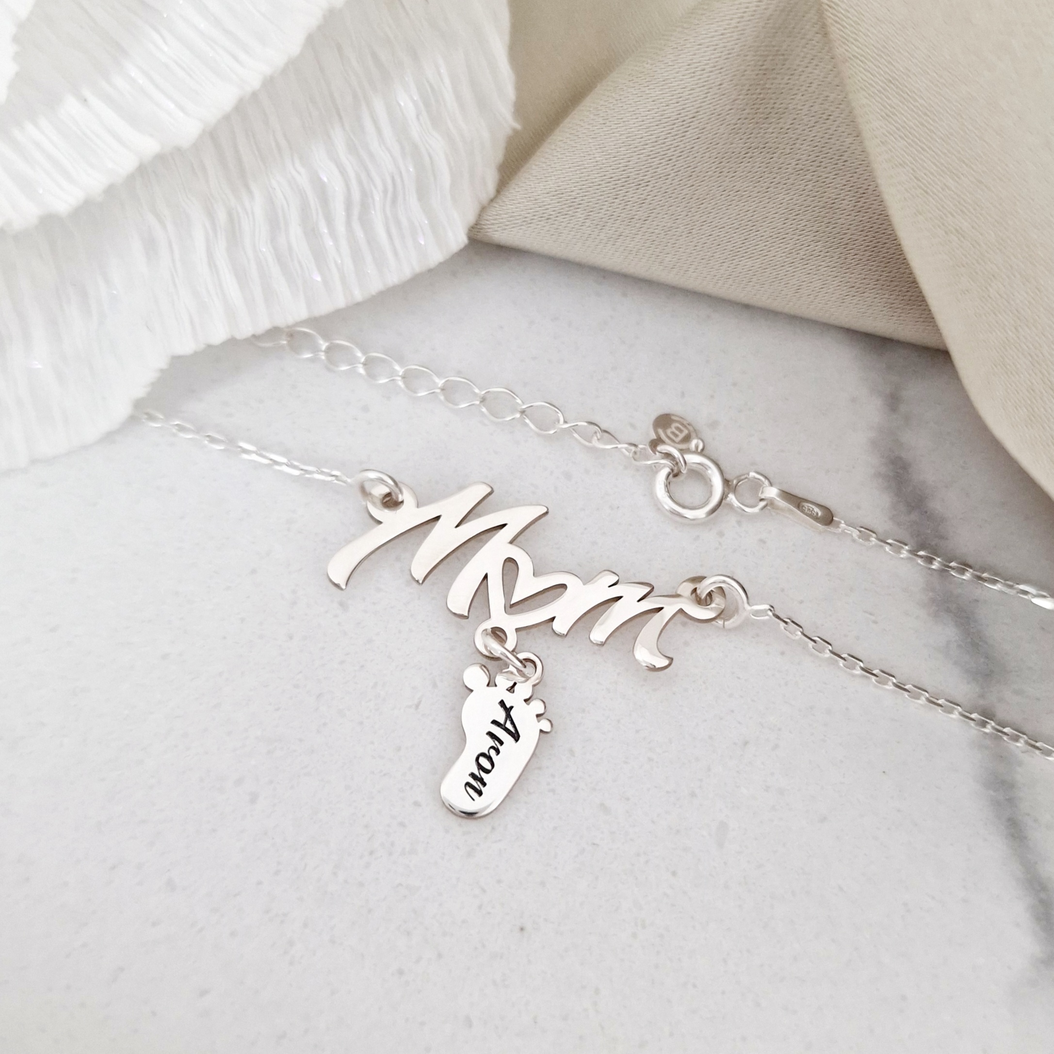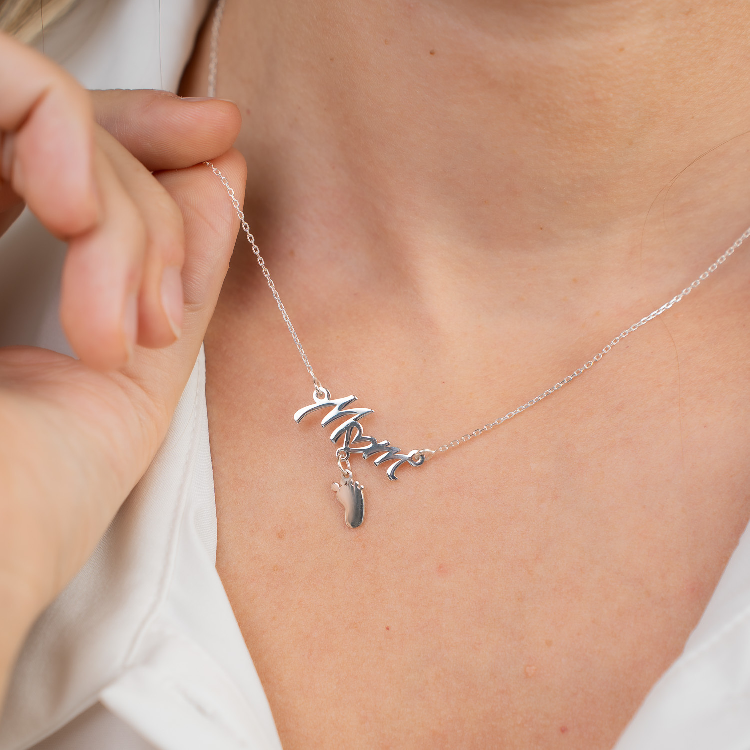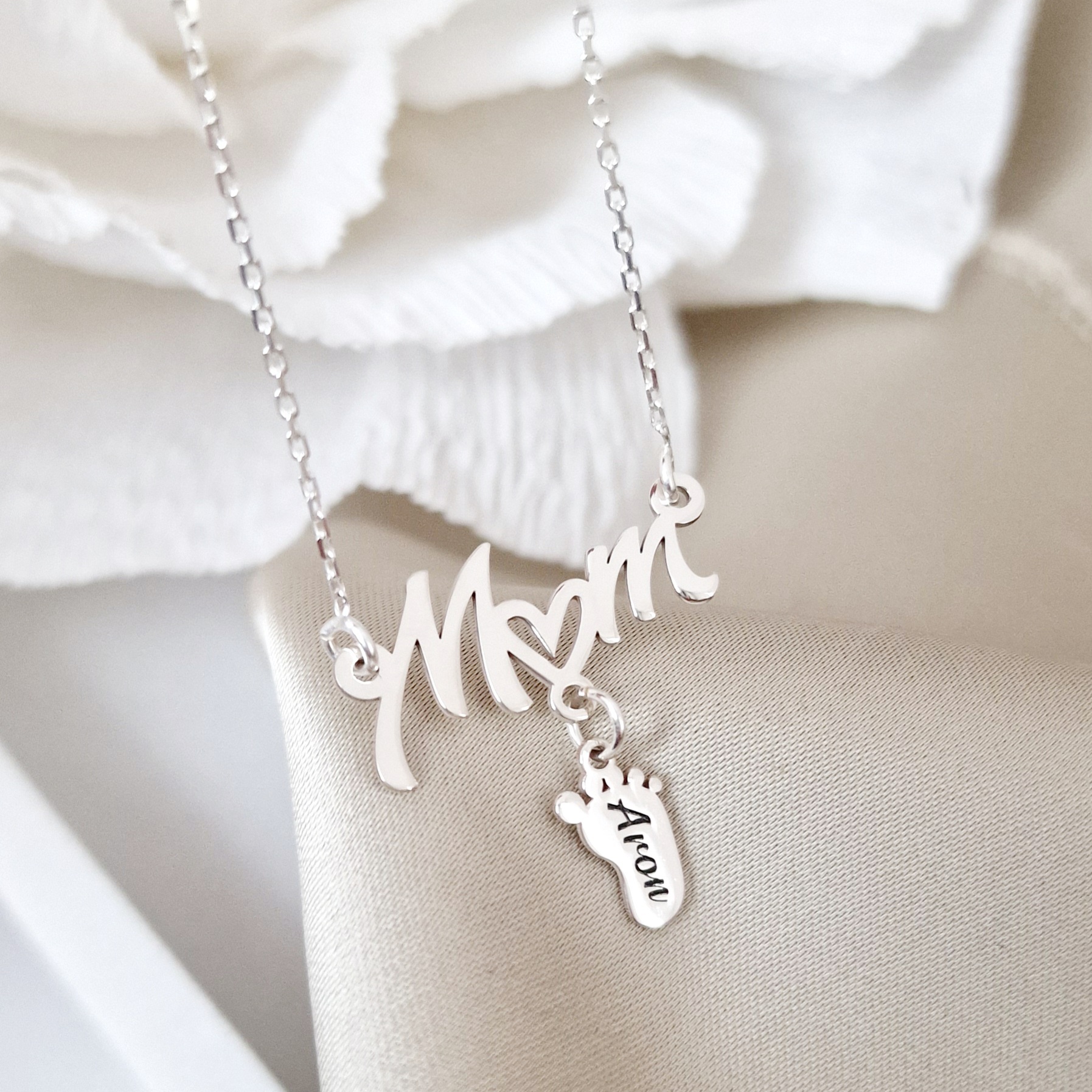 Bijuterie este compusa din pandantivul cu cel mai dulce cuvant "Mom" de care este atasat un piciorus personalizat cu un nume. La cerere putem realiza modelul si cu mai multe picirouse agatate.