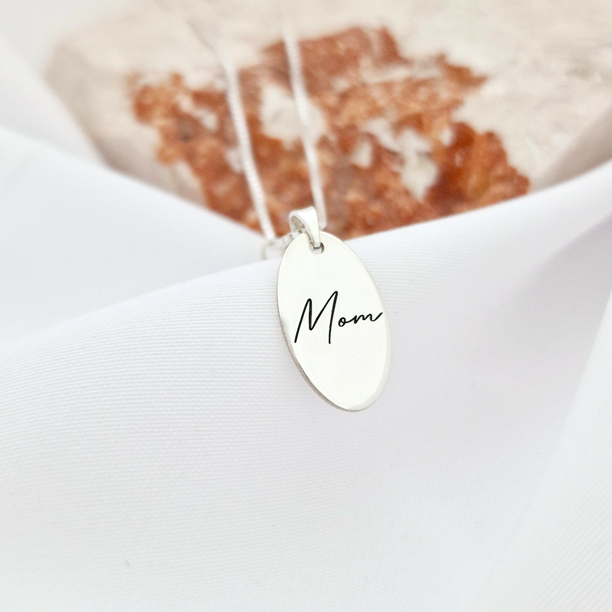 Acest lănțișor cu pandantiv oval "MOM" este un simbol al iubirii și al legăturii speciale dintre mamă și copil. Perlă naturală, rafinată, adaugă un strop de eleganță și delicatețe acestui accesoriu din argint 925 de înaltă calitate. Ideal pentru orice ocazie, fie că este vorba despre o zi de naștere sau o aniversare, acest lănțișor va adăuga un farmec aparte ținutei tale.