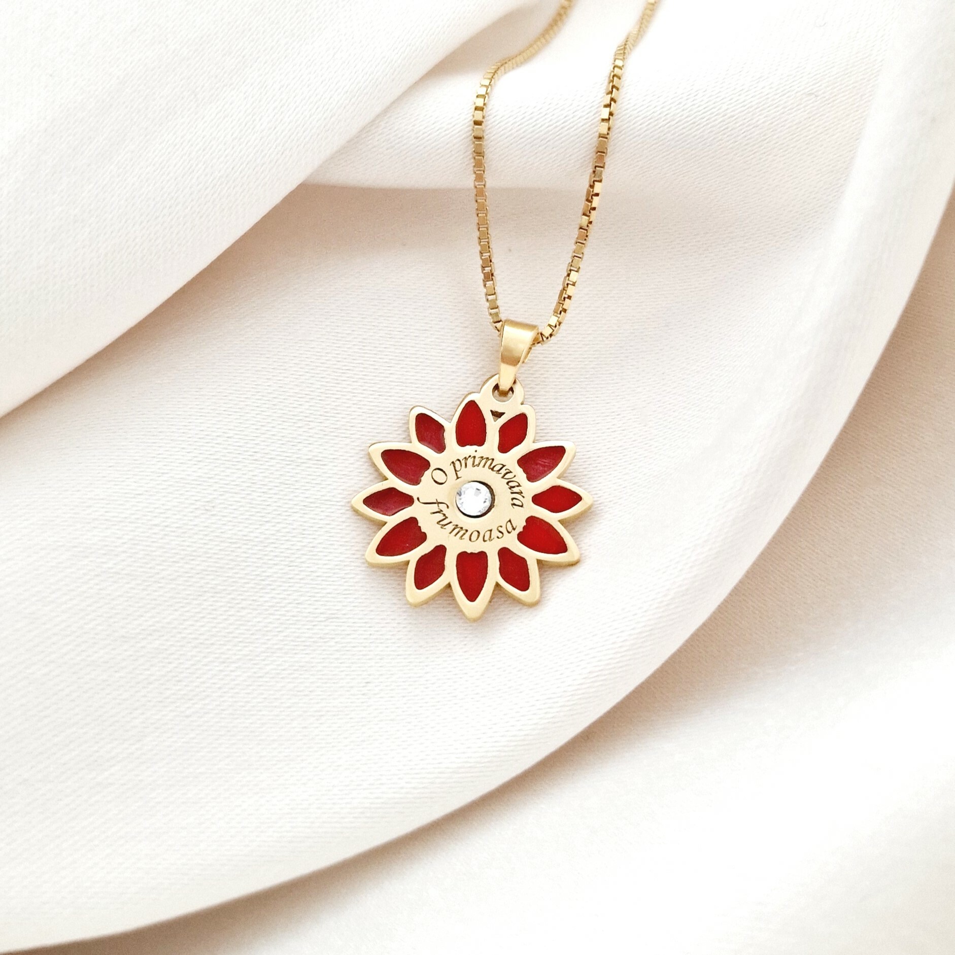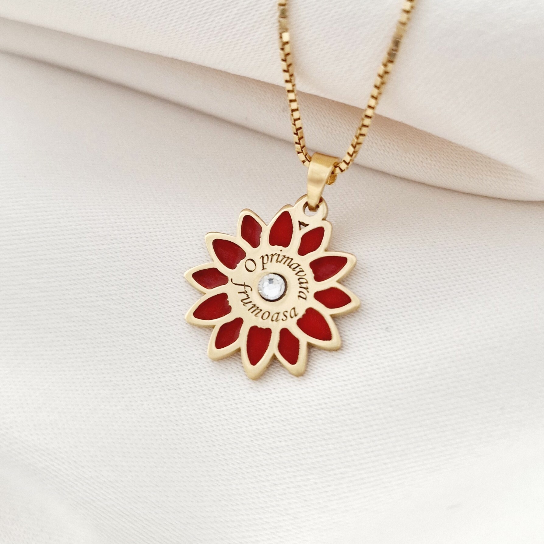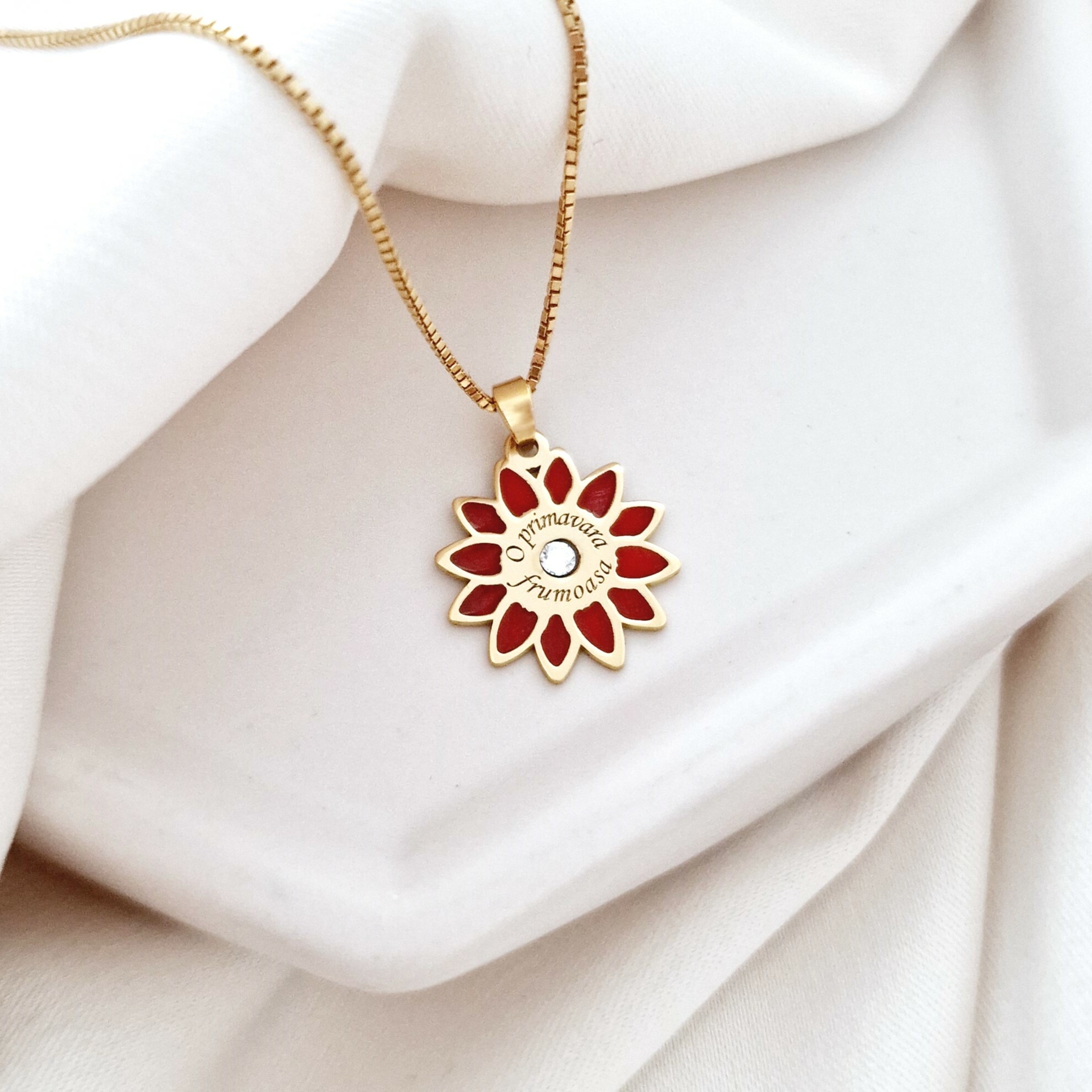 Lănțișorul "Floare de Primăvară" este un accesoriu delicat și rafinat, realizat din argint 925 placat cu aur galben 18K și decorat cu un cristal Swarovski ce adaugă o notă de strălucire. Detaliile de email roșu formează o floare vibrantă, simbolizând reînnoirea și frumusețea primăverii. Acest lănțișor este perfect pentru a adăuga un strop de culoare și eleganță oricărei ținute, fiind un cadou ideal pentru o persoană specială.