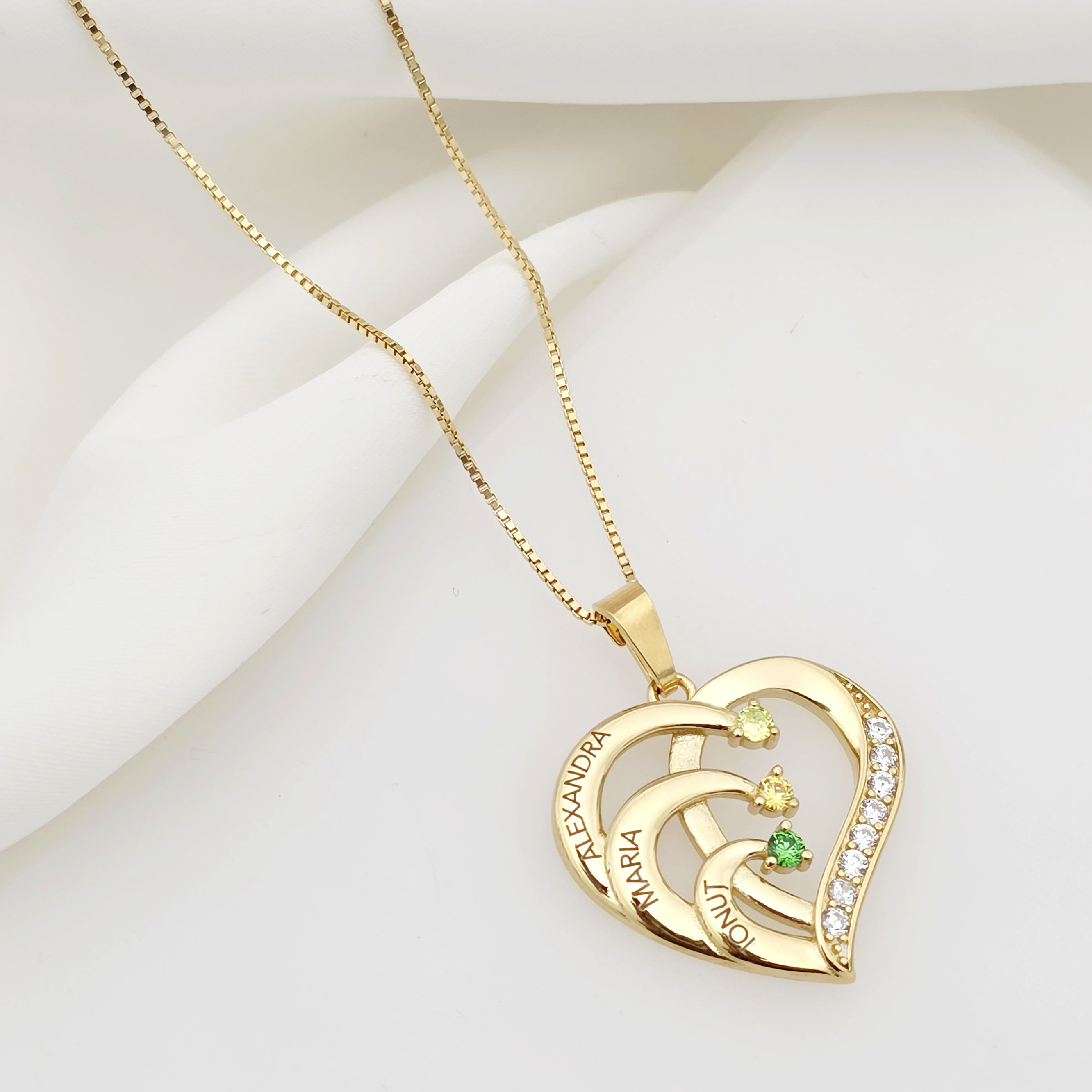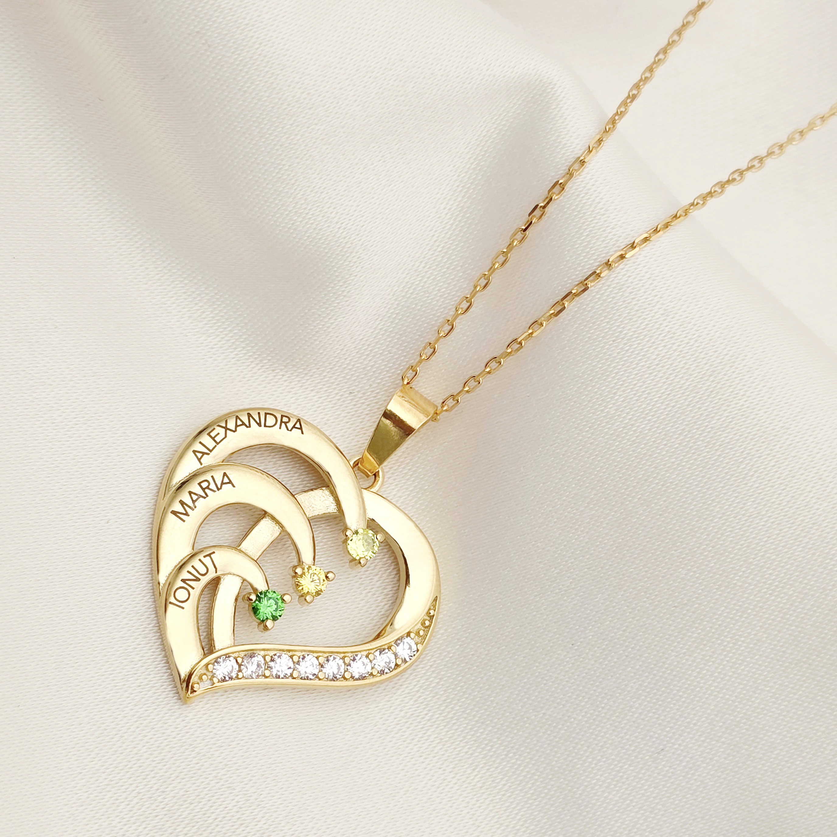 Lantisor Inima cu Poveste - 3 nume si Cristale Zirconia - Argint 925 placat cu Aur 18K