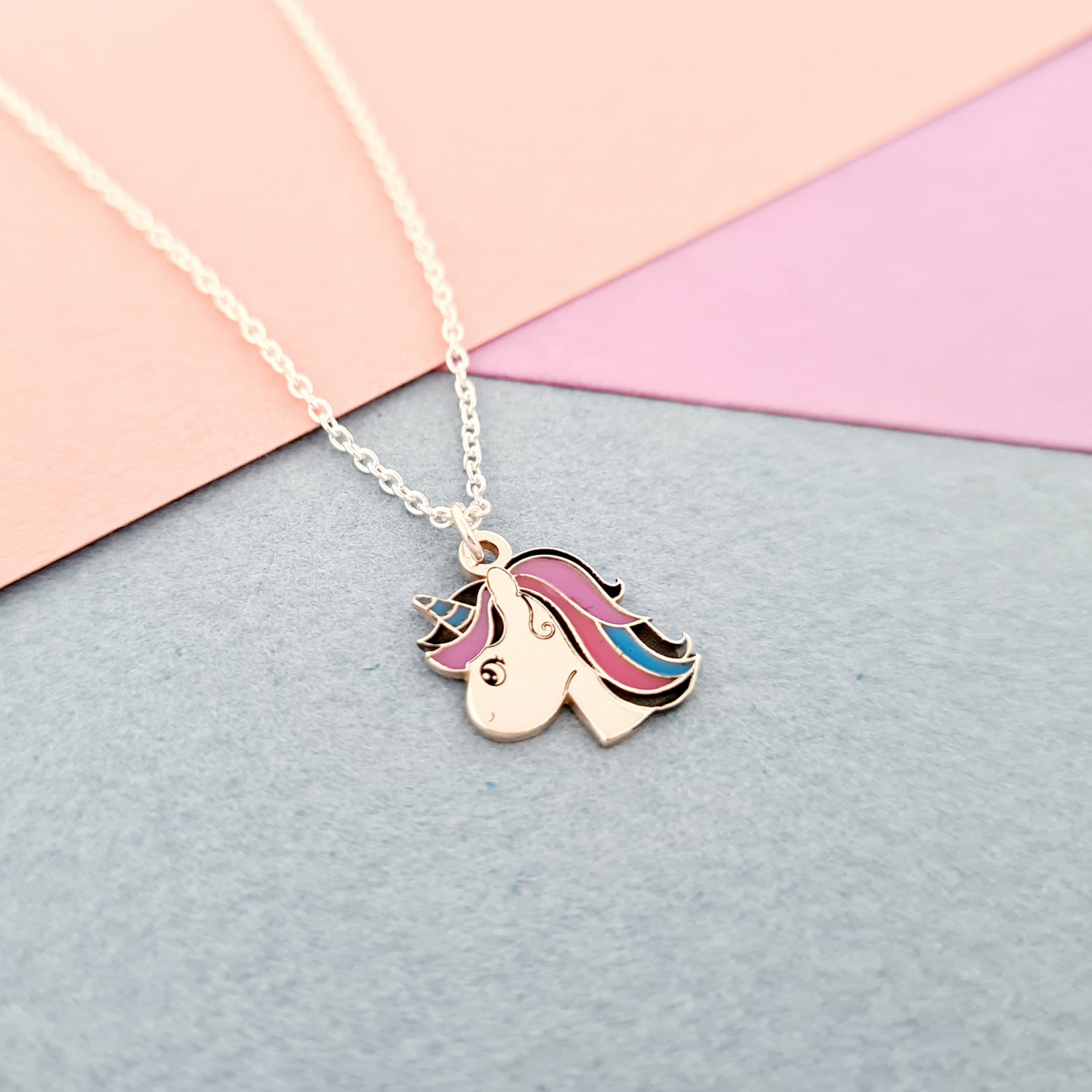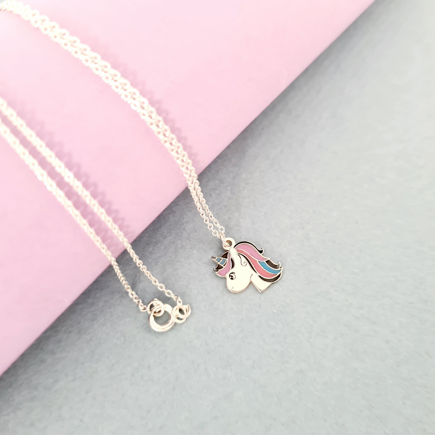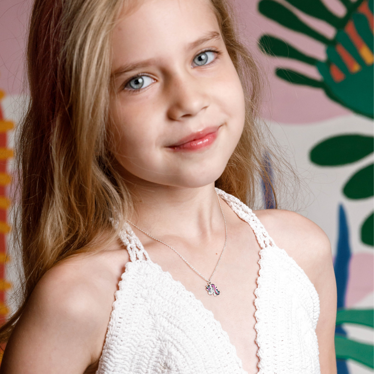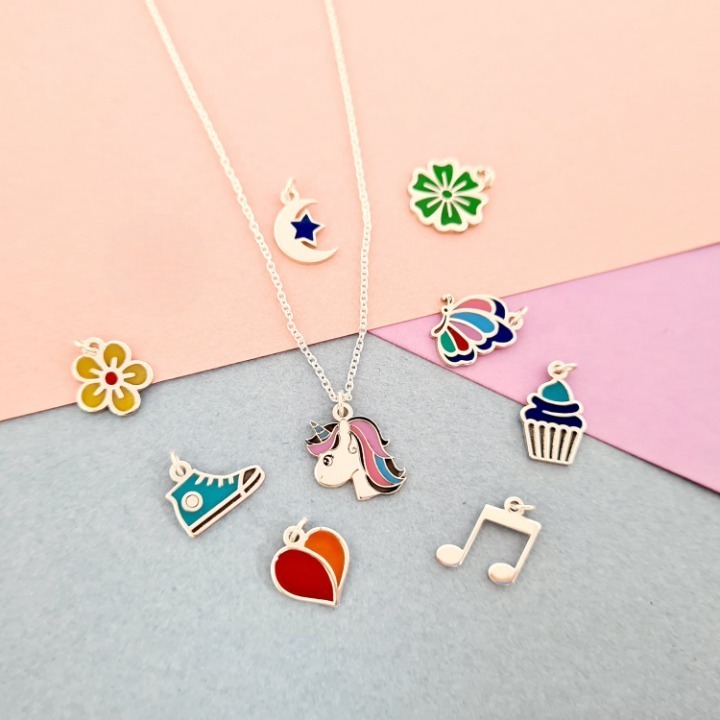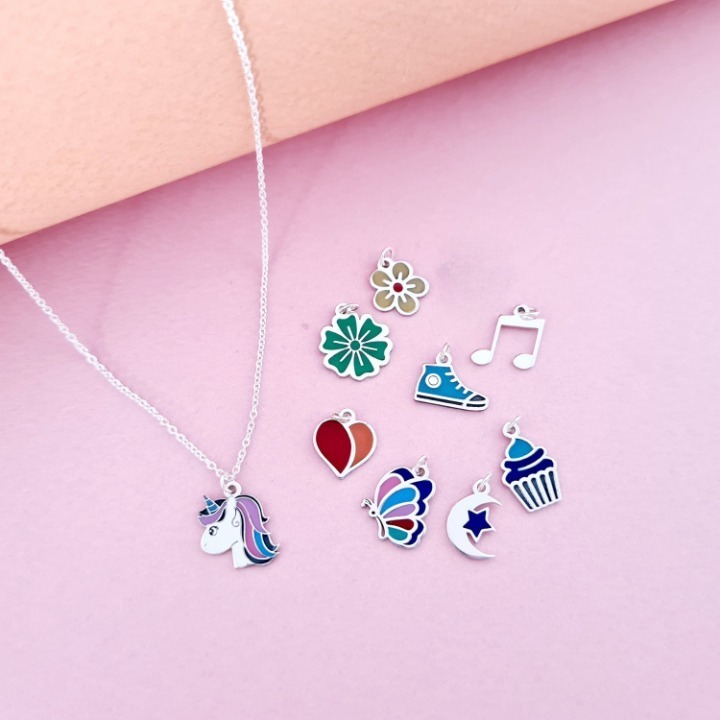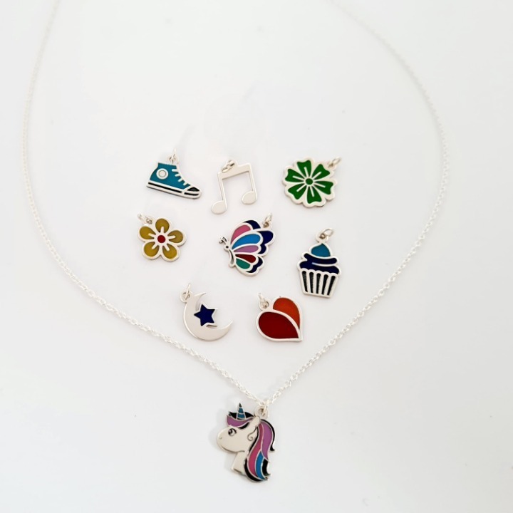 Stim cat de mult le plac celor mici culoarea, asa ca am creat colierul nostru cu diverse pandantive multicolore pentru domnisoare chic! Fiecare pandantiv este decorat cu email colorat. Pentru a plasa comanda alege pandantivul dorit din lista de la persoanalizarea produsului: unicorn, inima, fluture, briosa, papuc tenes, floare galbena, floare verde, luna si stea sau nota muzicala.