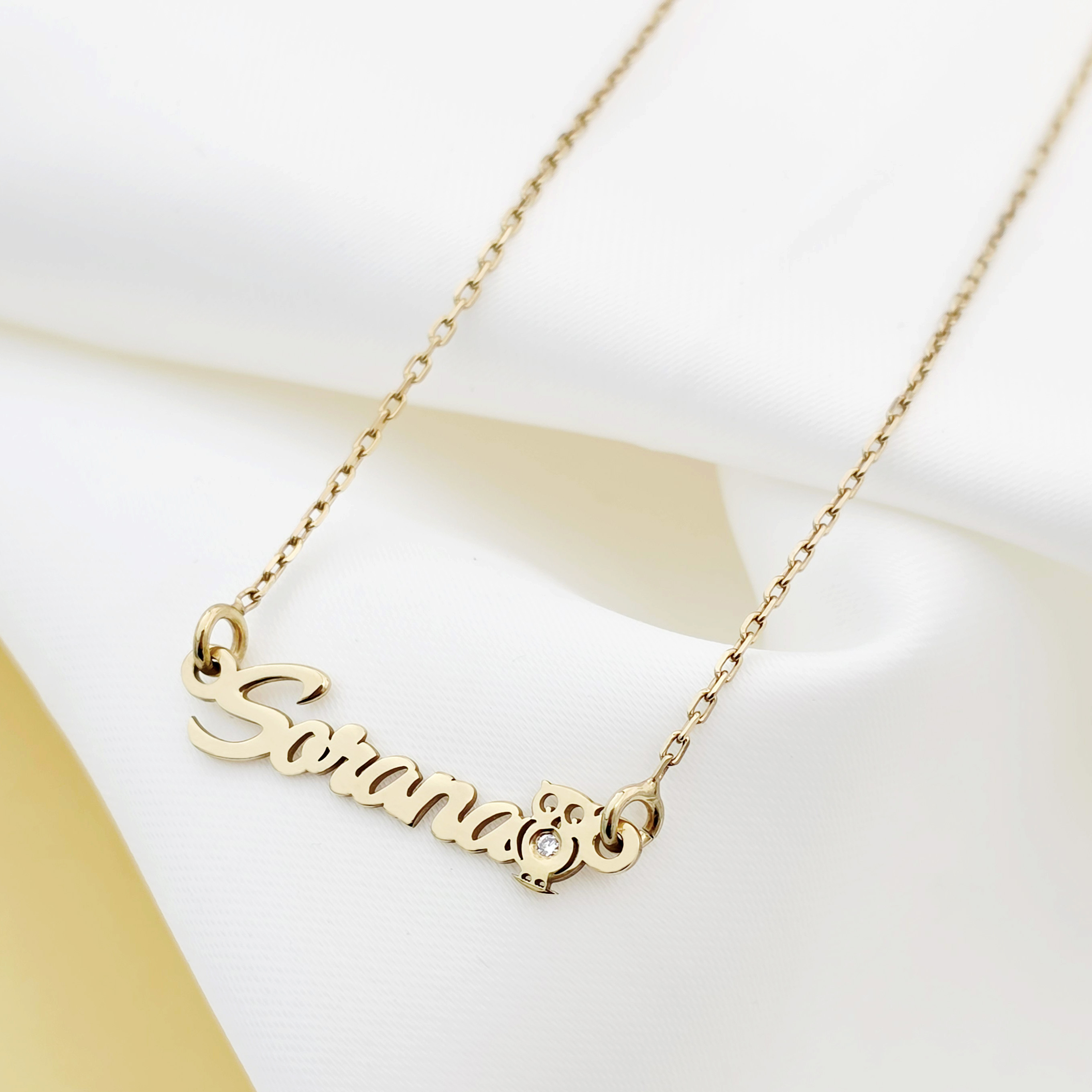 Colier Personalizat cu Nume si Bufnita Decorata cu Diamant – O Bijuterie Simbolica si Eleganta