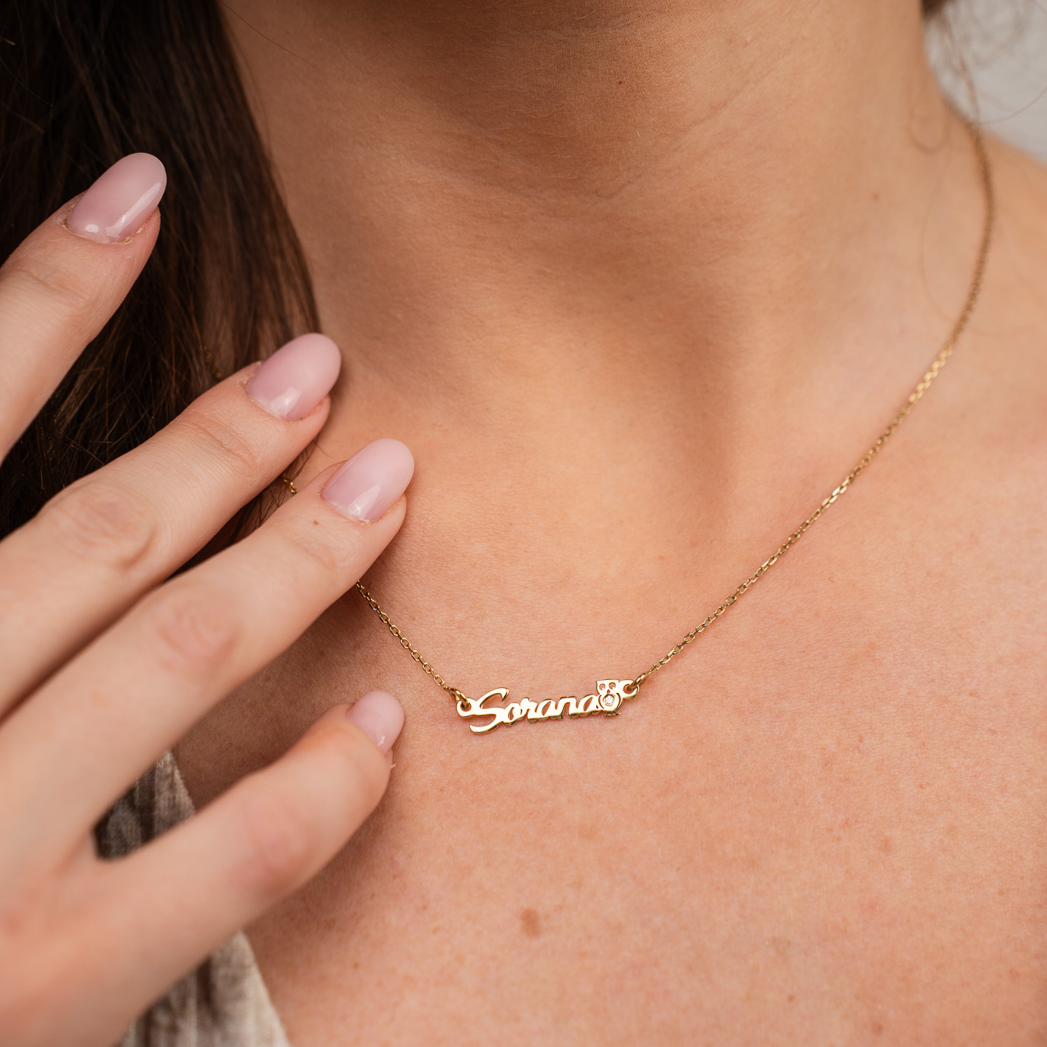 Lantisor personalizat cu Nume si Bufnita decorata cu Diamant natural - Argint 925 placat cu Aur Galben 18K