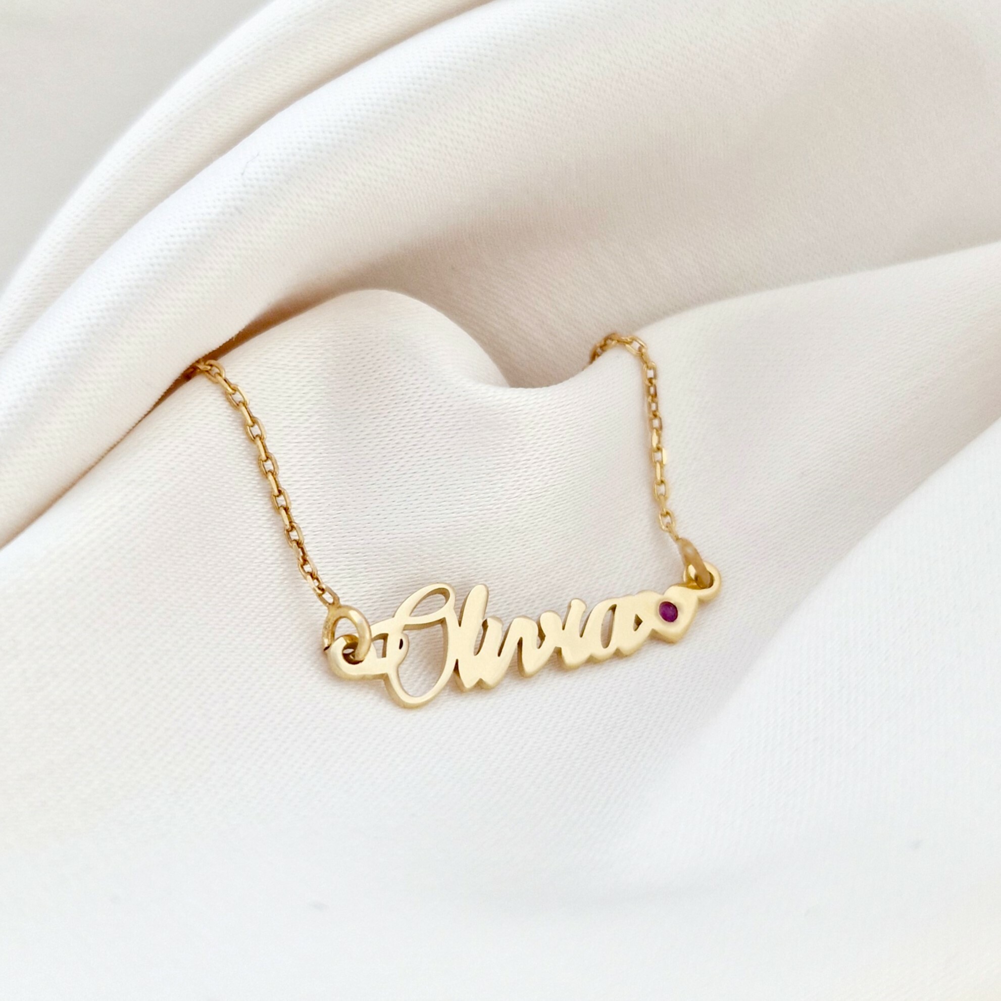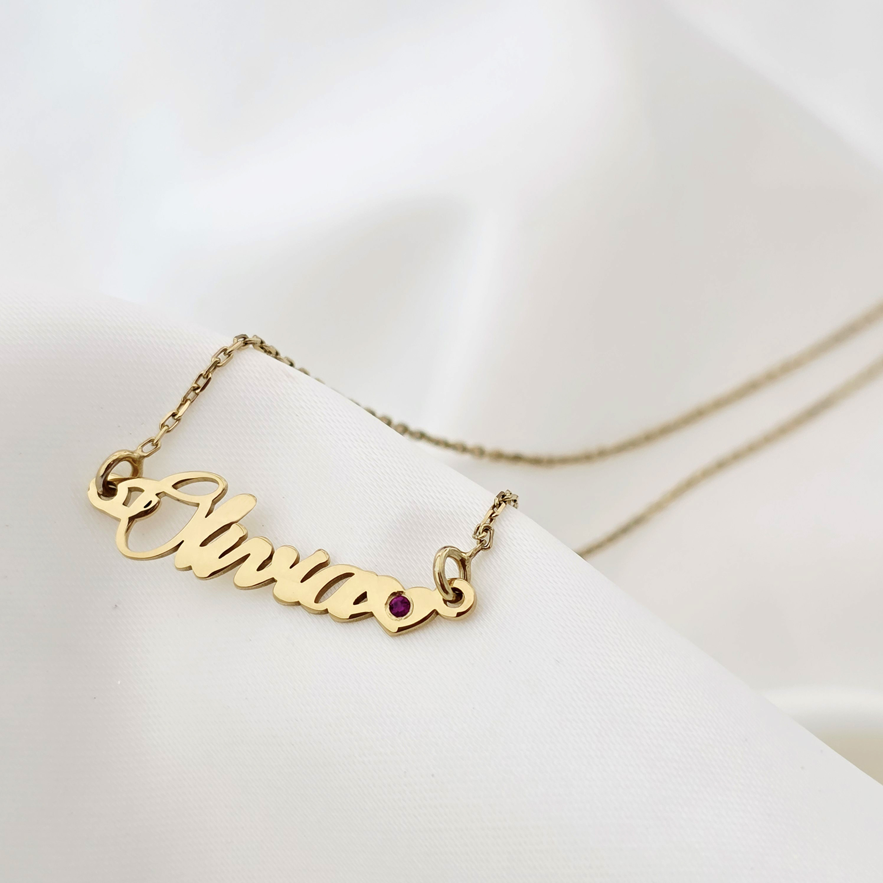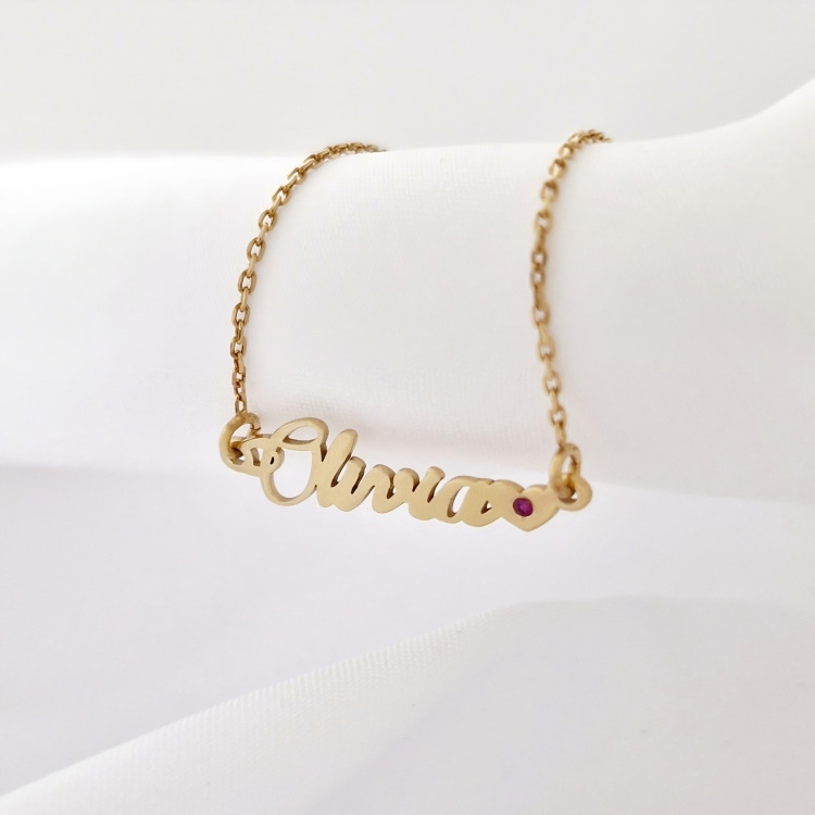 - Design personalizat: Numele dorit, cu litere realizate manual, insotite de o inima cu piatra rubin