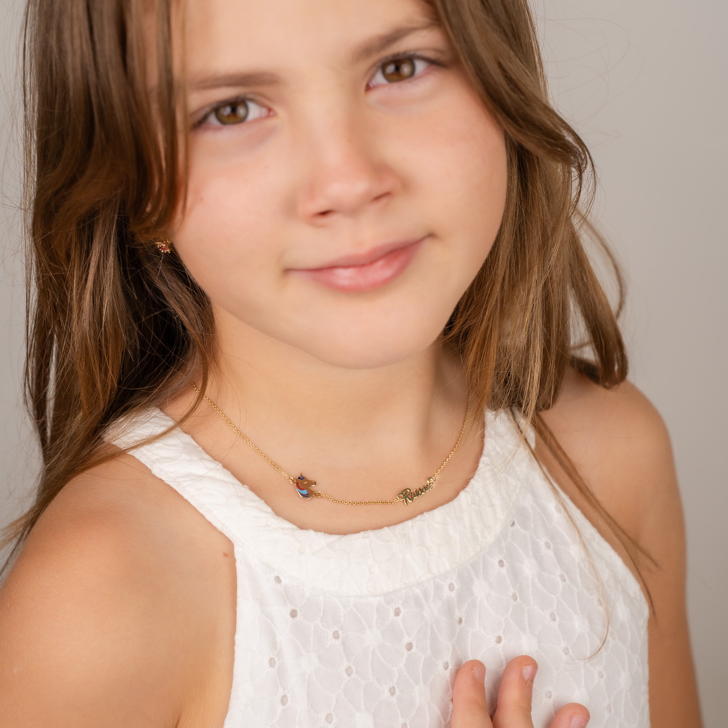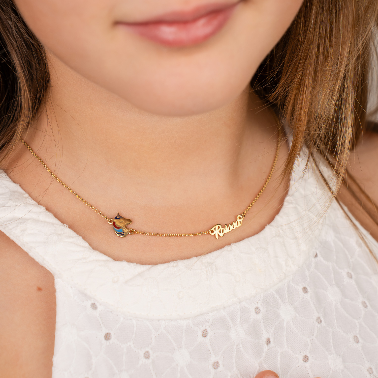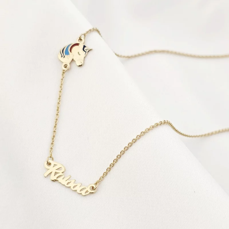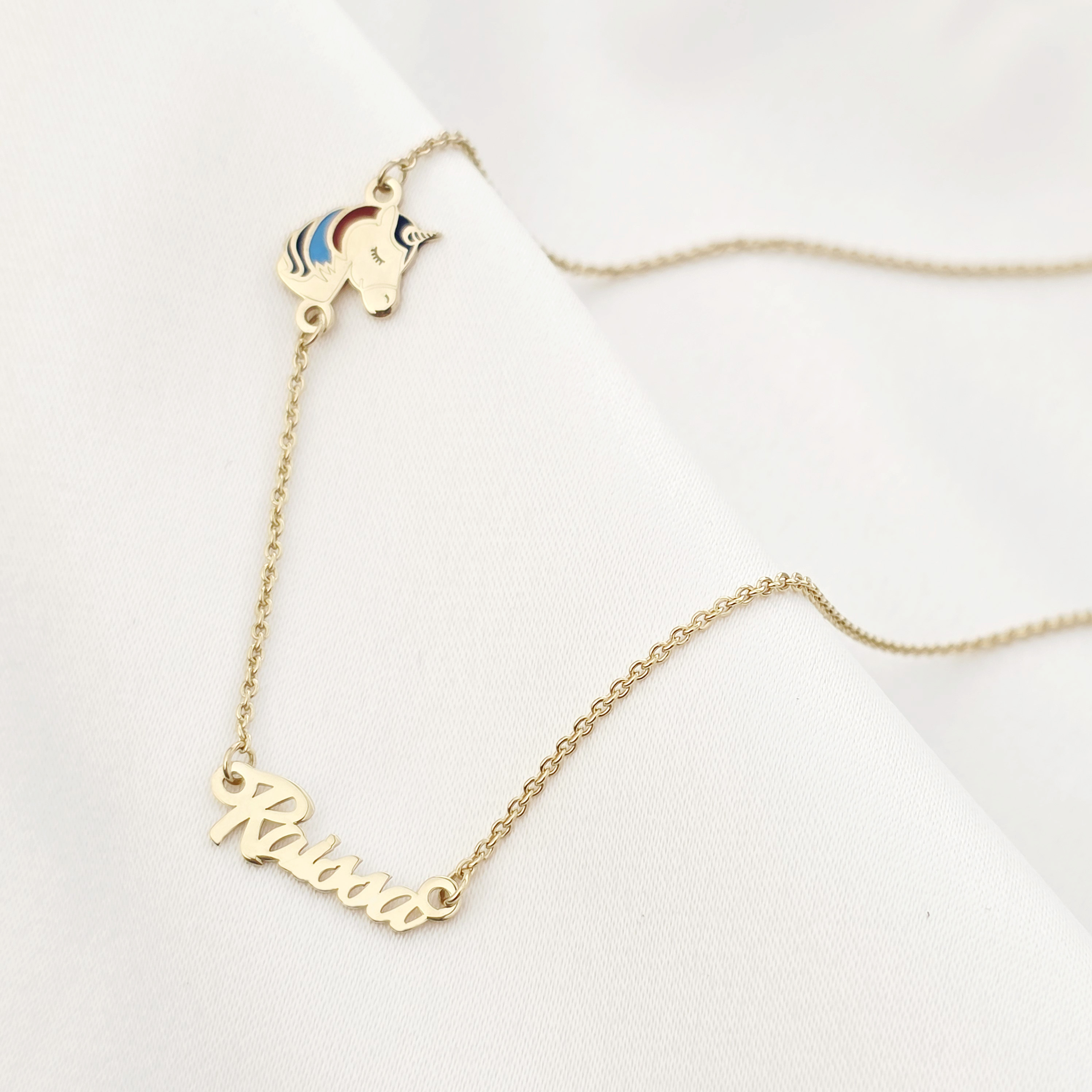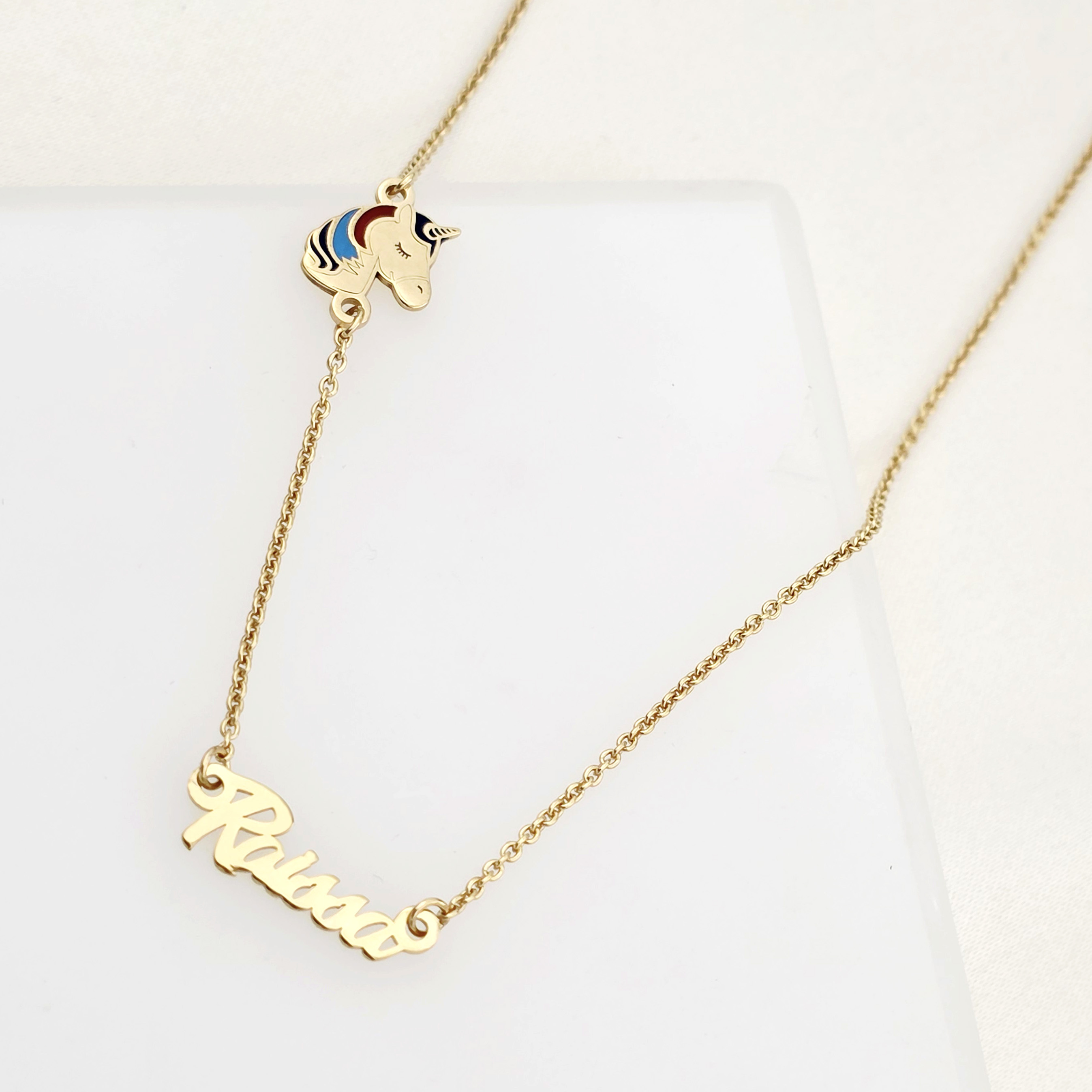 Lantisor personalizat cu Nume si pandantiv lateral Unicorn colorat cu email - Argint 925 placat cu Aur Galben 18K