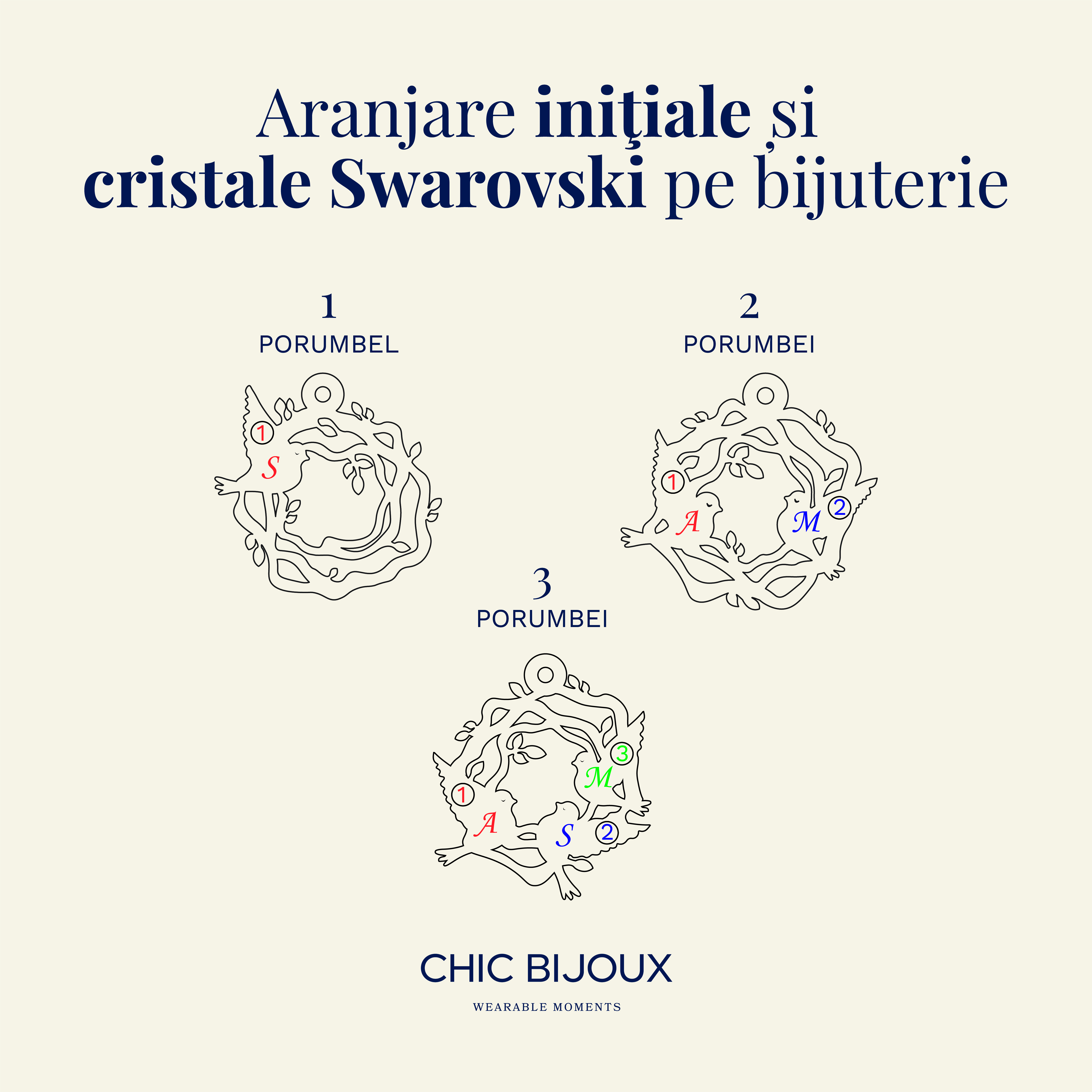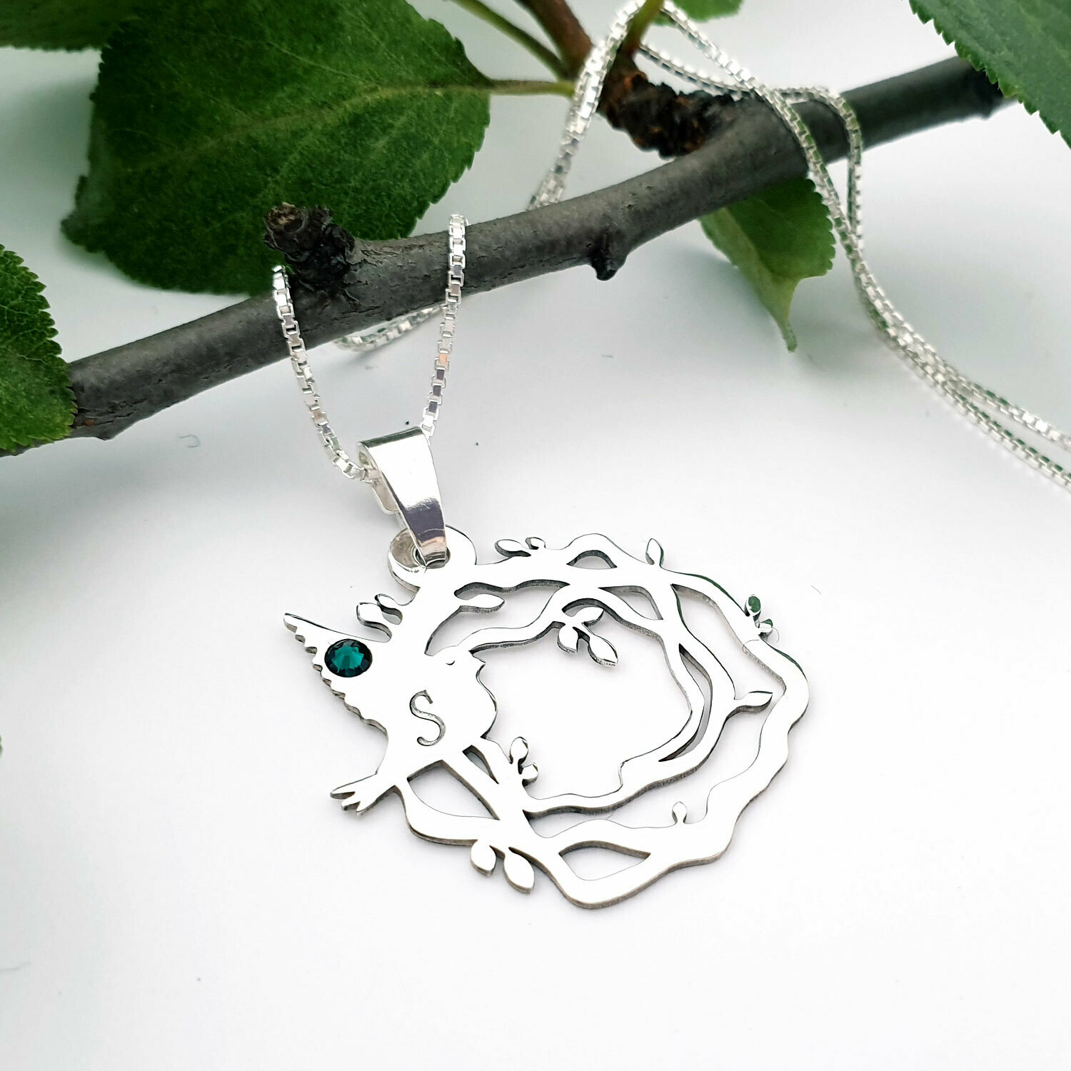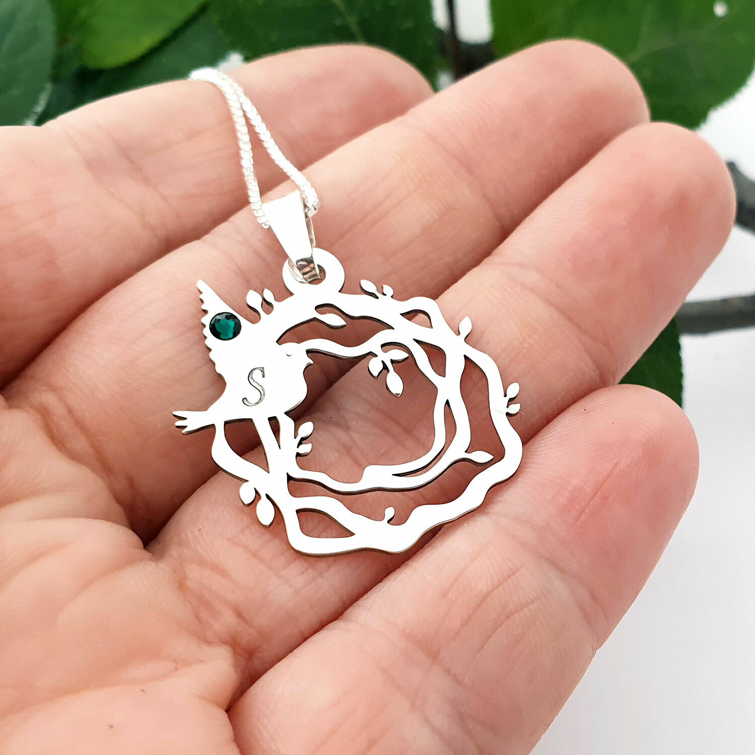 Bijuteria poate fi personalizata cu pana la 3 pasari, fiecare cu o initiala gravata.