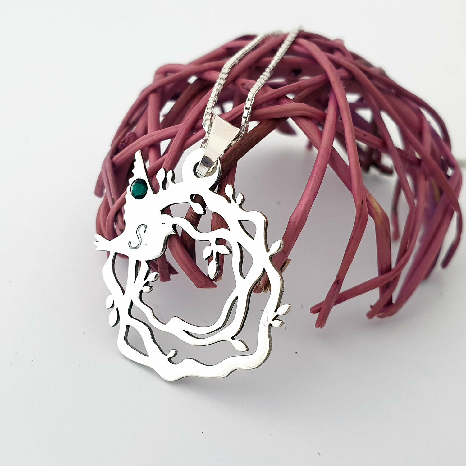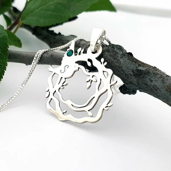Modelul lantisorului Cuibul nostru reprezinta impletirea de ramuri intr-un model inedit de pandantiv pe care s-au asezat de asemenea pasarele ce poarta initiala fiecarui membru al familiei.