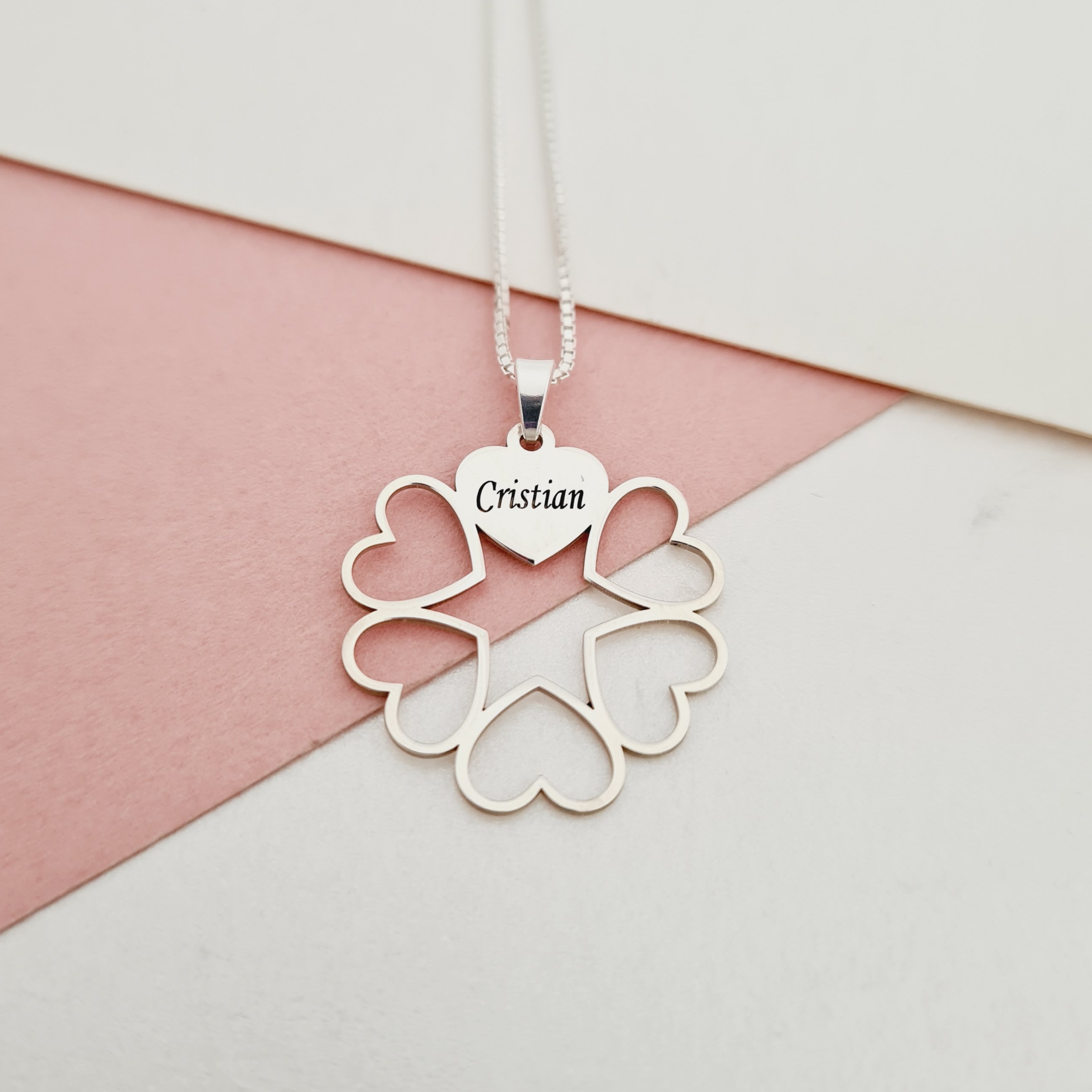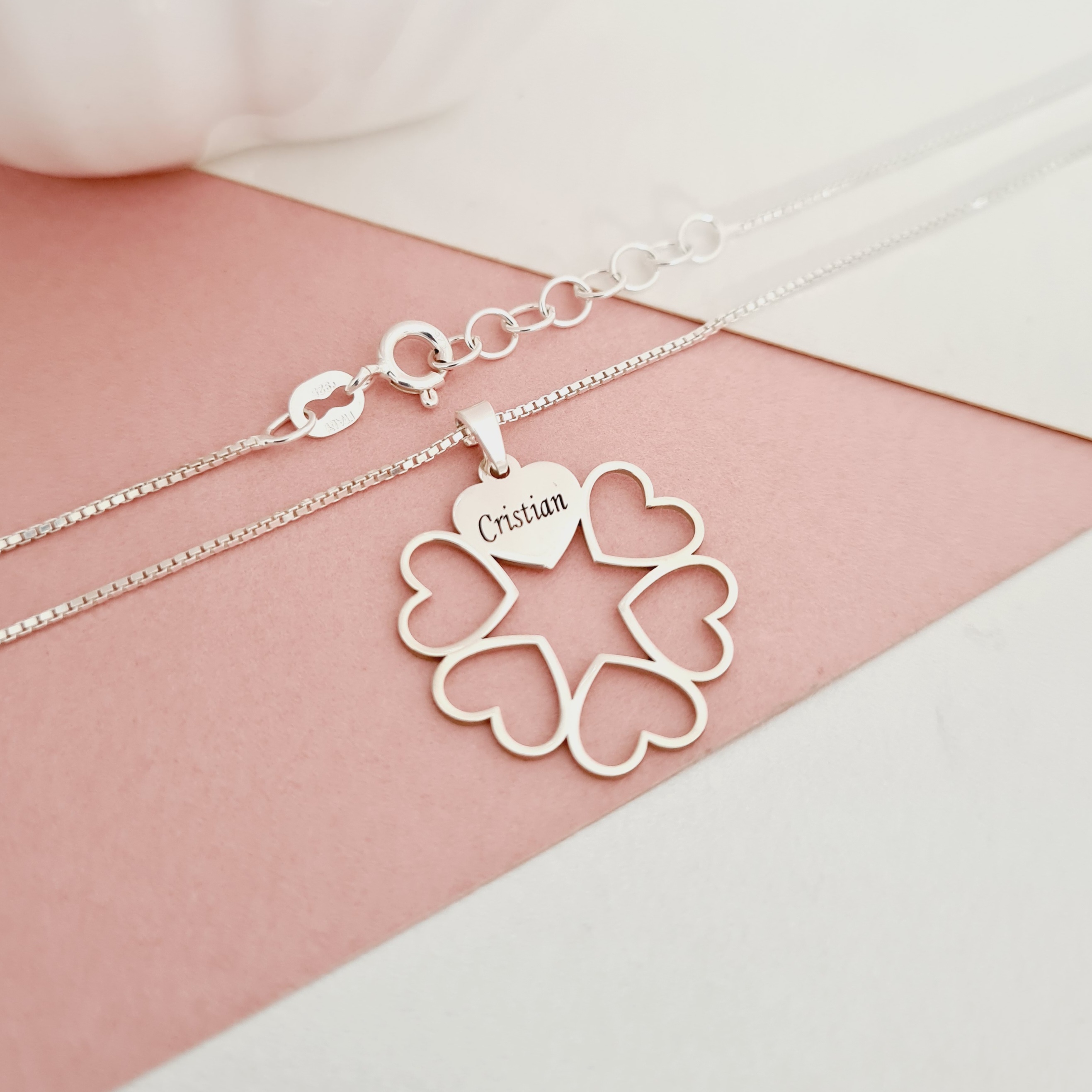 Lantisorul este cadoul perfect pentru a aduce un zambet in plus pe fata femeii iubite. Pandantivul are un design romantic si elegant ce prezinta o stea intre inimi. In total sunt 6 inimi, iar acestea in functie de bijuteria aleasa sunt pline sau goale. Pe inima/inimile pline sunt gravate numele pe care tu doresti sa le ai aproape mereu.