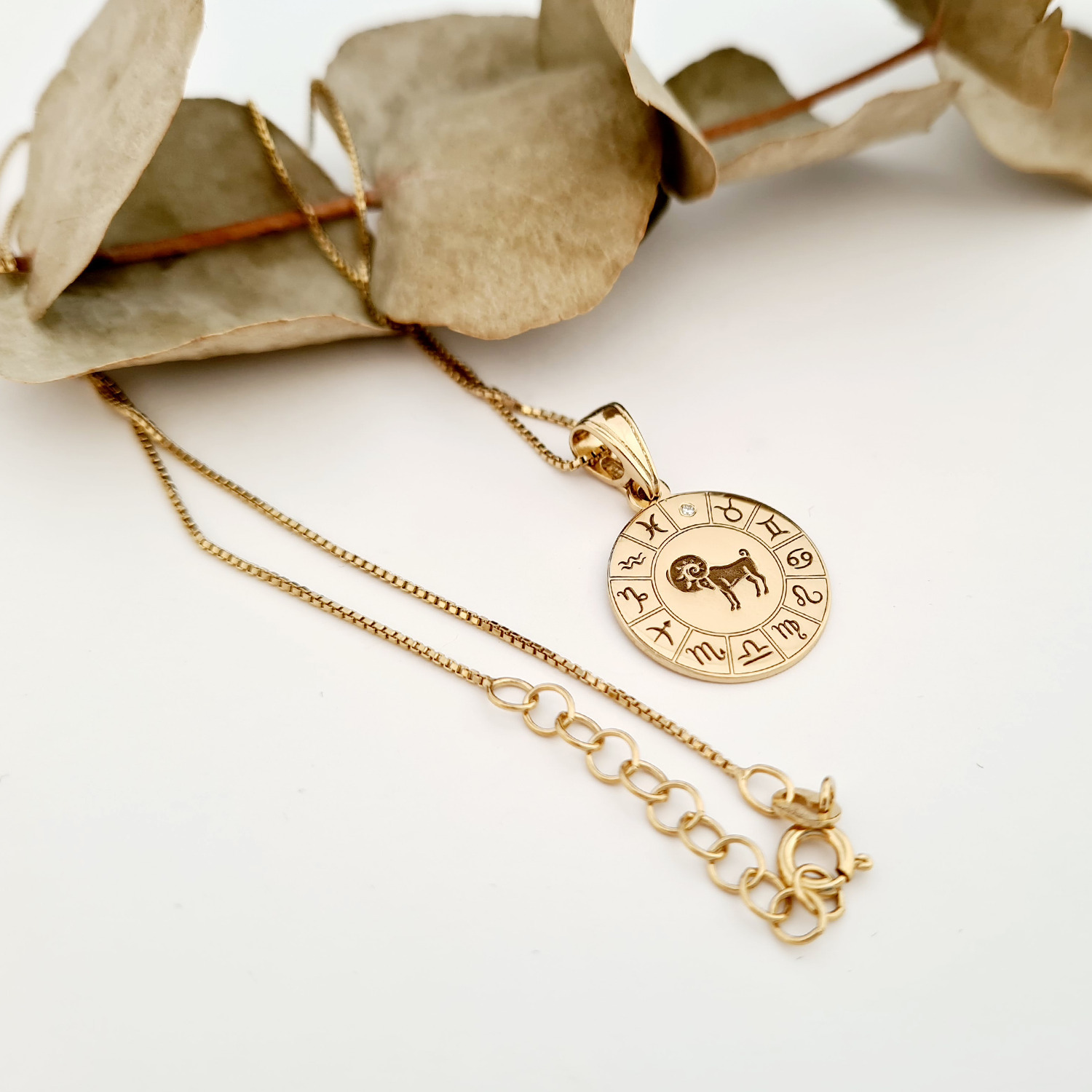 Lantisor personalizat - Roata zodiacala - Pandantiv de 20 mm cu Diamant natural - Argint 925 placat cu Aur Galben 18K