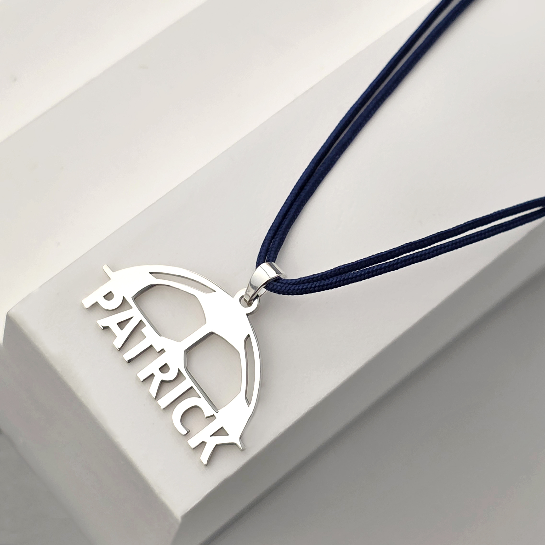Acest pandantiv unic, în formă de jumătate de minge de fotbal, este realizat din Argint 925 și personalizat cu numele tău decupat pentru un plus de individualitate. Este prins pe un șnur colorat, confortabil și ușor de asortat cu un stil sport-casual. Designul modern îl face un cadou inspirat pentru orice pasionat de fotbal.