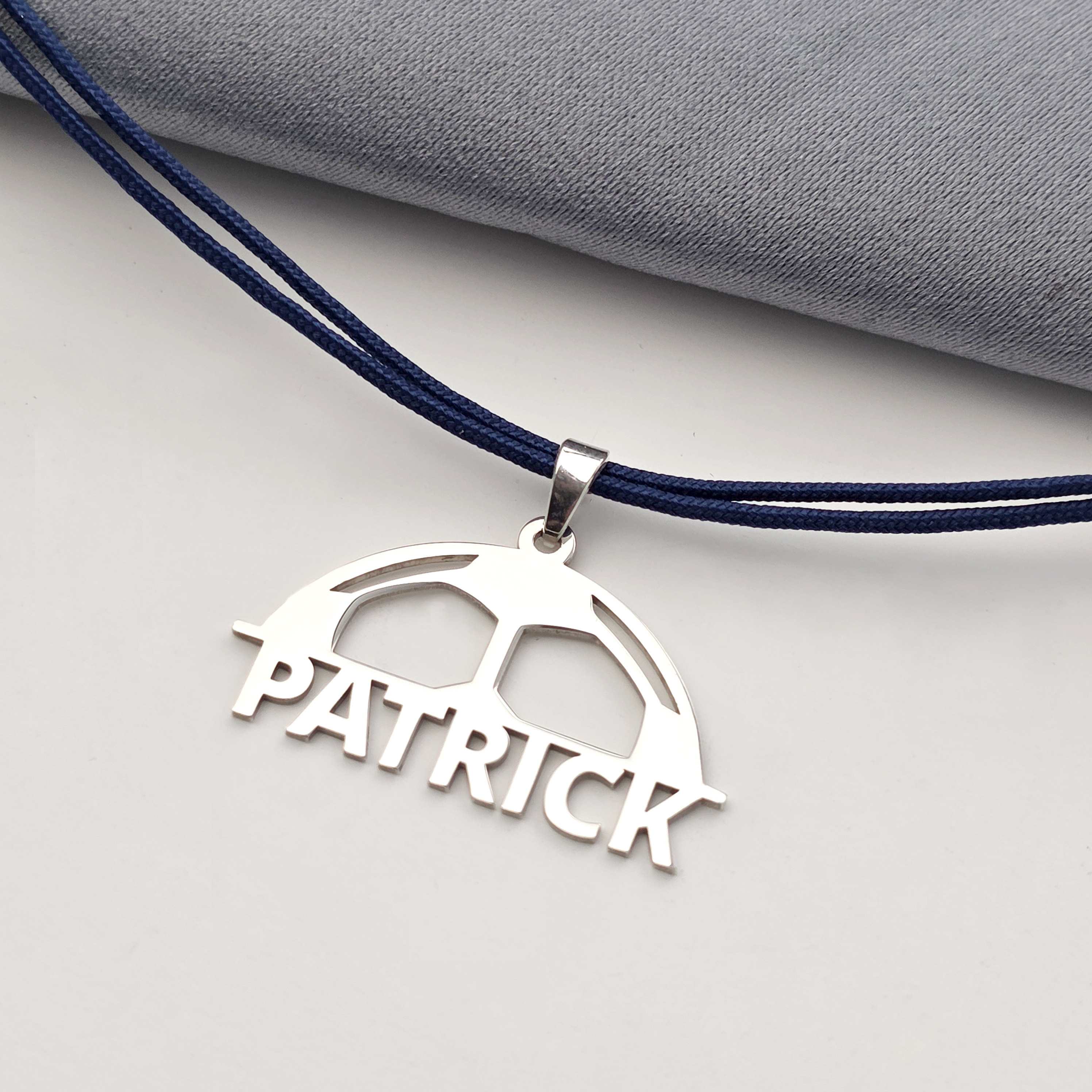 Pandantiv jumatate de minge de fotbal - cu nume decupat - Argint 925 - Snur colorat