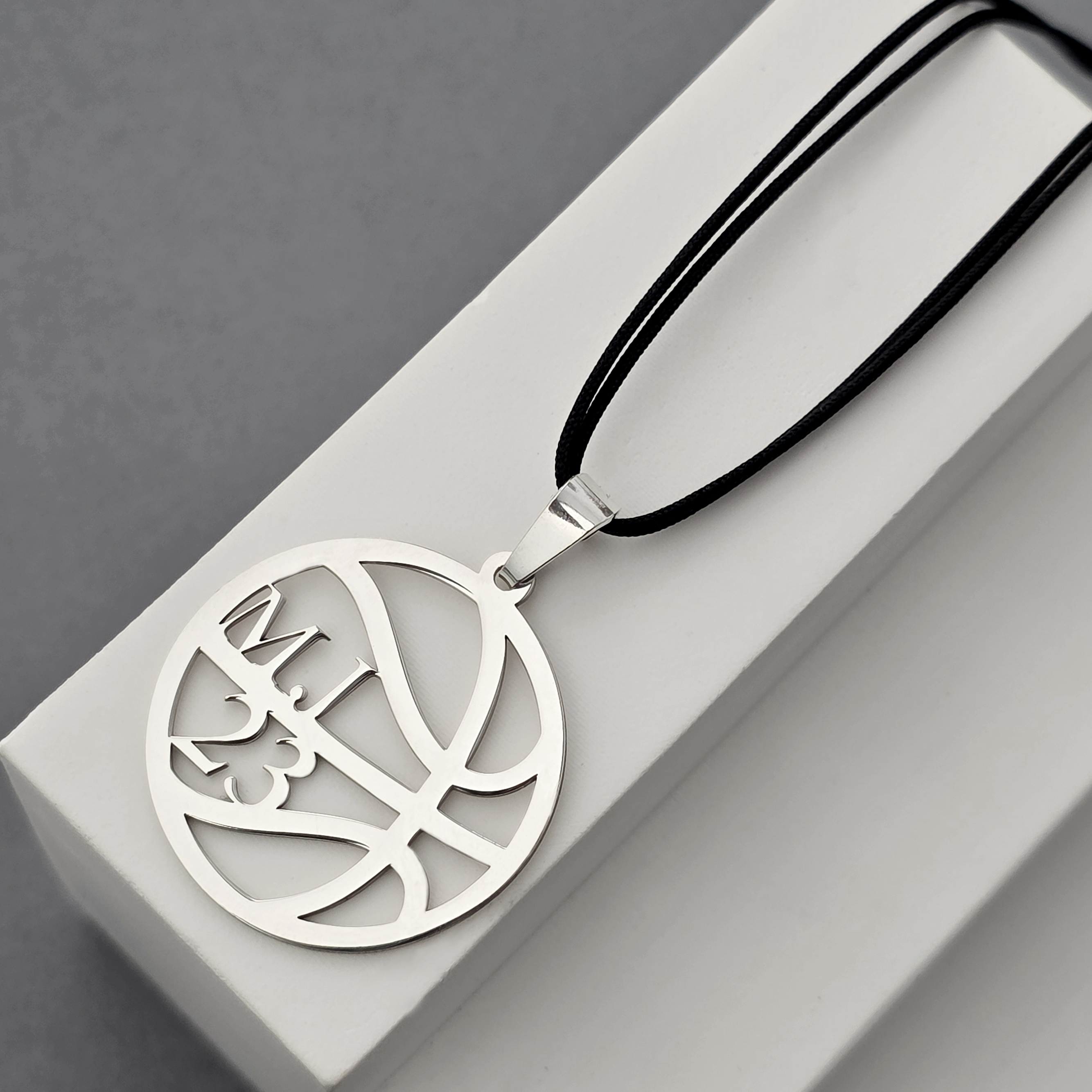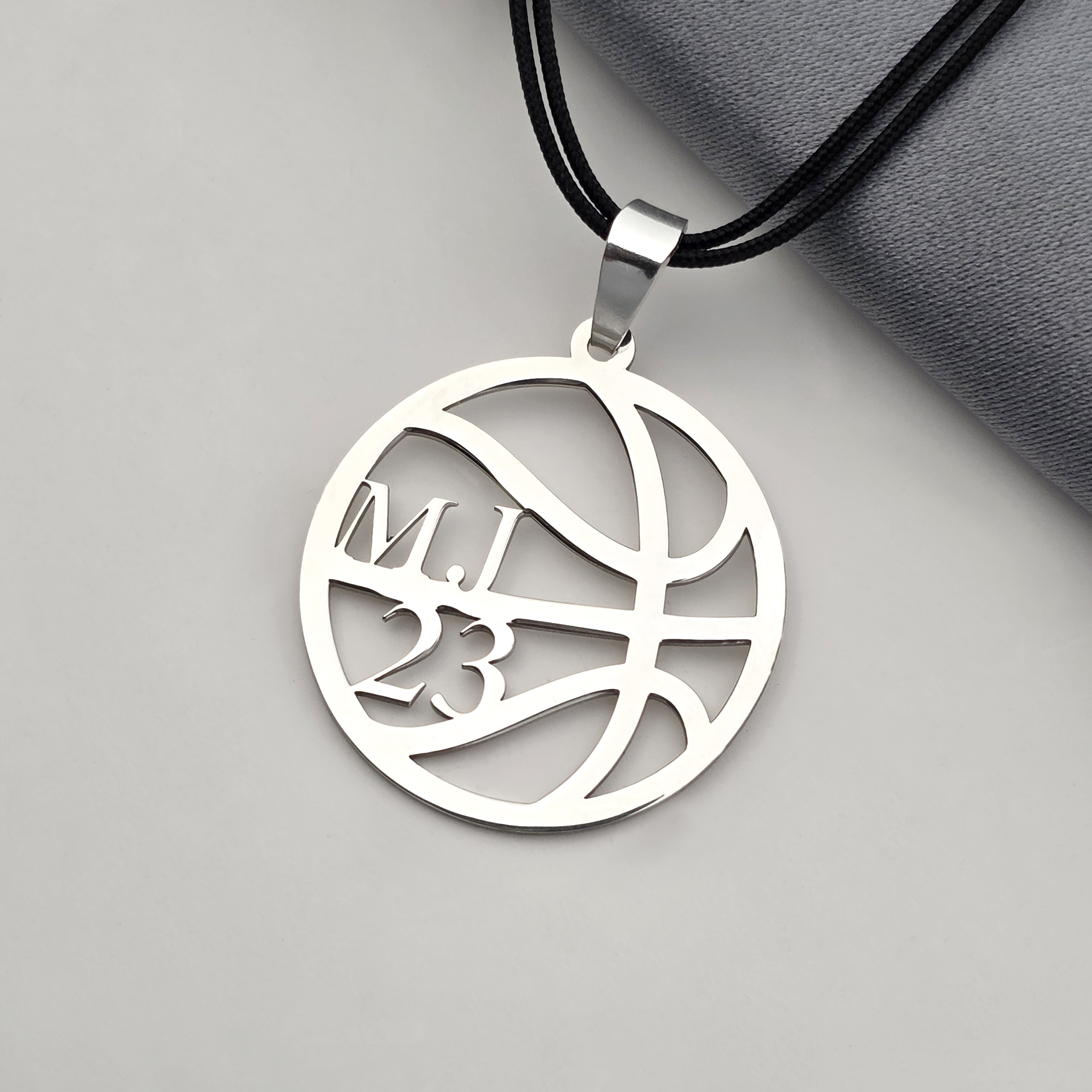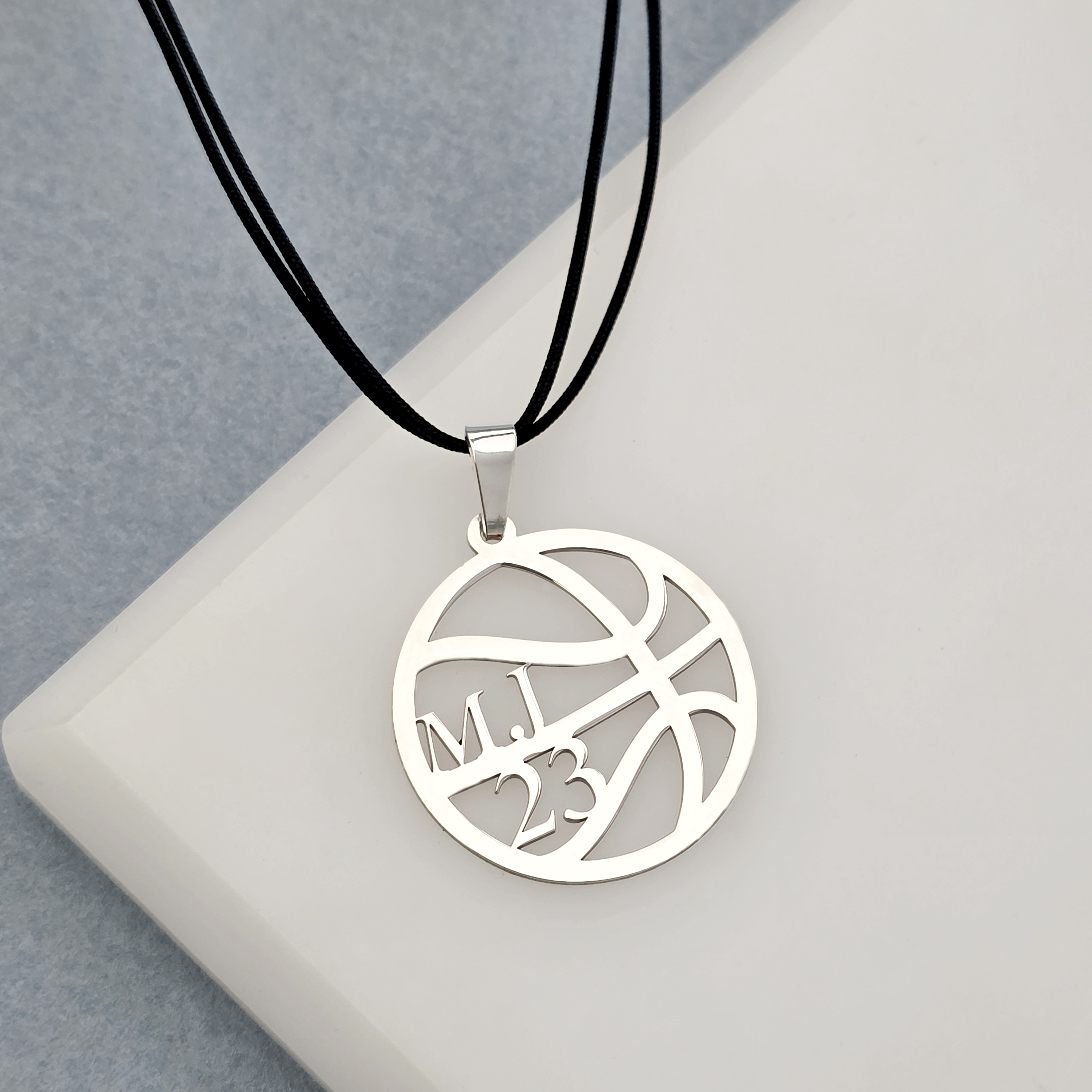 Pandantiv minge de baschet - cu initiale si numar decupat - Argint 925 - Snur colorat