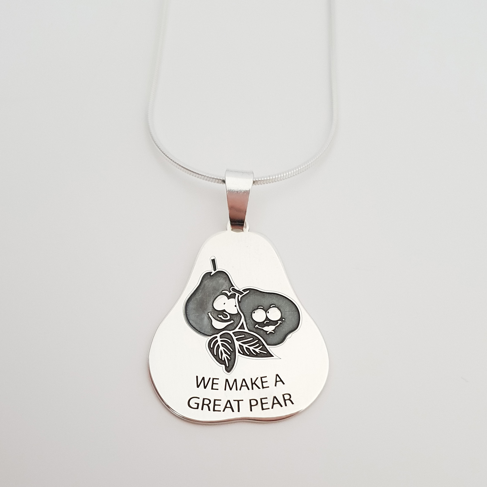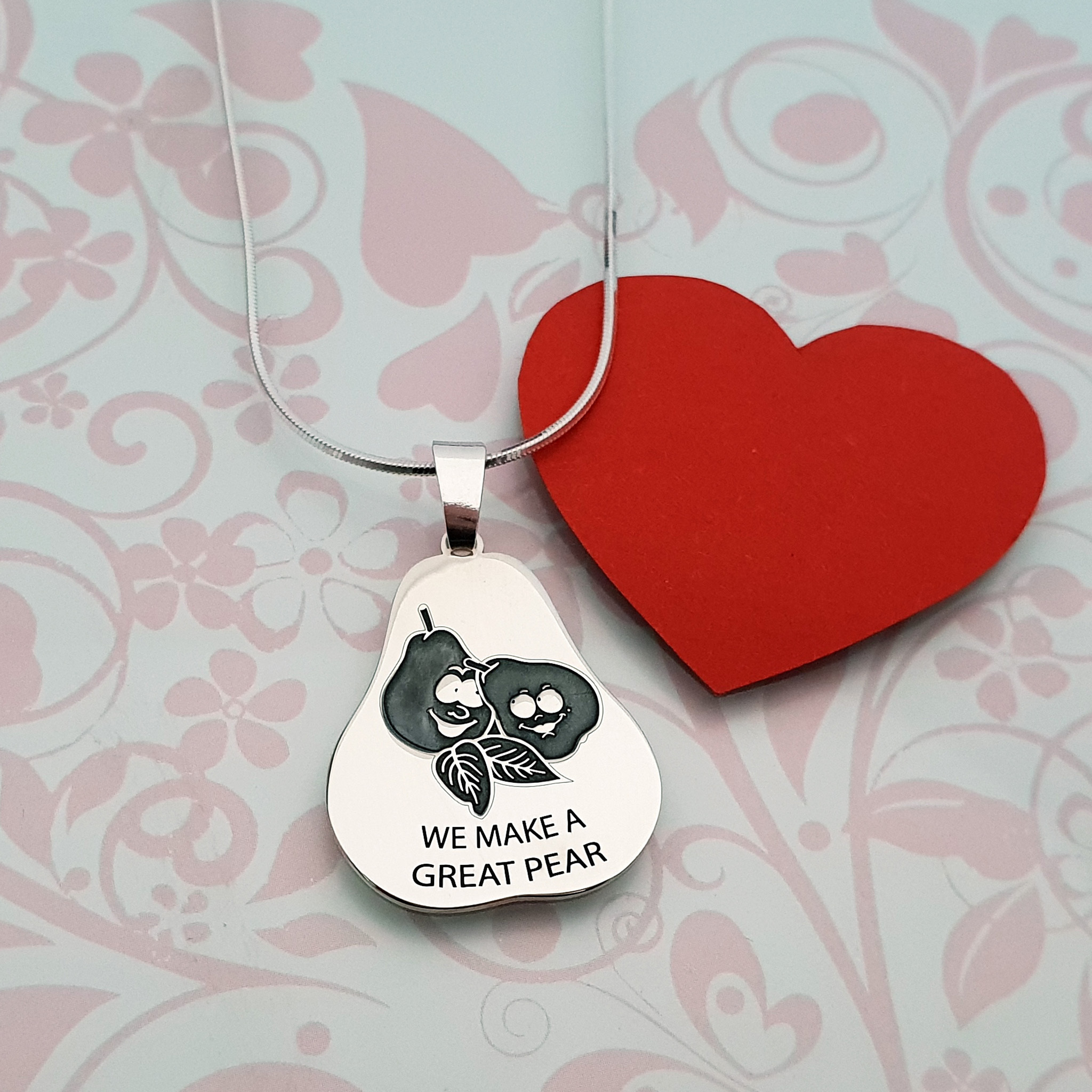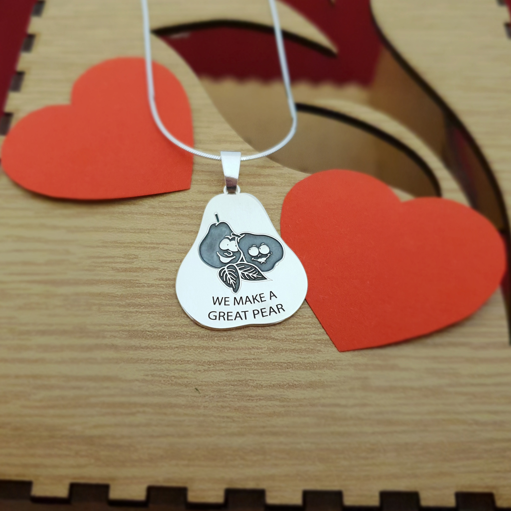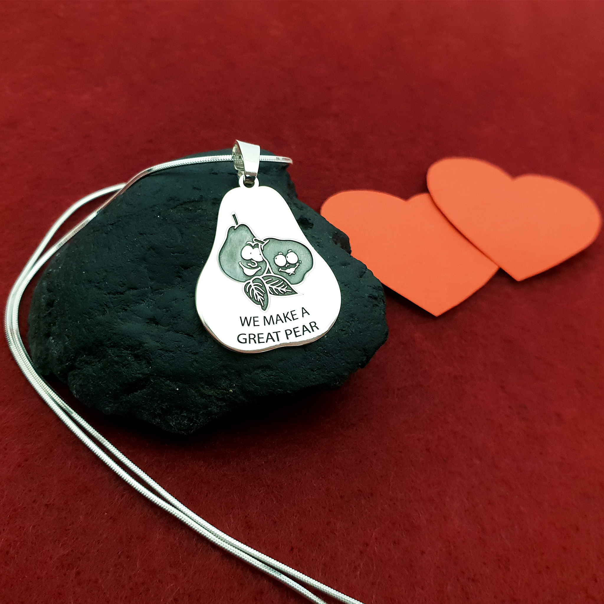 Un lantisor special creat din Argint 925 care infatiseaza doua pere fericite si un mesaj simpatic, fiind perfect pentru a-l oferii jumatatii tale.