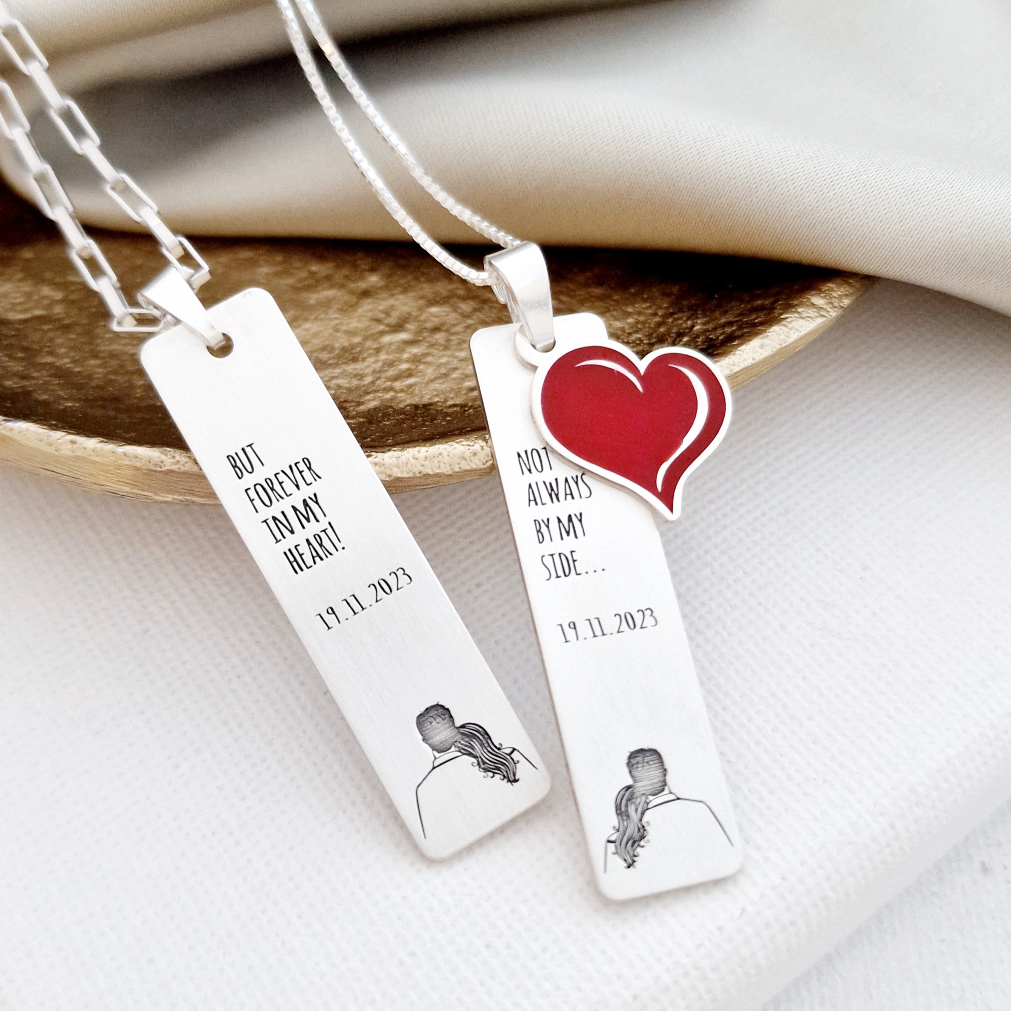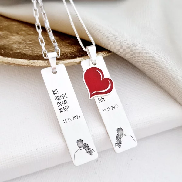 Set lantisoare cu pandantive dreptunghiulare personalizate - El si Ea - Argint 925 cu finisare aspect mat - Pandantiv inima decorat cu email colorat
