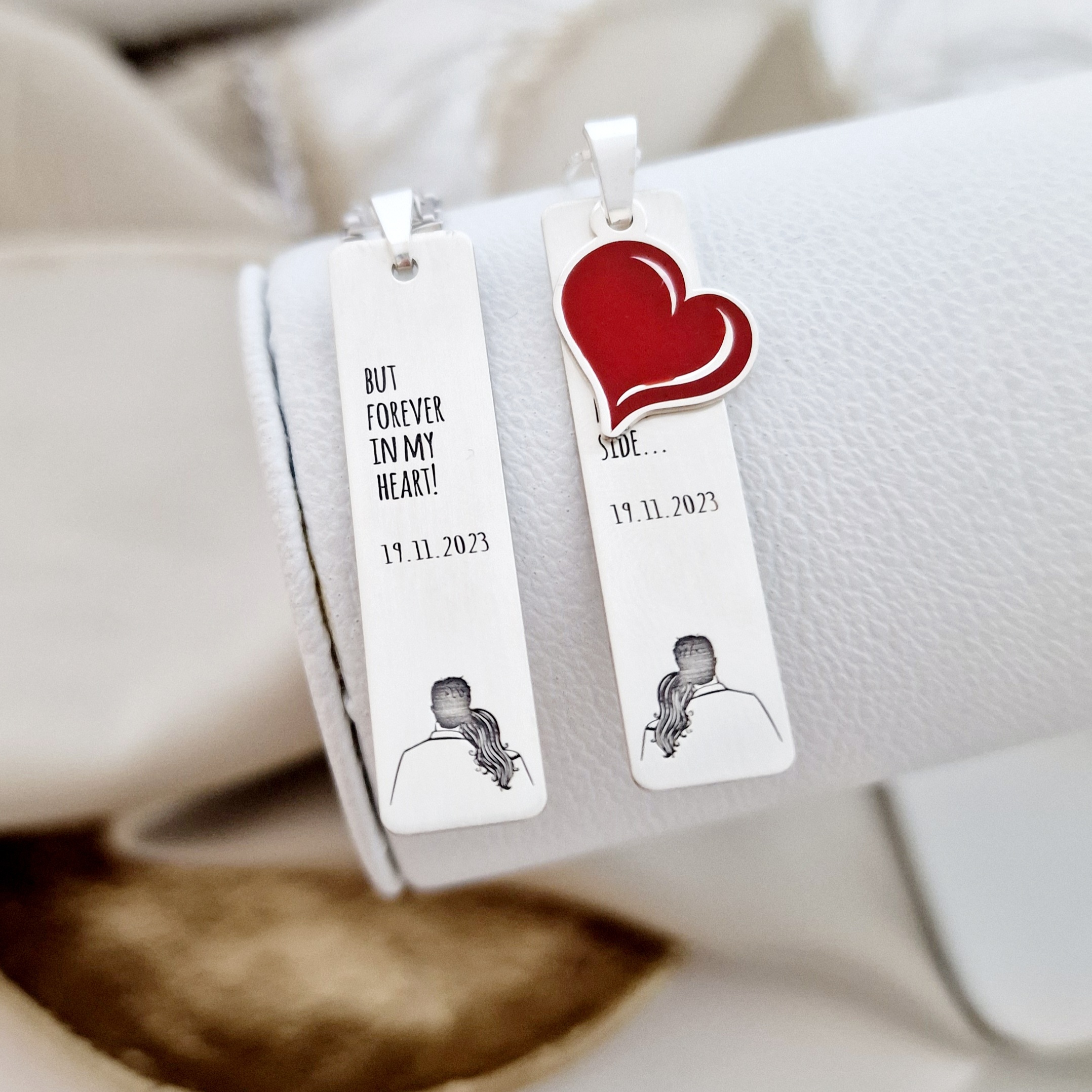 - Pentru Ea: Pandantiv dreptunghiular de 13 x 40 mm atasat de un lantisor de dama de 45 cm + 3 cm prelungire si personalizat cu text si data. Deasupra este adaugat si un pandantiv in forma de inima de 10 x 12 mm, decorata cu email rosu.