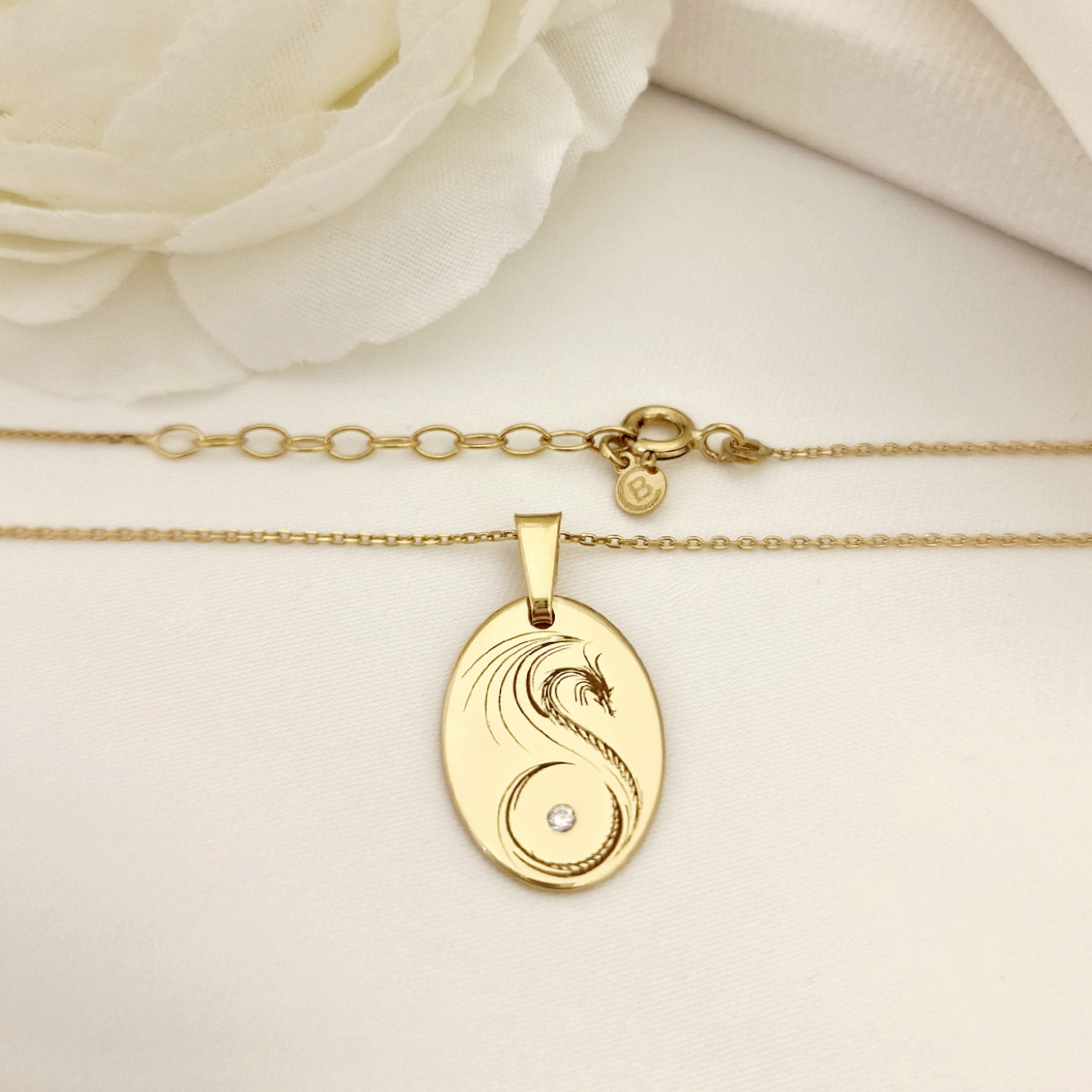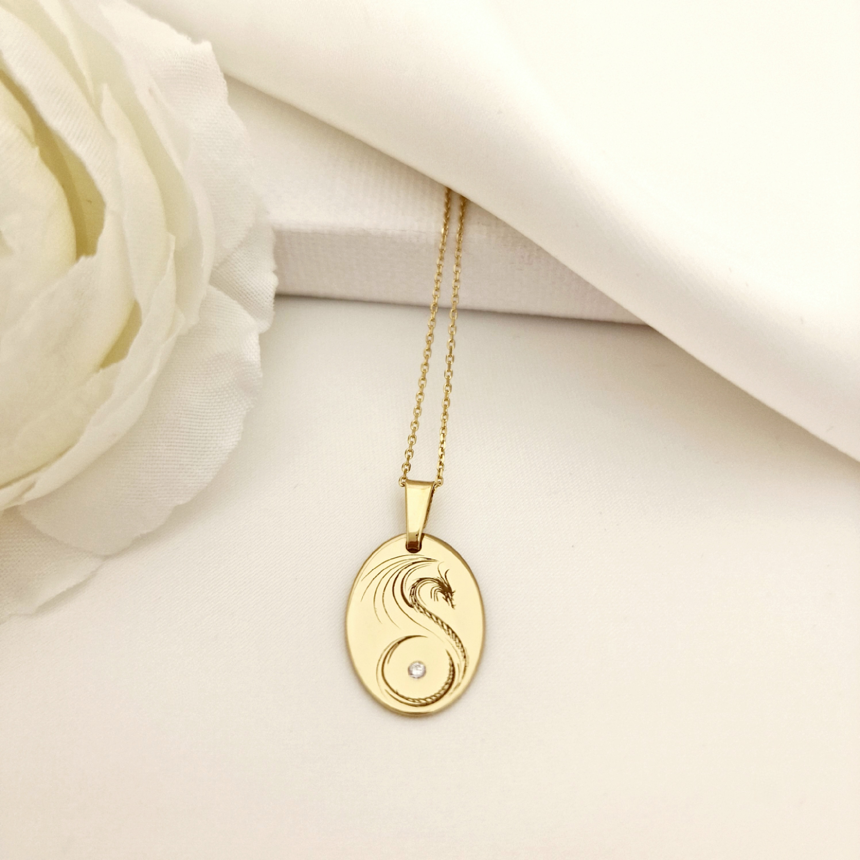 Lantisor Dragon Legendar - Pandantiv oval cu Diamant natural - Aur Galben 14K