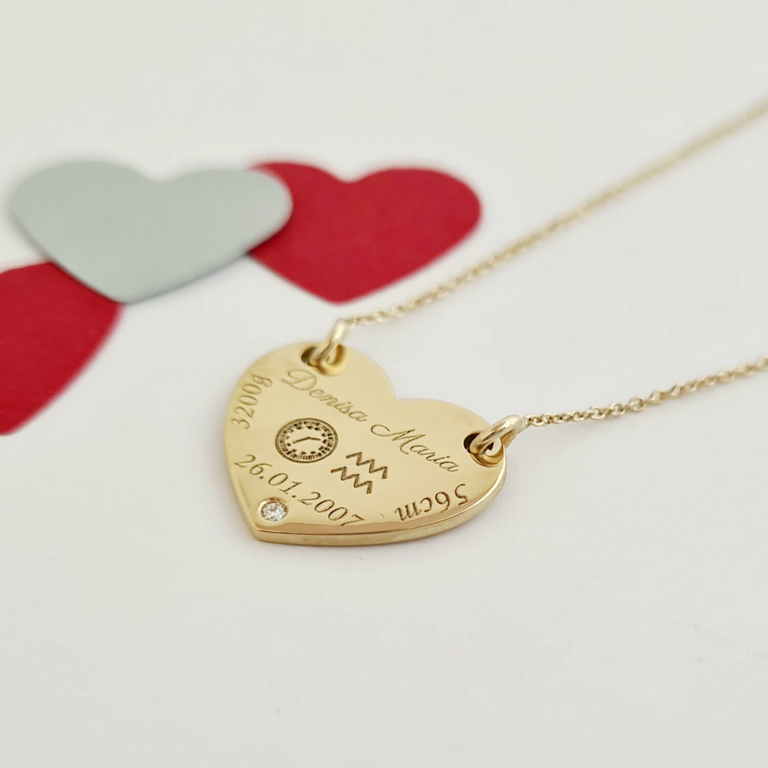 Lantisor personalizat cu Diamant natural - Inima 15 mm - Botez - Aur Galben 14K