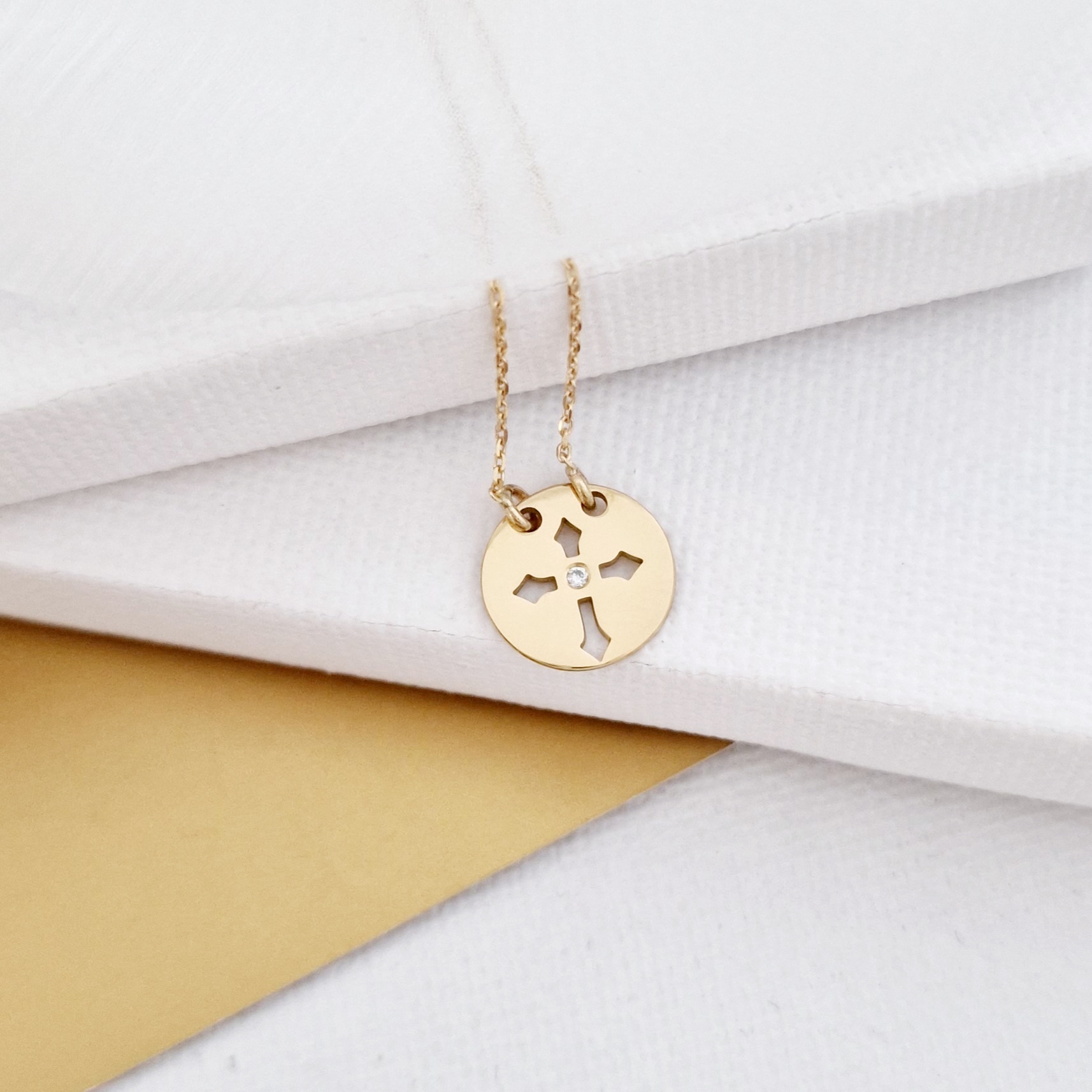 Lantisor personalizat cu Diamant natural - Pandantiv banut cu simbol cruce decupata - Aur Galben 14K