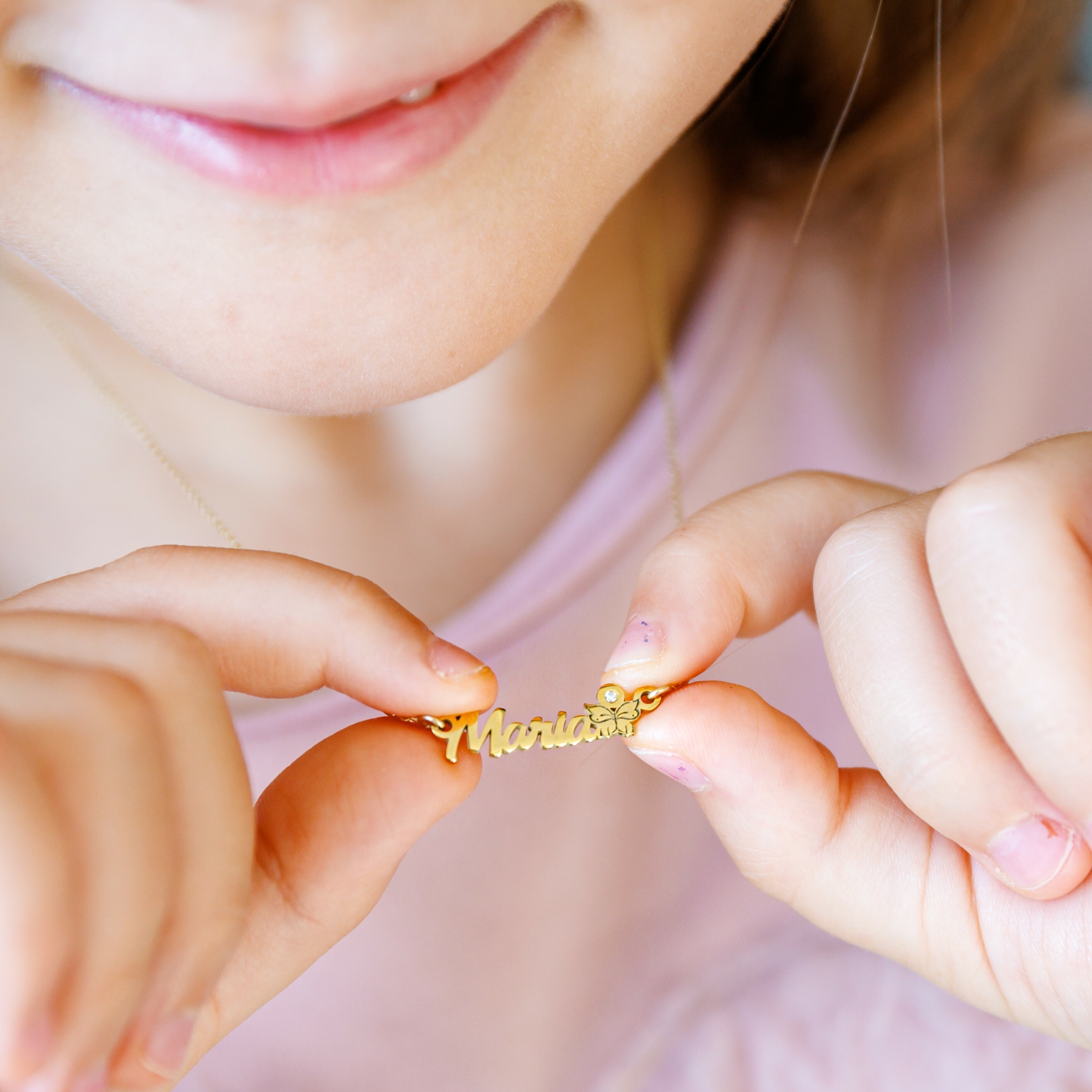 Pentru fetite, recomandam bratari, cercei sau lantisoare delicate cu simboluri precum fluturi, unicorni, pisicute sau cu nume si fundita colorata.