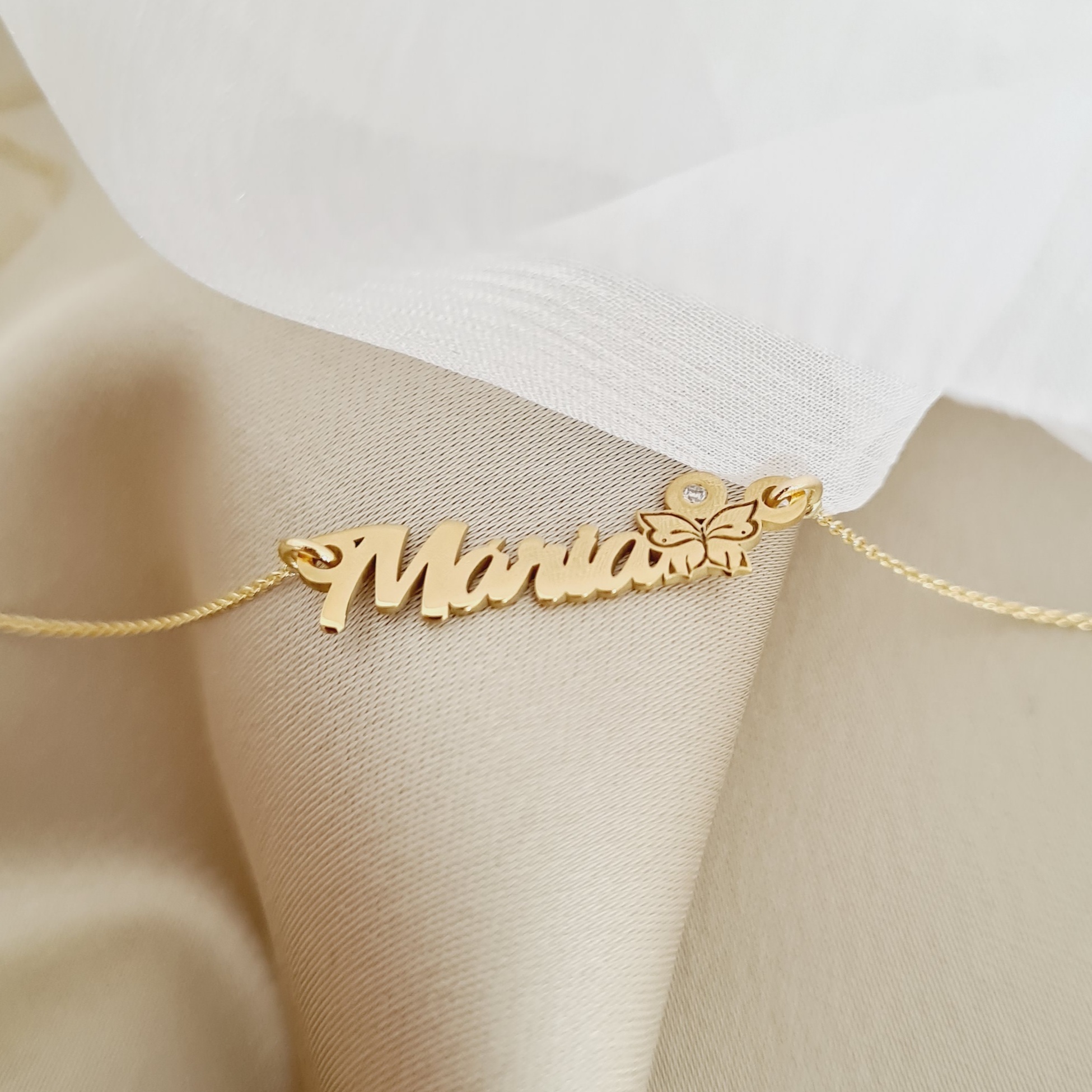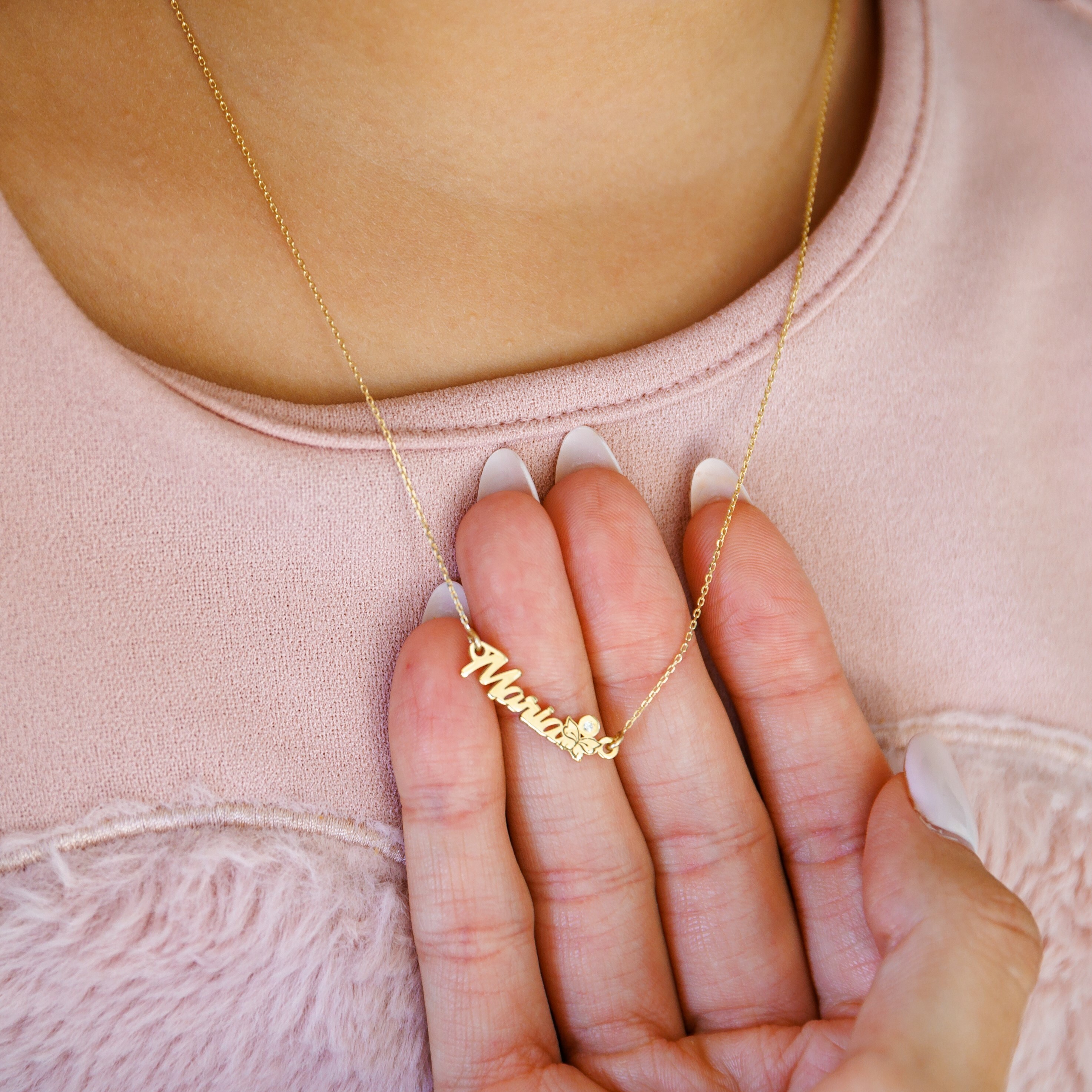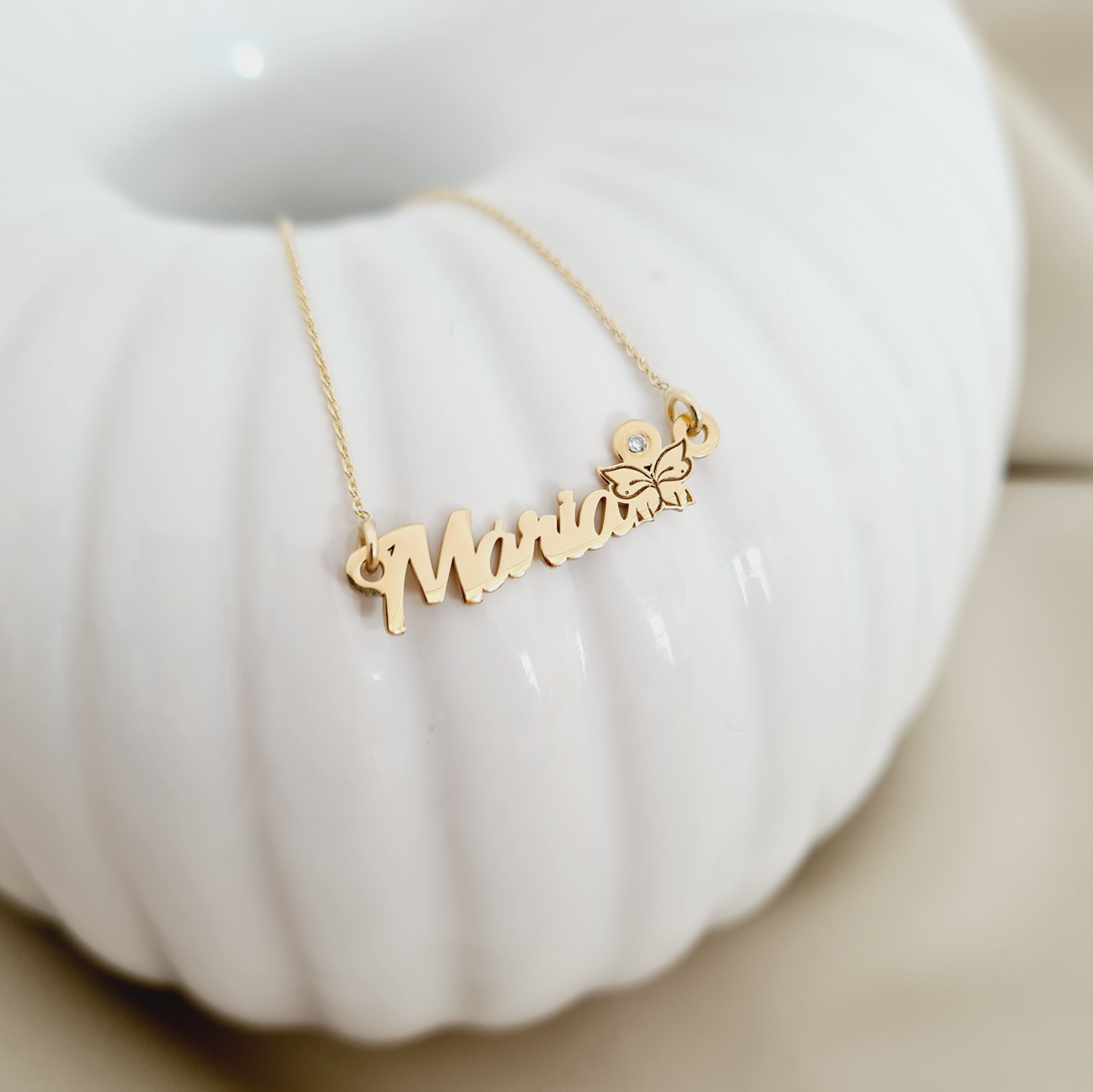 Lantisor personalizat - Nume 5 litere, simbol fluture si Diamant natural - Aur Galben 14 K