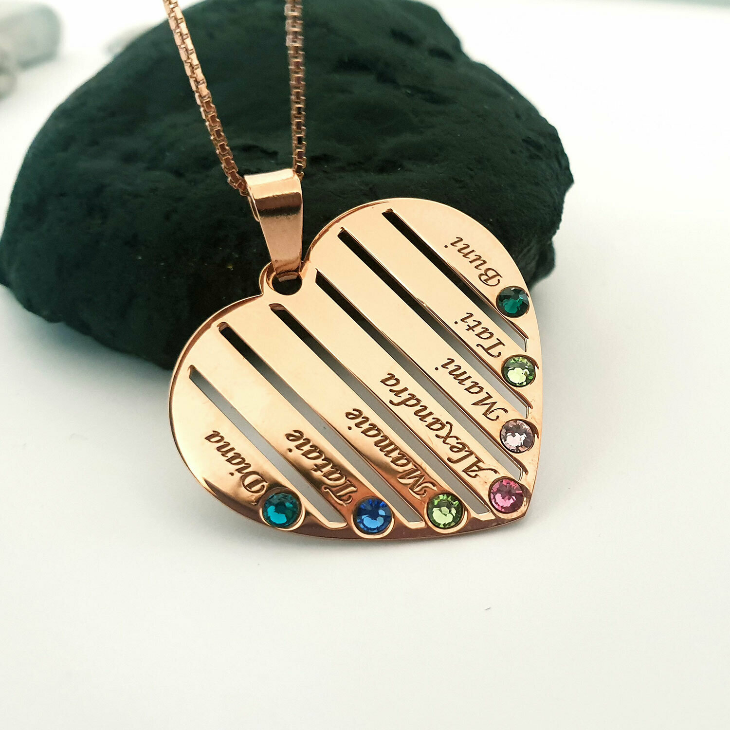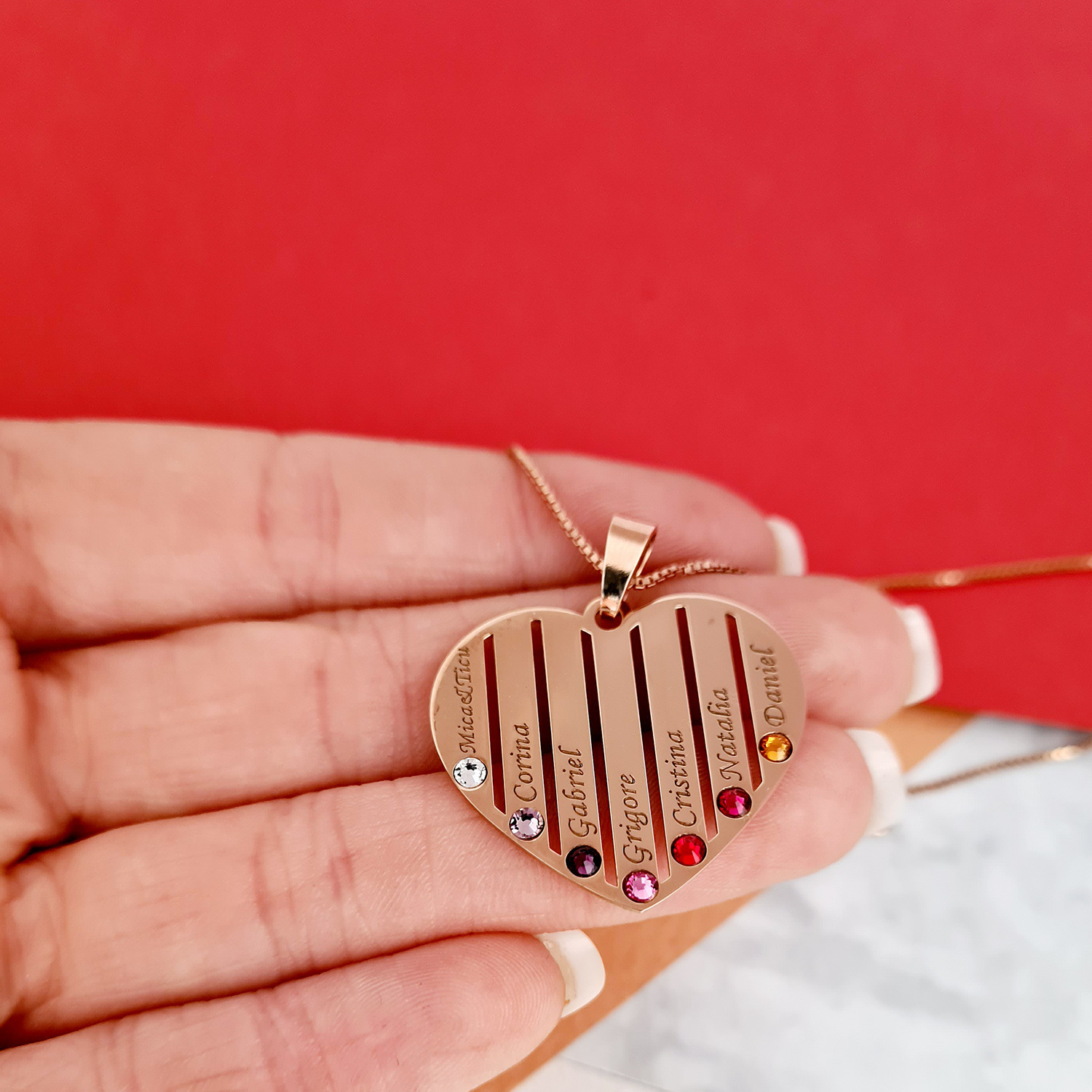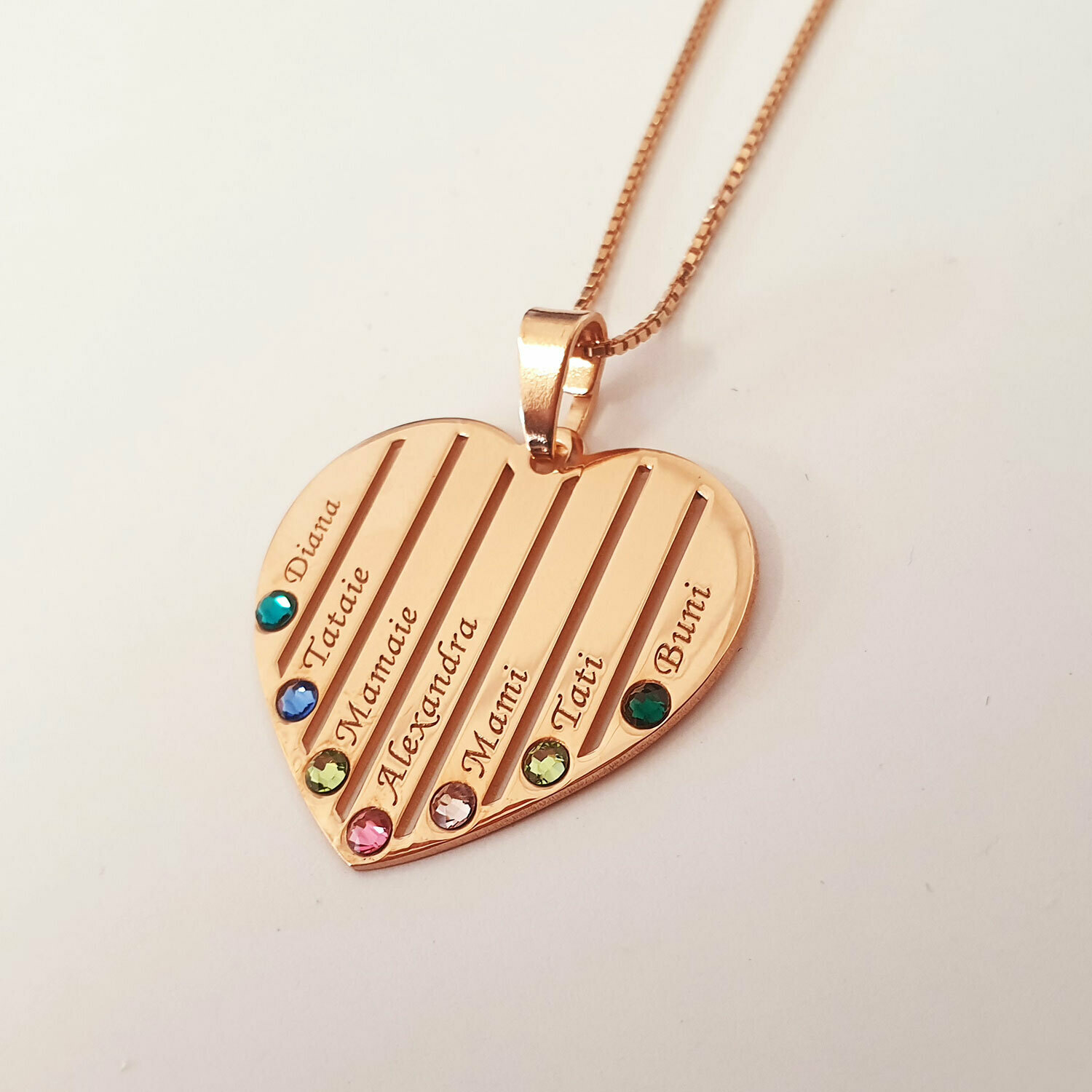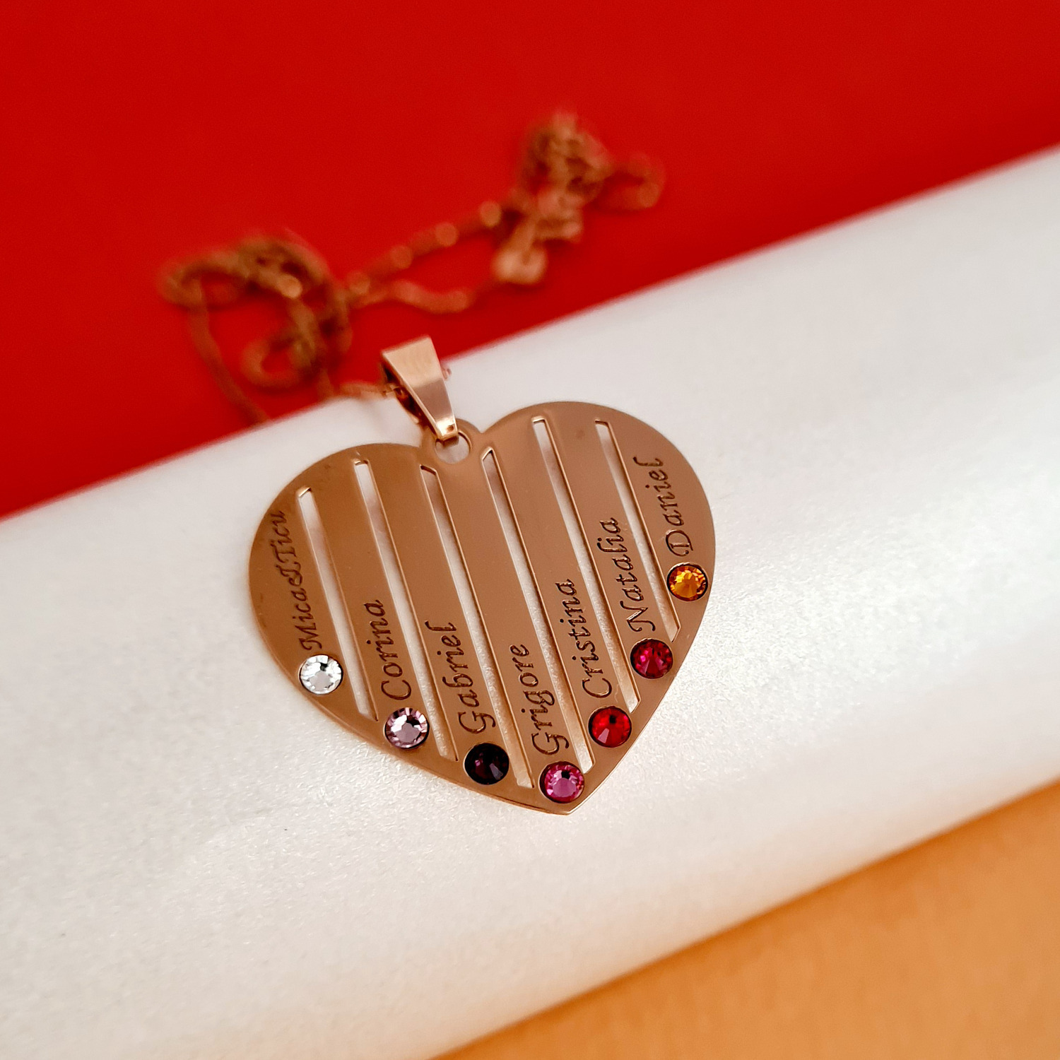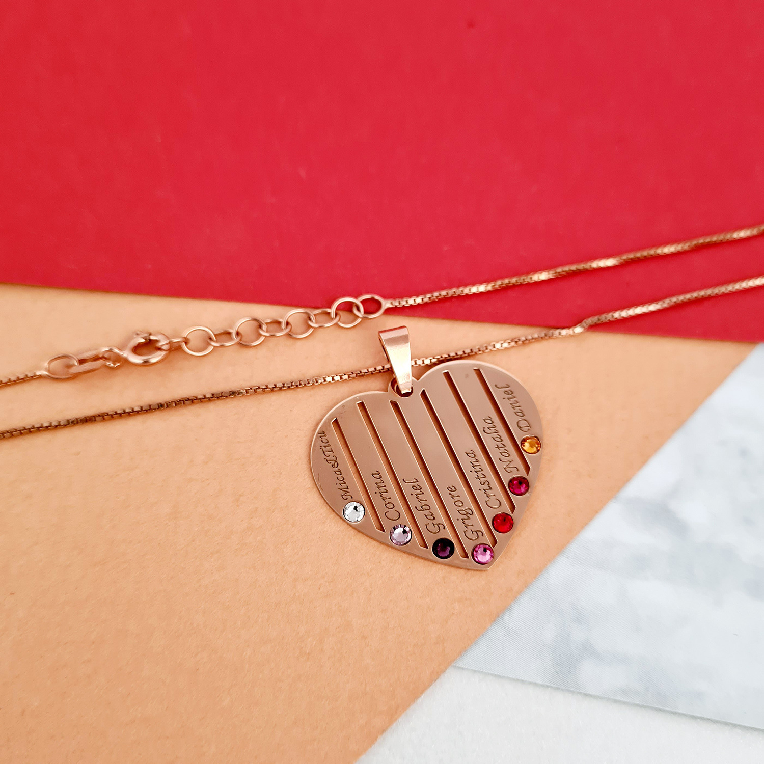 Lantisor Inima familiei - 7 nume si cristale Swarovski - Argint 925 placat cu Aur Roz 18K