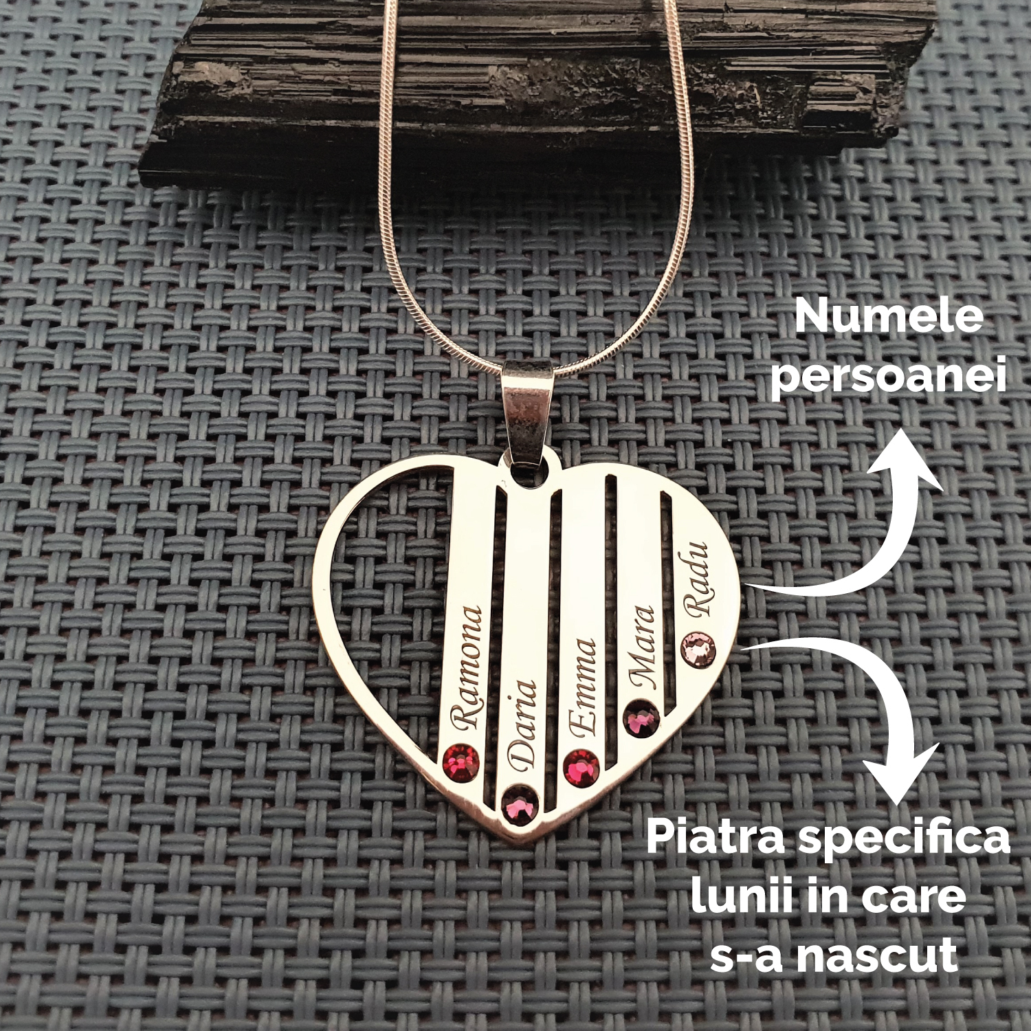 Lantisorul Familie in forma de inima poate fi personalizata cu pana la 7 membri ai familiei tale, pe pandantiv fiind gravate numele acestora si atasate cristale Swarovski in functie de luna nasterii fiecaruia.