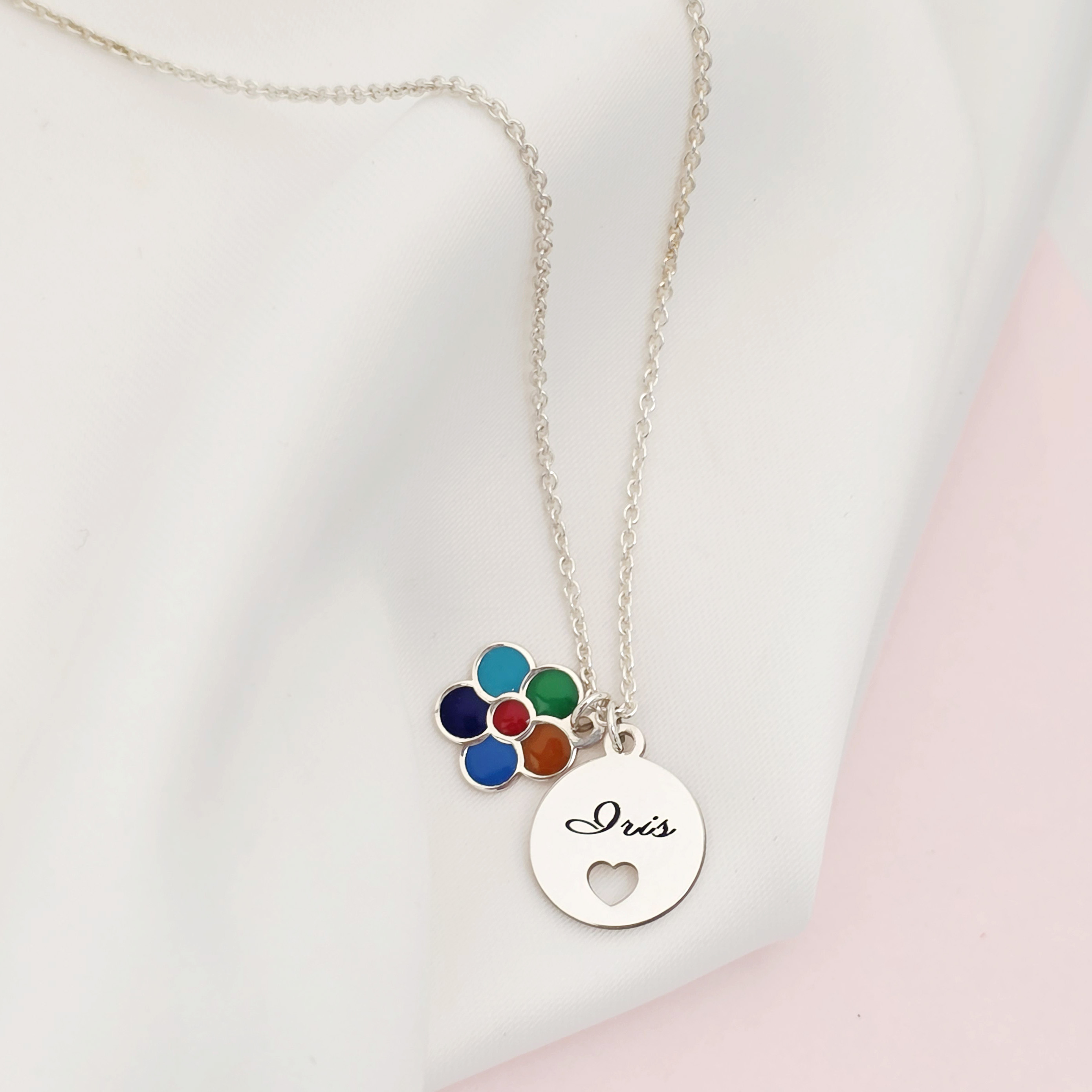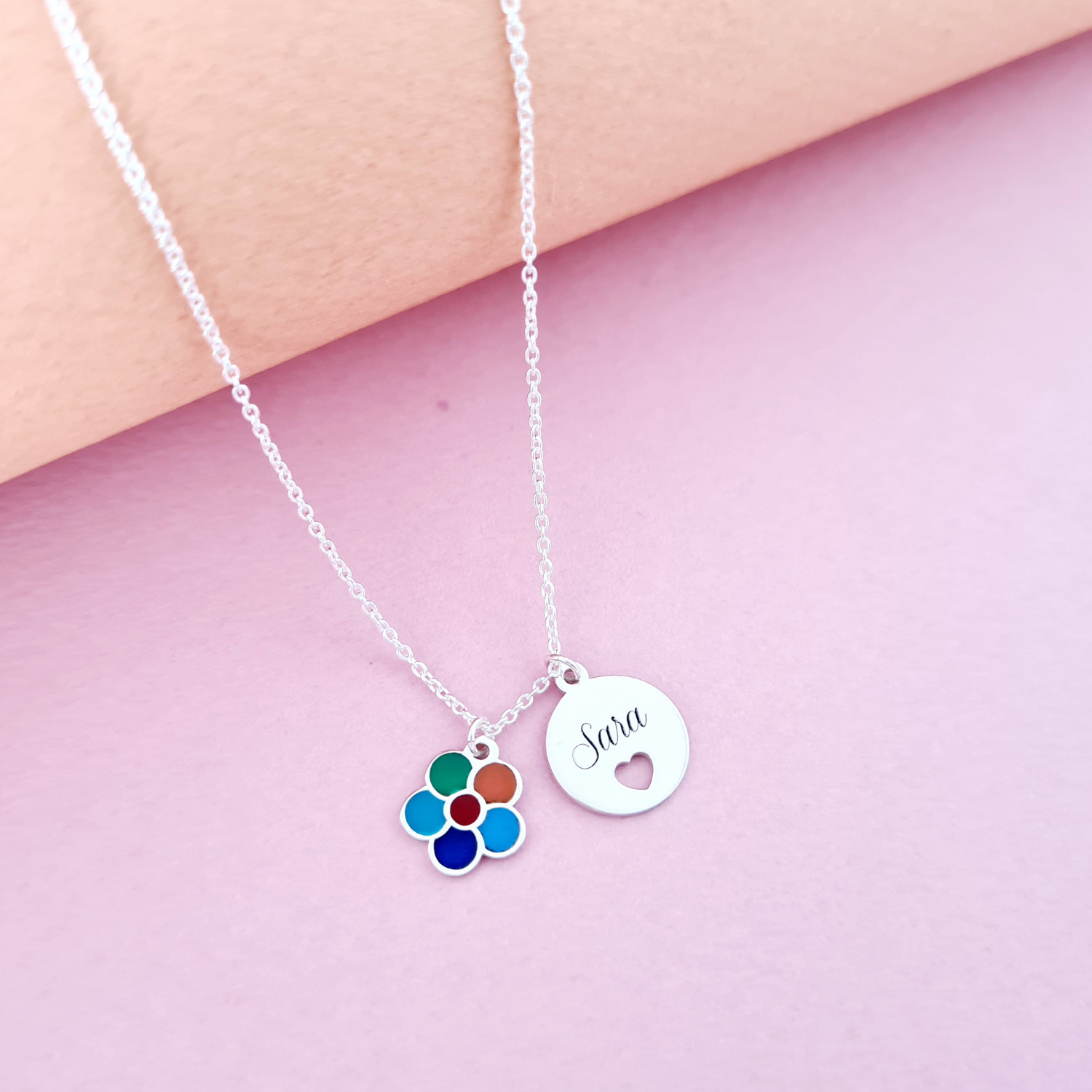 Lantisor personalizat cu 2 pandantive - Floare multicolora cu email - Banut cu nume si inima decupata - Argint 925