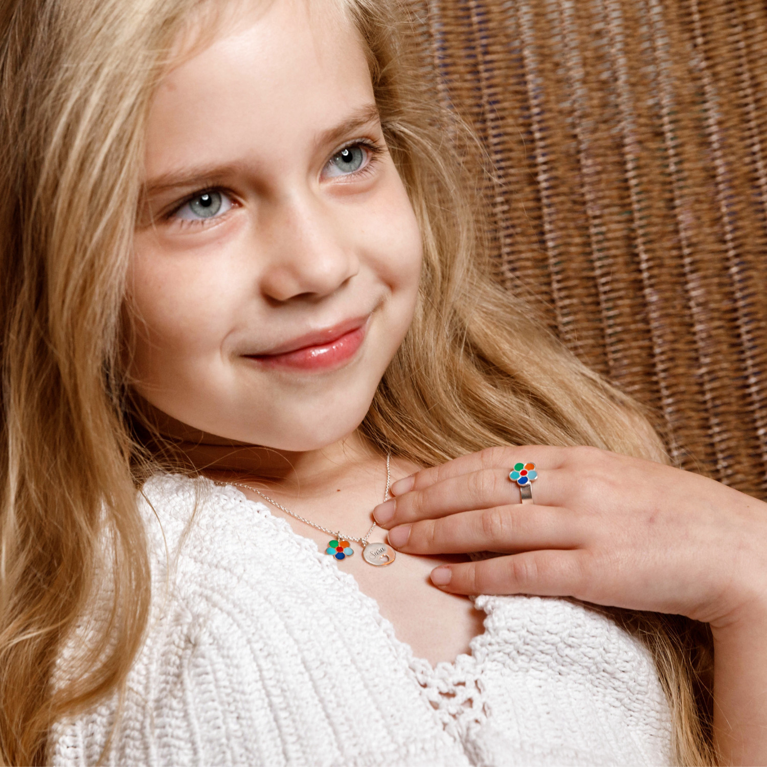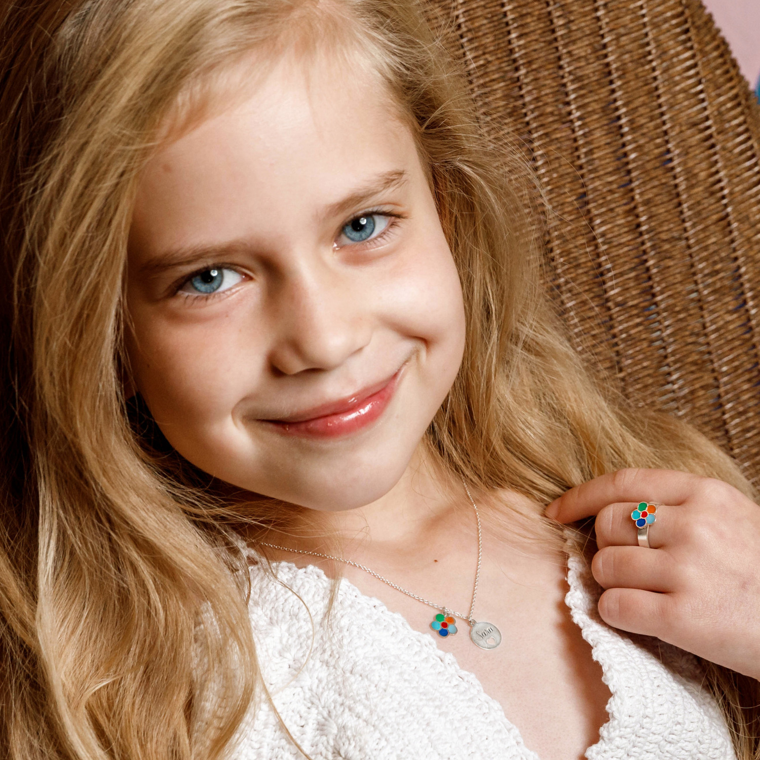 Urmariti-i cum i se va lumina privirea cand va deschide cutia chic si va gasi colierul nostru pentru copii! Pe langa numele ei, pe care bijutierii nostri il vor grava pe pandantivul banut cu inima decupata, lantisorului i se adauga si un pandantiv floare multicolora.