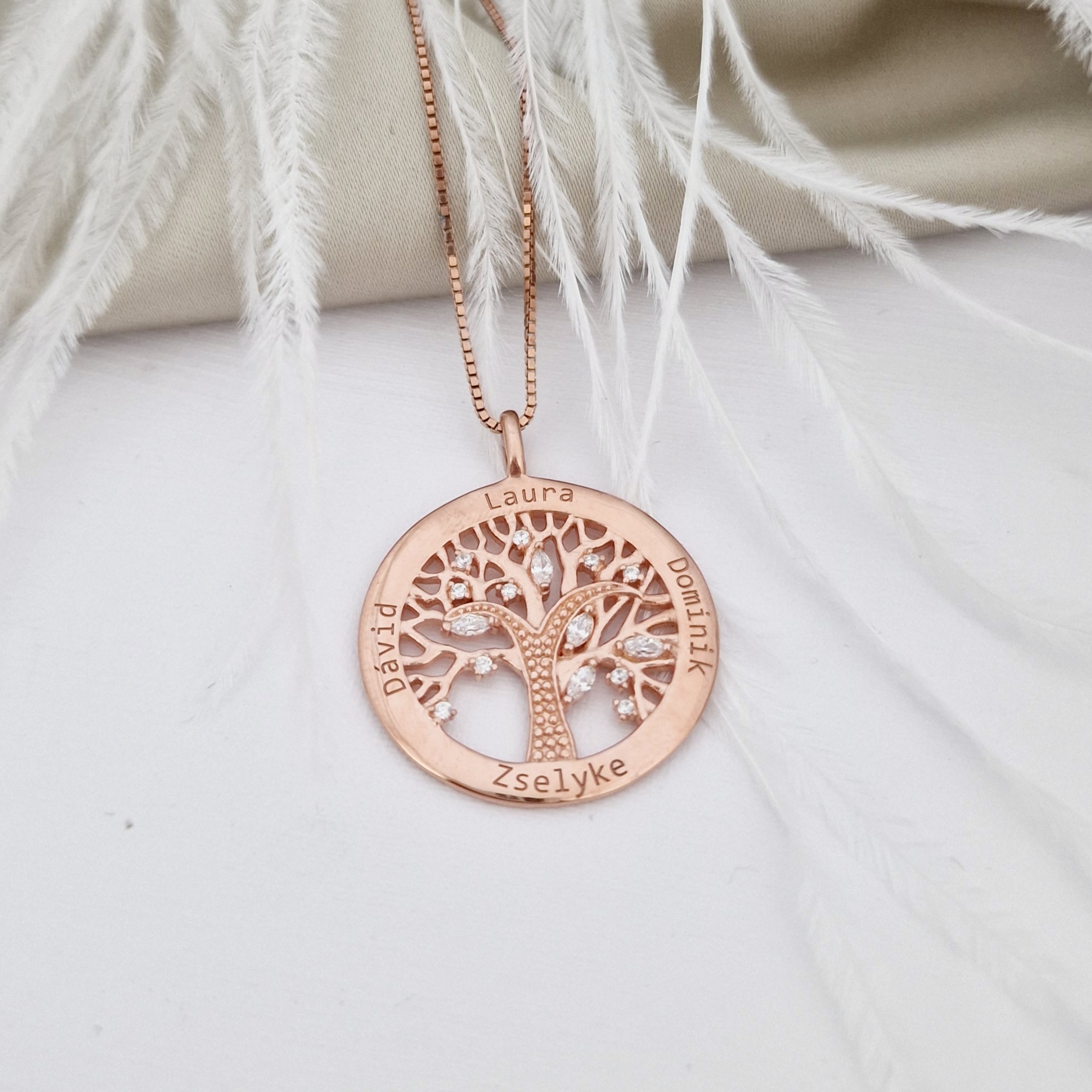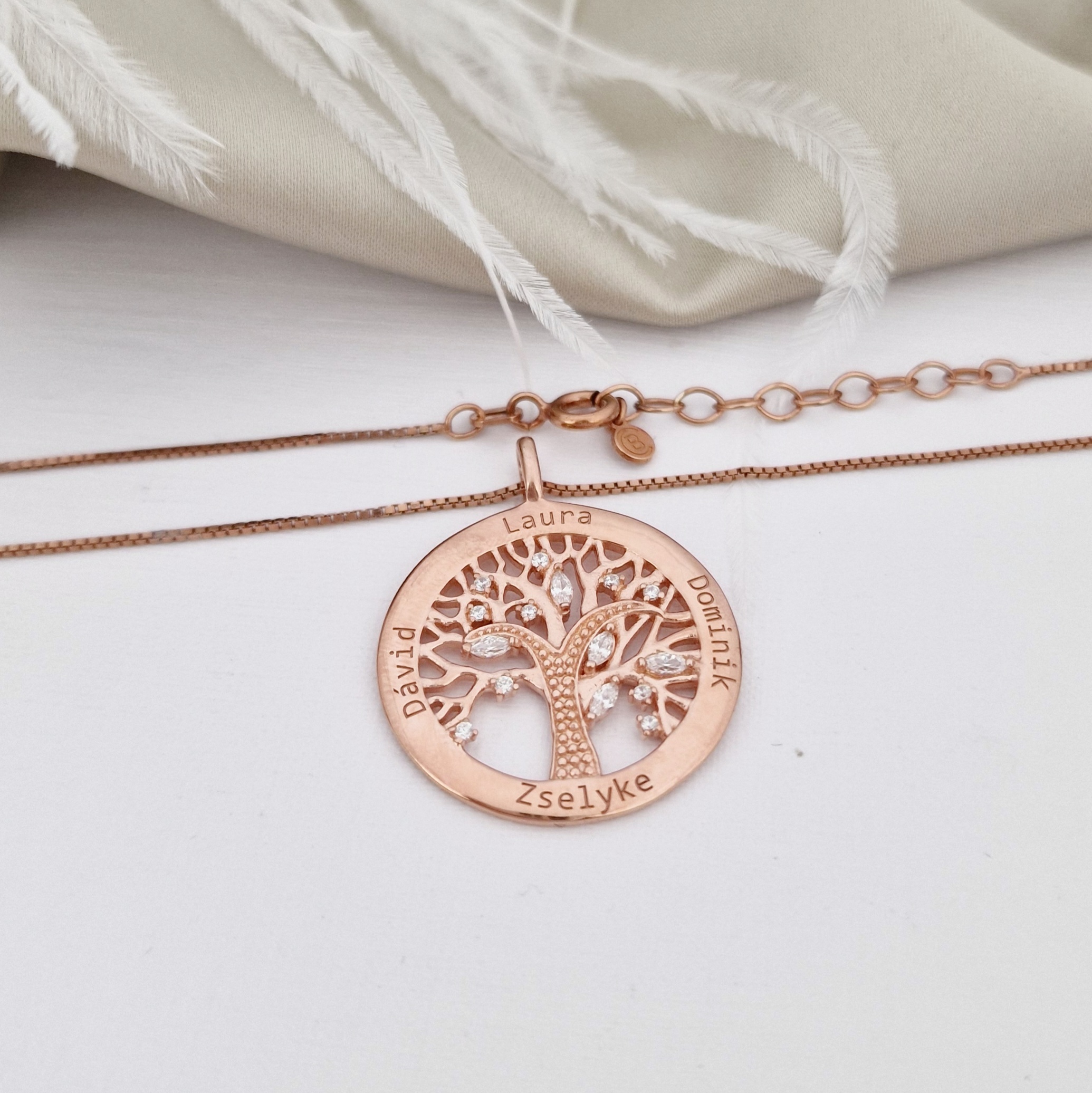 Lantisor personalizat cu nume - Copacul Vietii decorat cu Zirconii albe - Argint 925 placat cu Aur Roz 18K