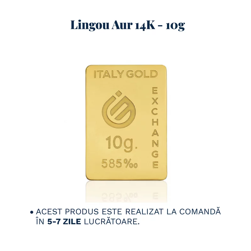 Transforma un moment special intr-o amintire de nepretuit cu lingoul de Aur 14K de 10g (titlu 585), certificat „Italy Gold Exchange”. Oferind un echilibru perfect intre rafinament, siguranta si valoare, acest lingou este alegerea ideala pentru un cadou exclusivist, o investitie inteligenta sau un simbol al prosperitatii transmise din generatie in generatie.