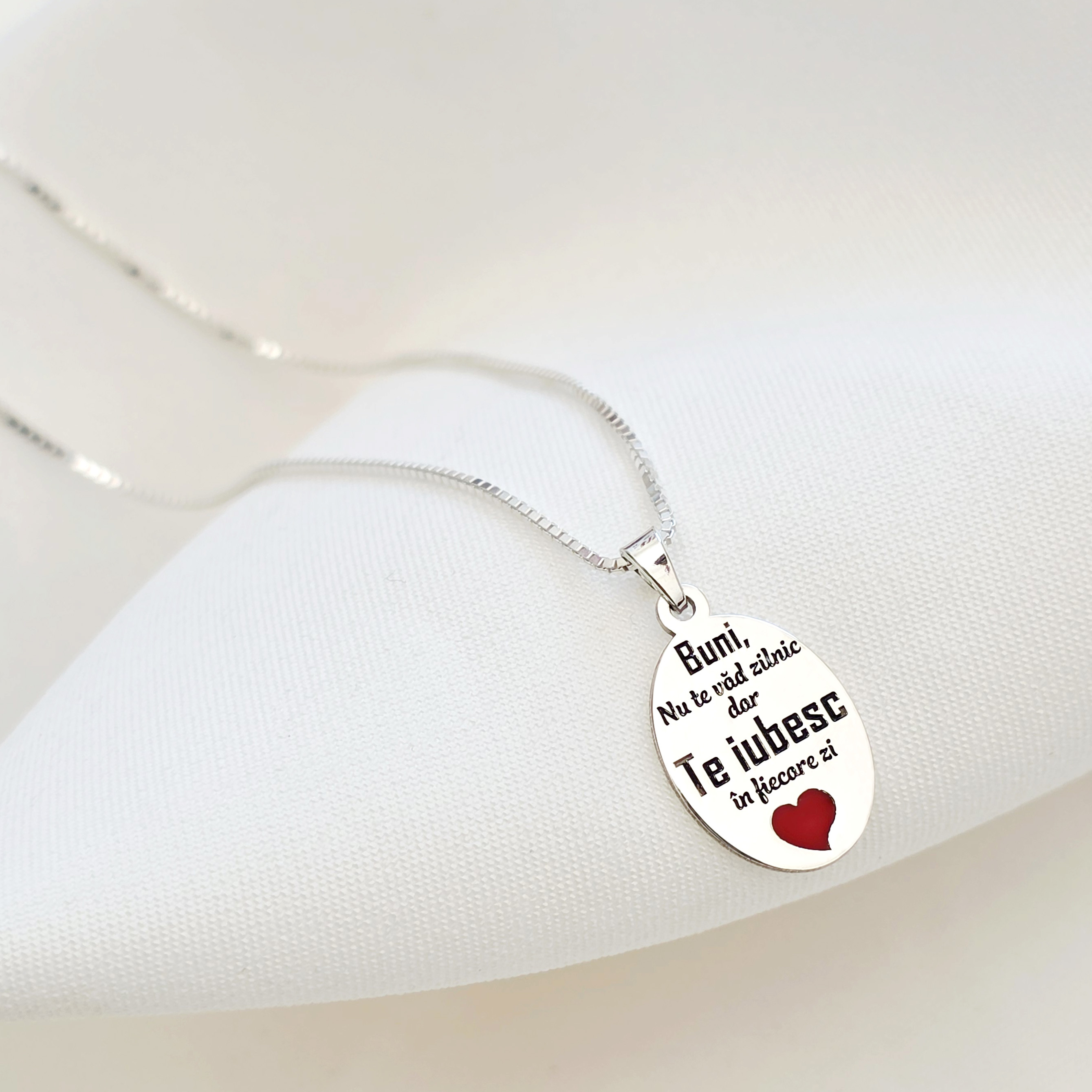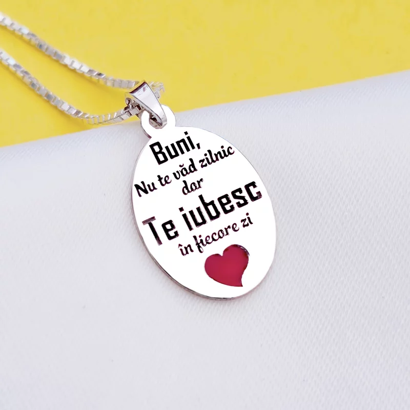 Lantisor cu pandantiv Bunica - Te iubesc in fiecare zi - Model oval 15 mm cu inima cu email rosu - Argint 925