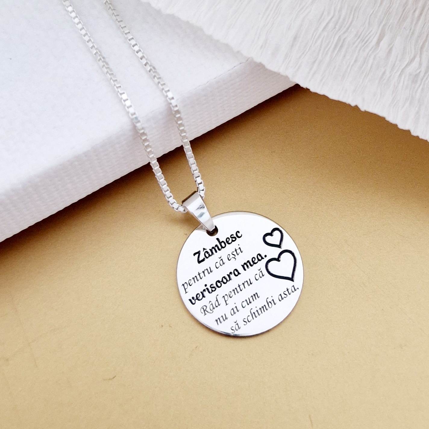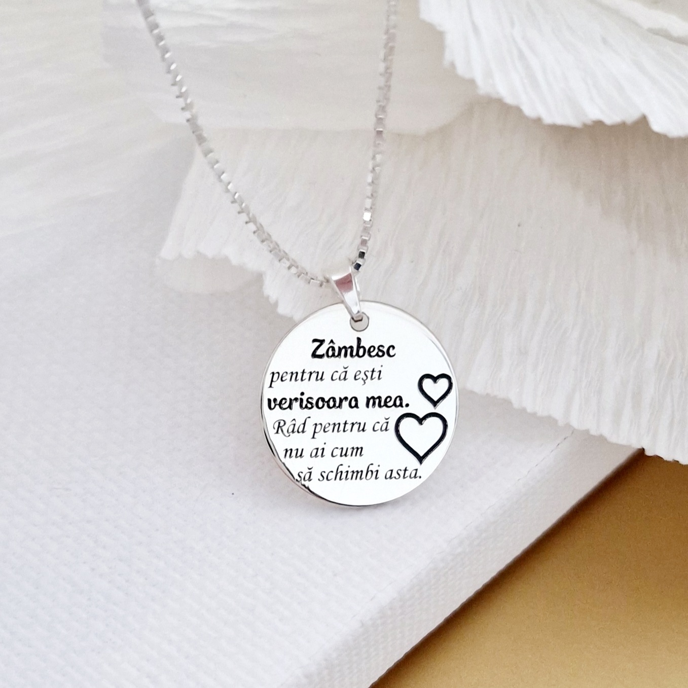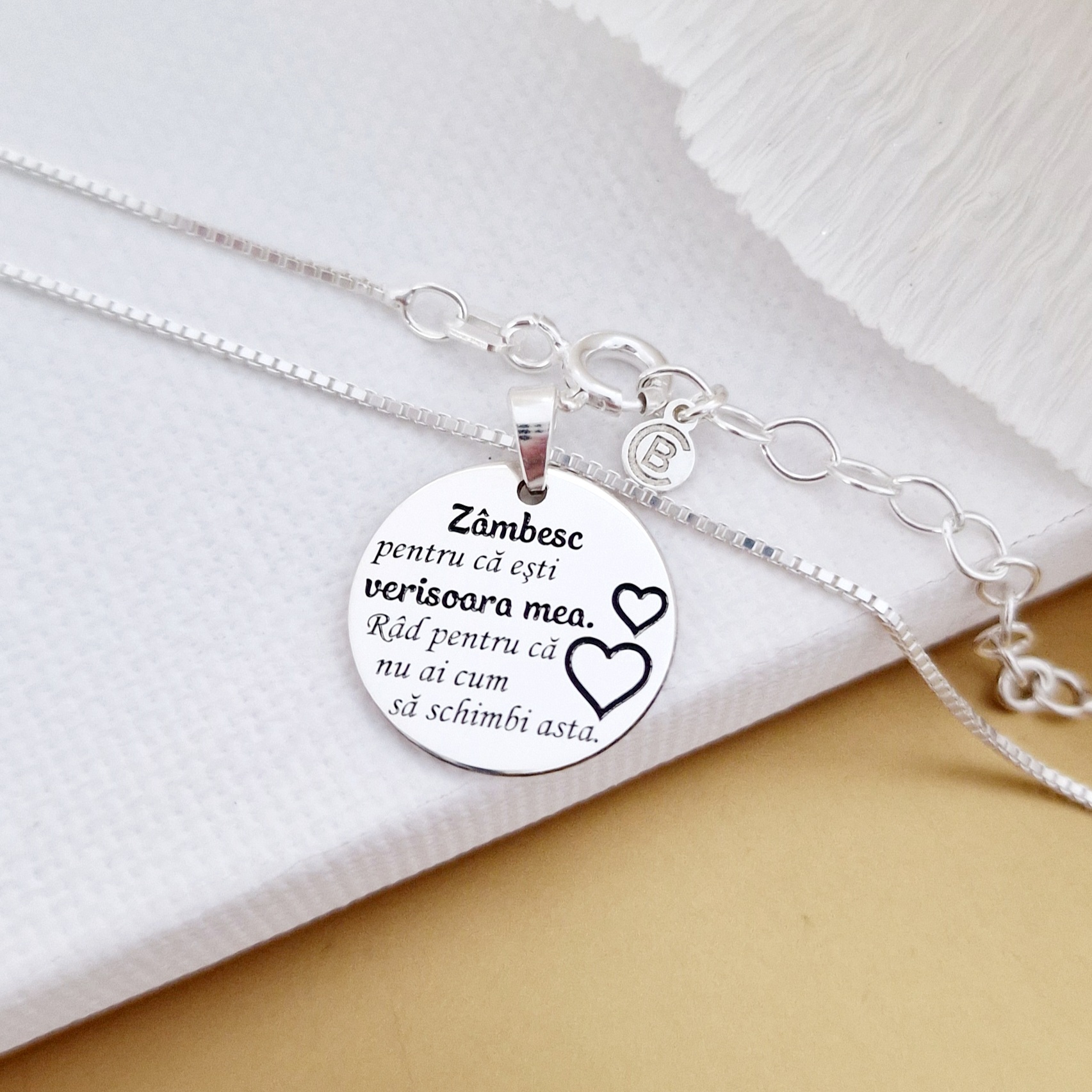 Lantisor cu pandantiv Verisoara mea - Model banut 15 mm cu inimi gravate - Argint 925