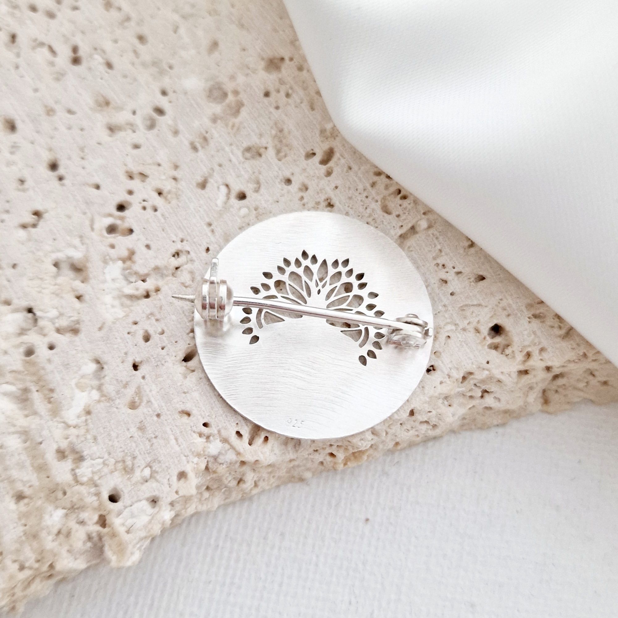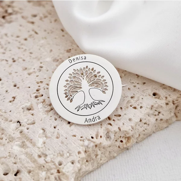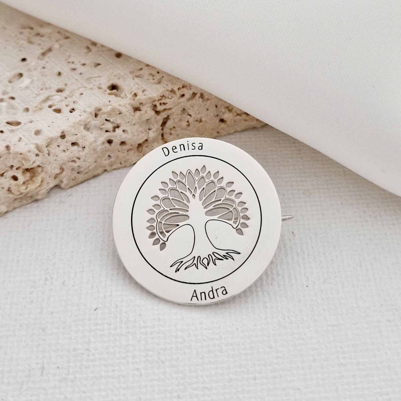 Brosa personalizata cu ac - Copacul vietii inconjurat de un text special - Argint 925