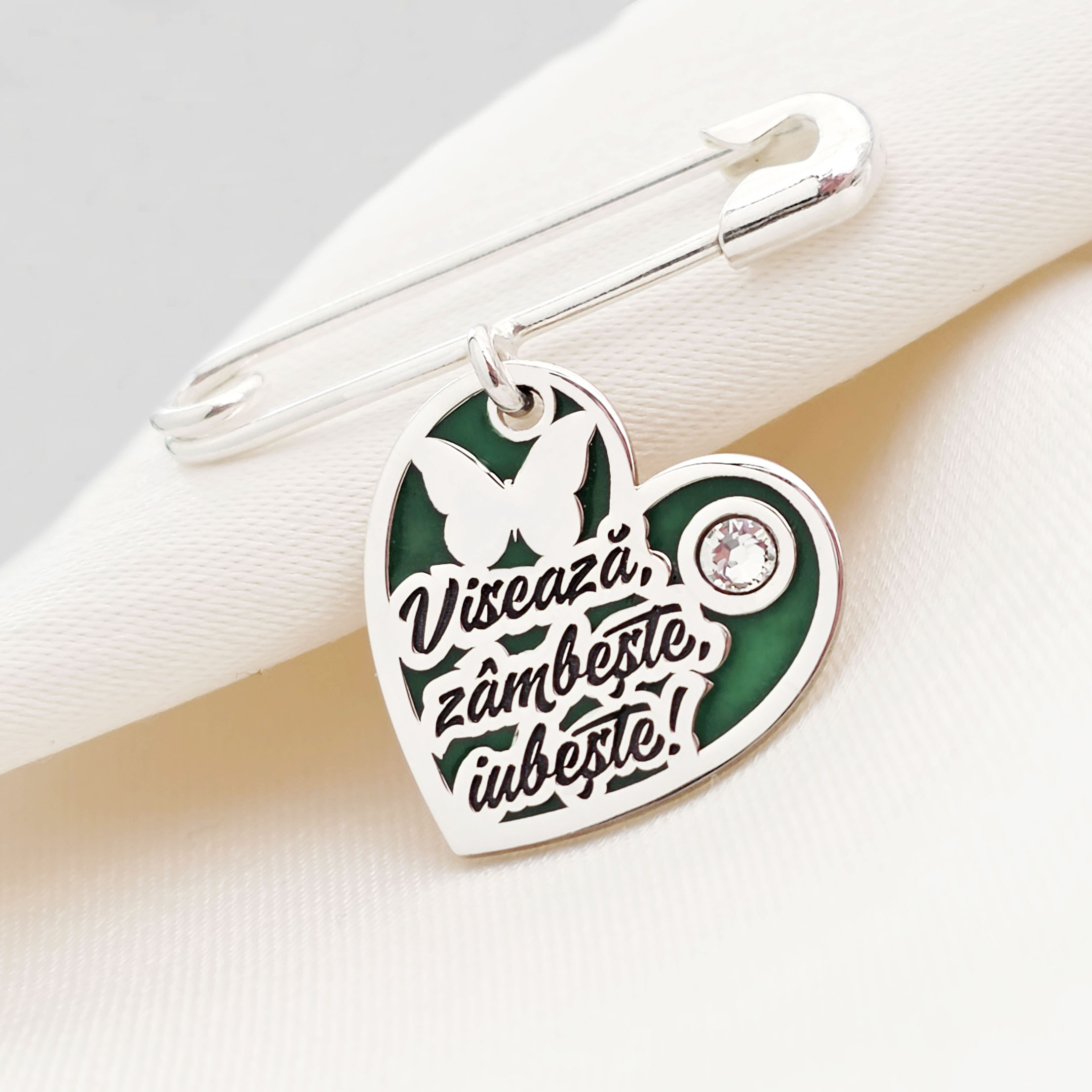 Brosa Ac de siguranta - Inima cu Zambete – Text personalizat - Argint 925 - Email verde & Cristal Swarovski
