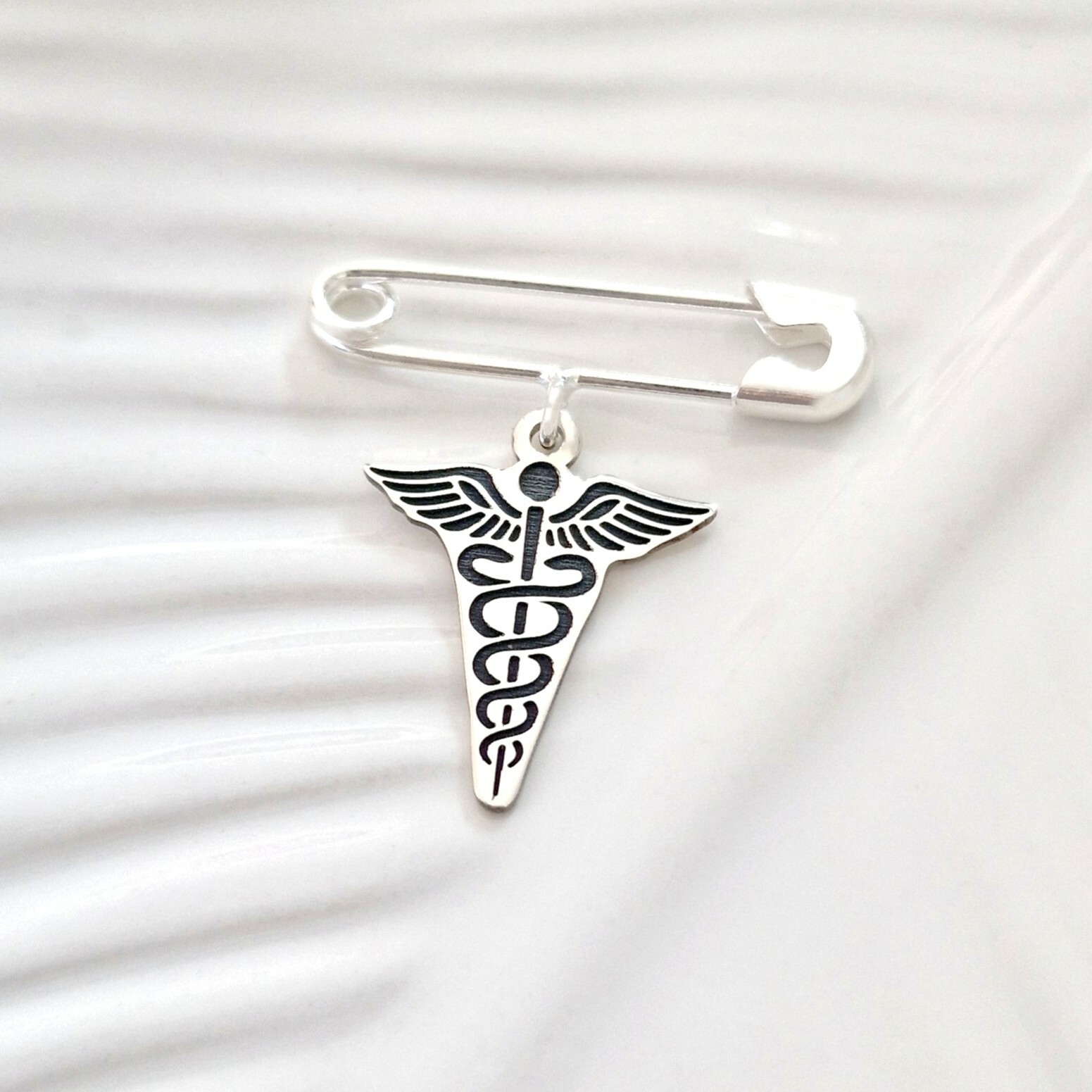 Această broșă fin lucrată, sub formă de ac de siguranță, este realizată din Argint 925 și are ca pandantiv simbolul Caduceus – reprezentarea universală a medicinei. Elegantă și discretă, este un accesoriu cu încărcătură simbolică, ideal pentru medici, asistente sau studenți la medicină. Un cadou special care îmbină rafinamentul cu recunoașterea unei vocații nobile.