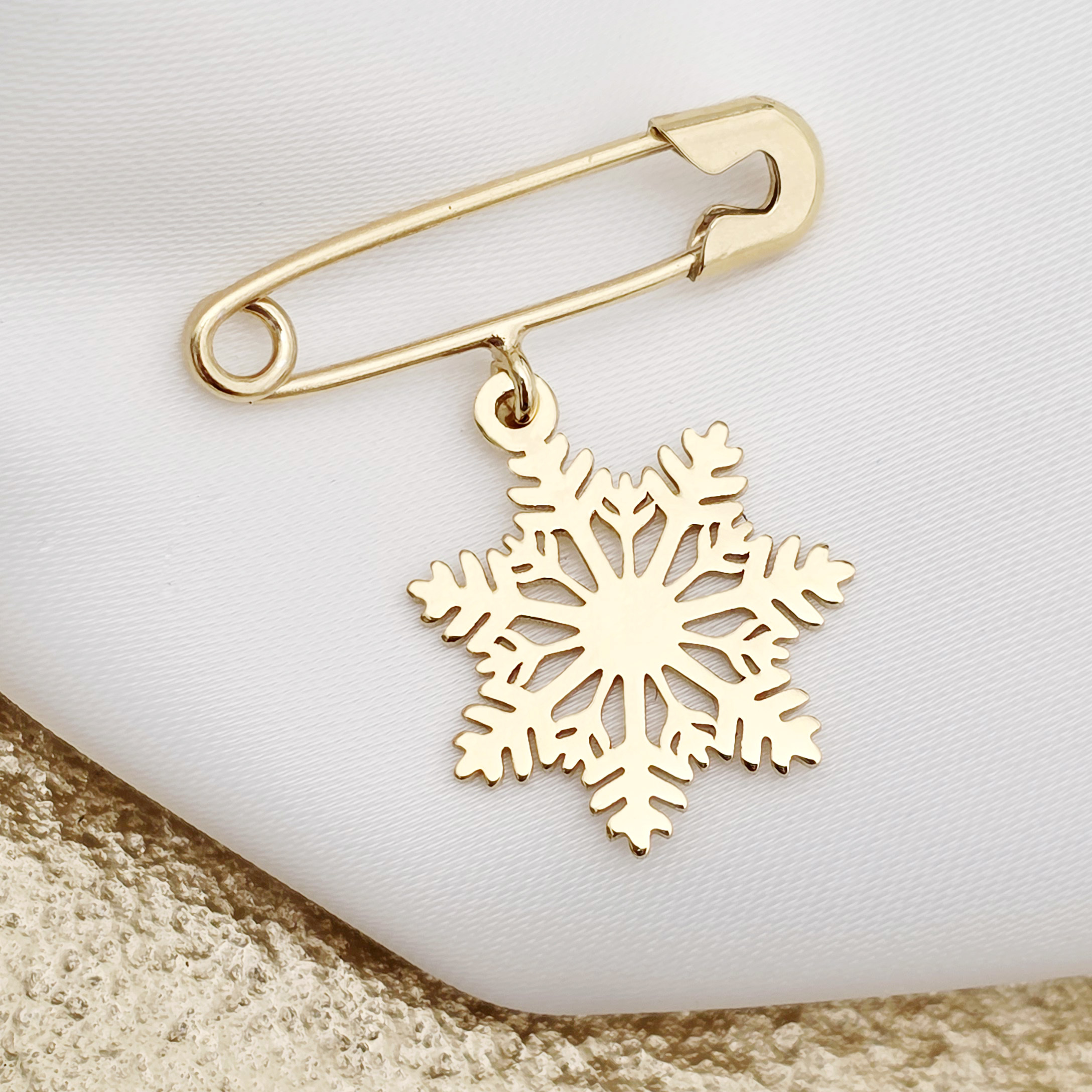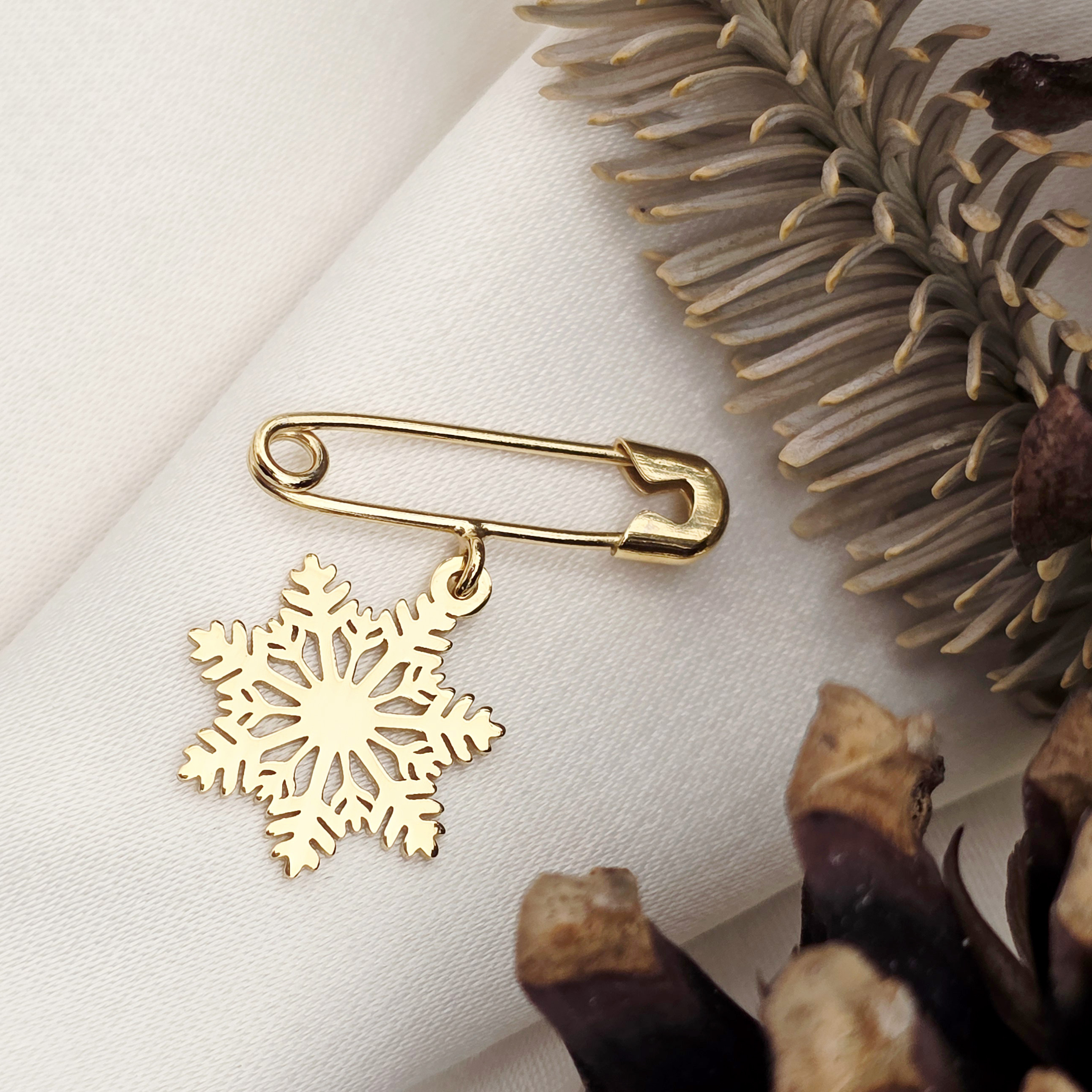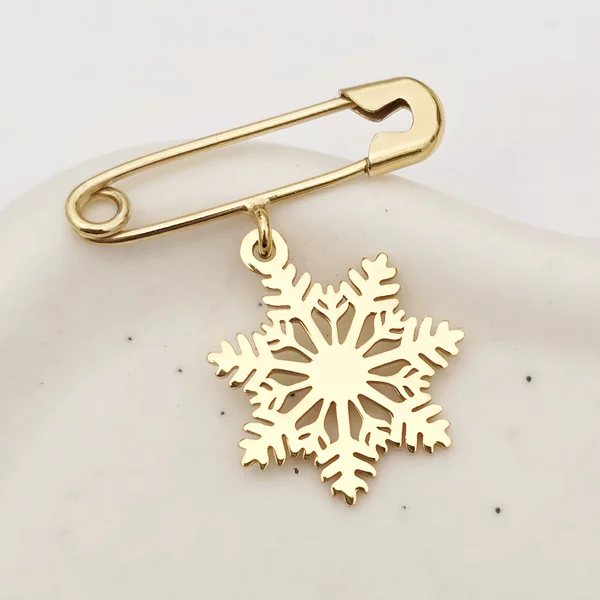 Această broșă sofisticată este realizată din Argint 925 de înaltă calitate și placată cu un strat fin de Aur Galben 18K, oferindu-i o strălucire caldă și rafinată. Pandantivul în formă de fulg de nea adaugă o notă delicată și feminină, perfectă pentru a completa ținutele de zi sau de seară. Designul în formă de ac de siguranță face broșa ușor de purtat și extrem de versatilă, potrivită pentru paltoane, eșarfe sau genți.
